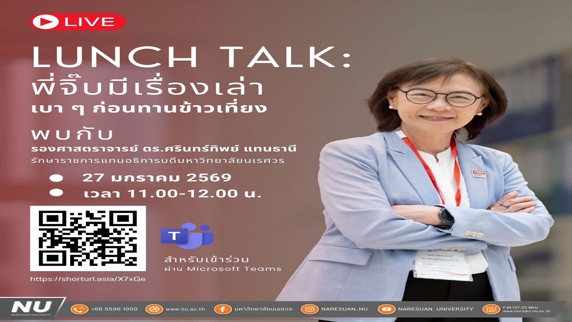 ขอเชิญประชาคมมหาวิทยาลัยนเรศวรเข้าร่วมกิจกรรมออนไลน์ พบกับกิจกรรม LUNCH TALK: พี่จิ๊บมีเรื่องเล่าเบา ๆ ก่อนทานข้าวเที่ยง