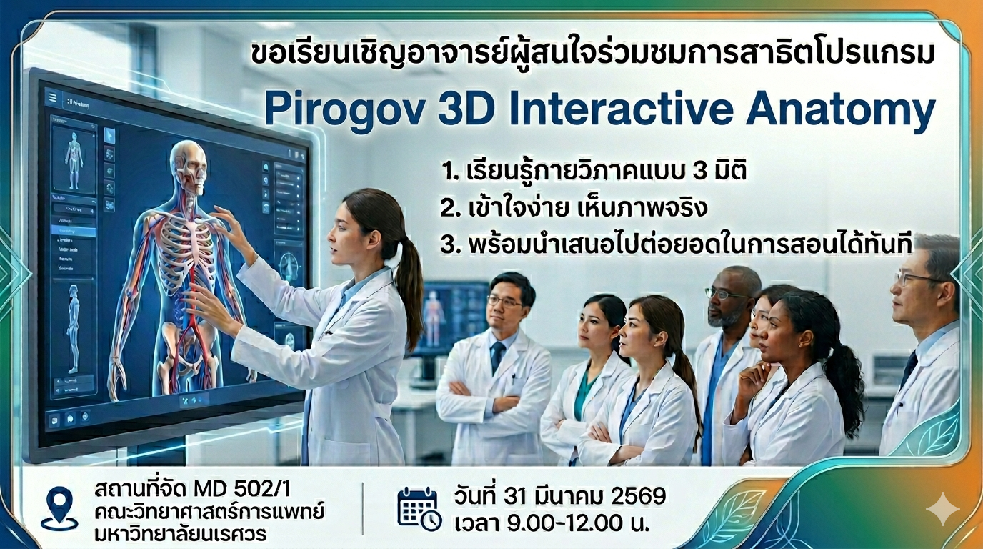 ขอเรียนเชิญอาจารย์ผู้สนใจร่วมชมการสาธิตโปรแกรม Pirogov 3D Anatomy เรียนรู้กายวิภาคแบบ 3 มิติ เข้าใจง่าย เห็นภาพจริง พร้อมนำเสนอไปต่อยอดในการสอนได้ทันที