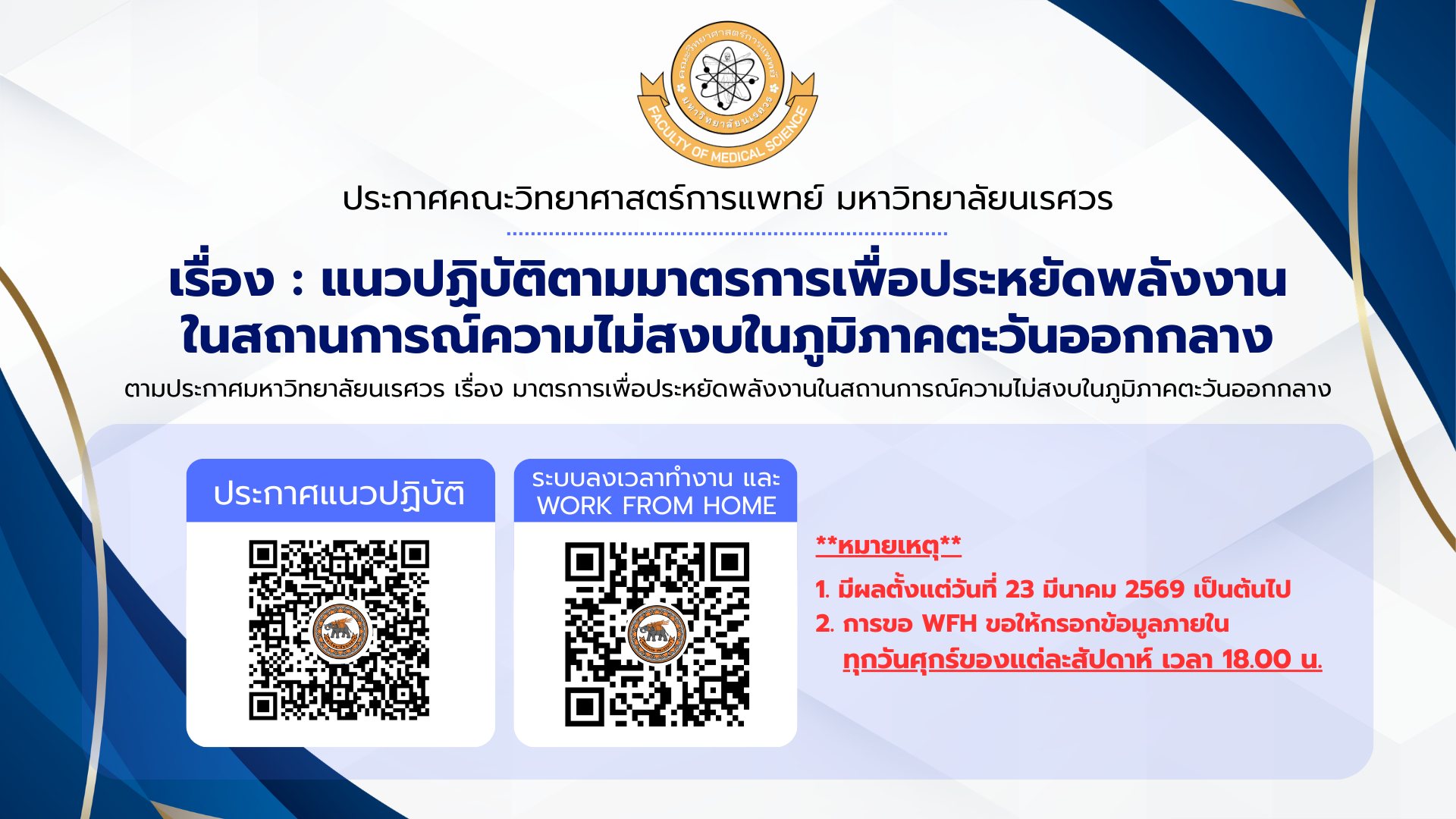ประกาศคณะวิทยาศาสตร์การแพทย์ มหาวิทยาลัยนเรศวร เรื่อง : แนวปฏิบัติตามมาตรการเพื่อประหยัดพลังงานในสถานการณ์ความไม่สงบในภูมิภาคตะวันออกกลาง