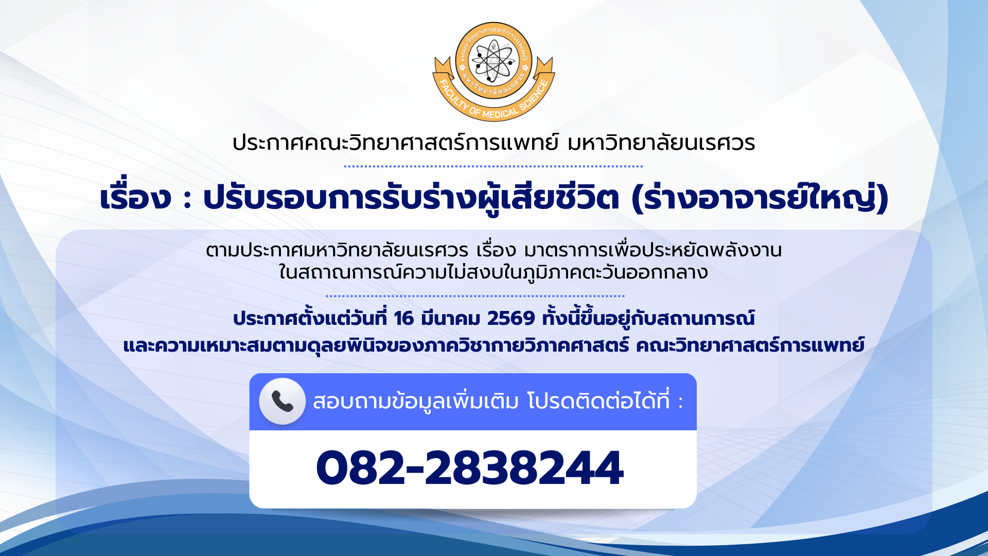 ประกาศคณะวิทยาศาสตร์การแพทย์ มหาวิทยาลัยนเรศวร เรื่อง : ปรับรอบการรับร่างผู้เสียชีวิต (ร่างอาจารย์ใหญ่)
