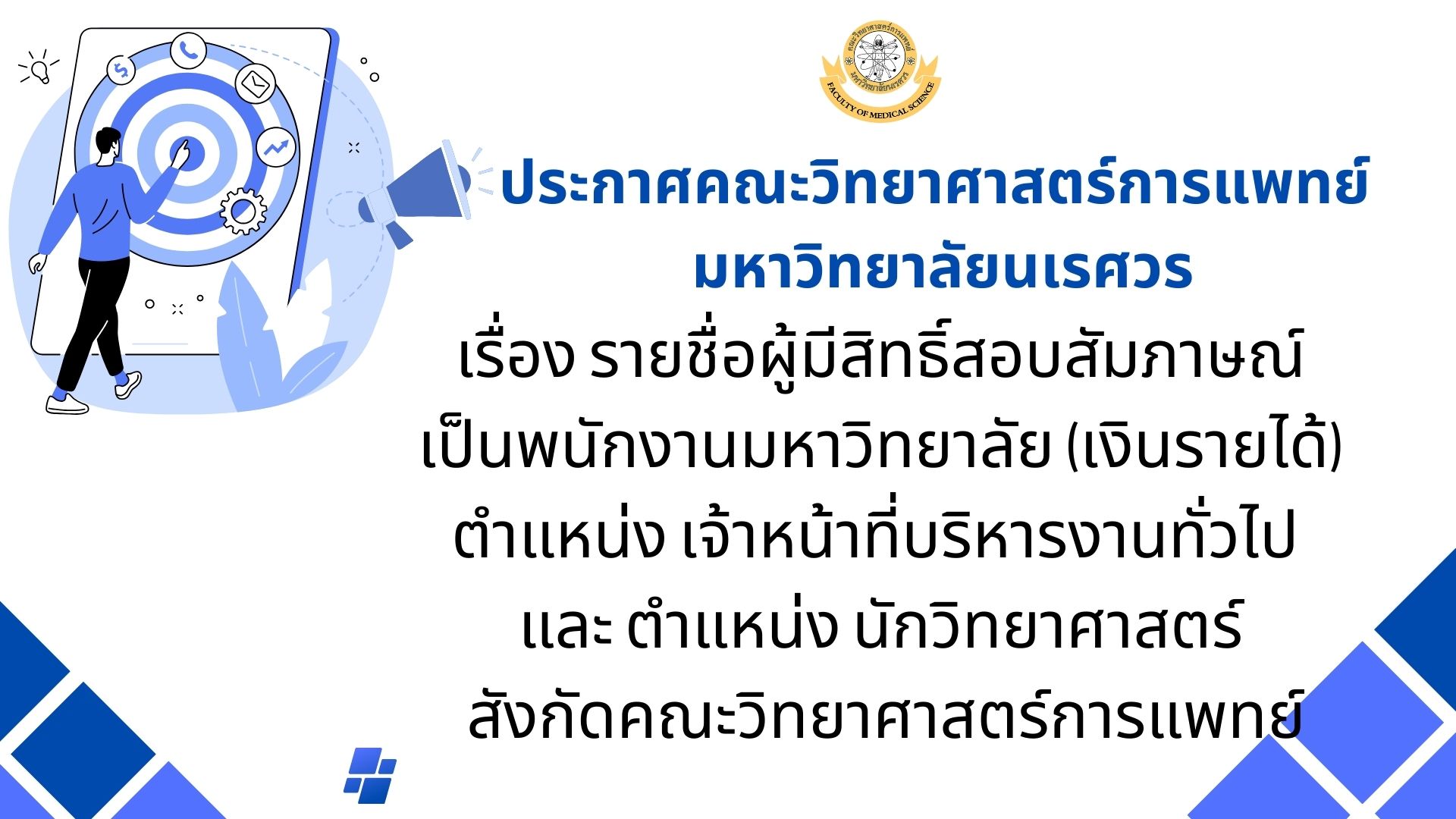ประกาศคณะวิทยาศาสตร์การแพทย์ มหาวิทยาลัยนเรศวร เรื่อง รายชื่อผู้มีสิทธิ์สอบสัมภาษณ์ เป็นพนักงานมหาวิทยาลัย (เงินรายได้) ตำแหน่ง เจ้าหน้าที่บริหารงานทั่วไป และ ตำแหน่ง นักวิทยาศาสตร์ สังกัดคณะวิทยาศาสตร์การแพทย์