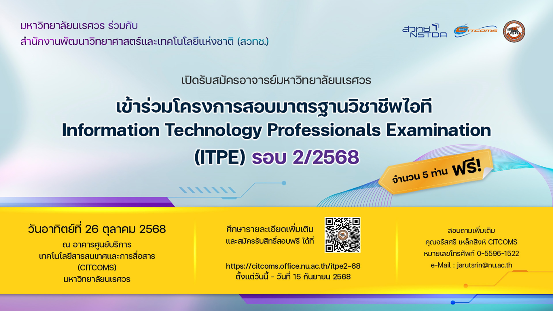 รับสมัครอาจารย์มหาวิทยาลัยนเรศวร เข้าร่วมโครงการสอบมาตรฐานวิชาชีพ (ITPE) รอบ 2/68 จำนวน 5 ท่าน ฟรี!