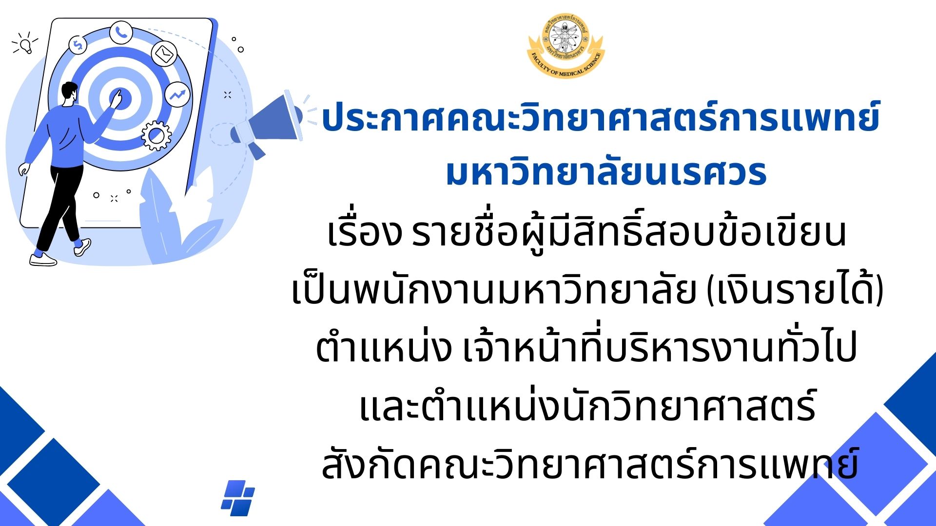 ประกาศคณะวิทยาศาสตร์การแพทย์ มหาวิทยาลัยนเรศวร เรื่อง รายชื่อผู้มีสิทธิ์สอบข้อเขียน เป็นพนักงานมหาวิทยาลัย (เงินรายได้) ตำแหน่ง เจ้าหน้าที่บริหารงานทั่วไป และตำแหน่งนักวิทยาศาสตร์ สังกัดคณะวิทยาศาสตร์การแพทย์