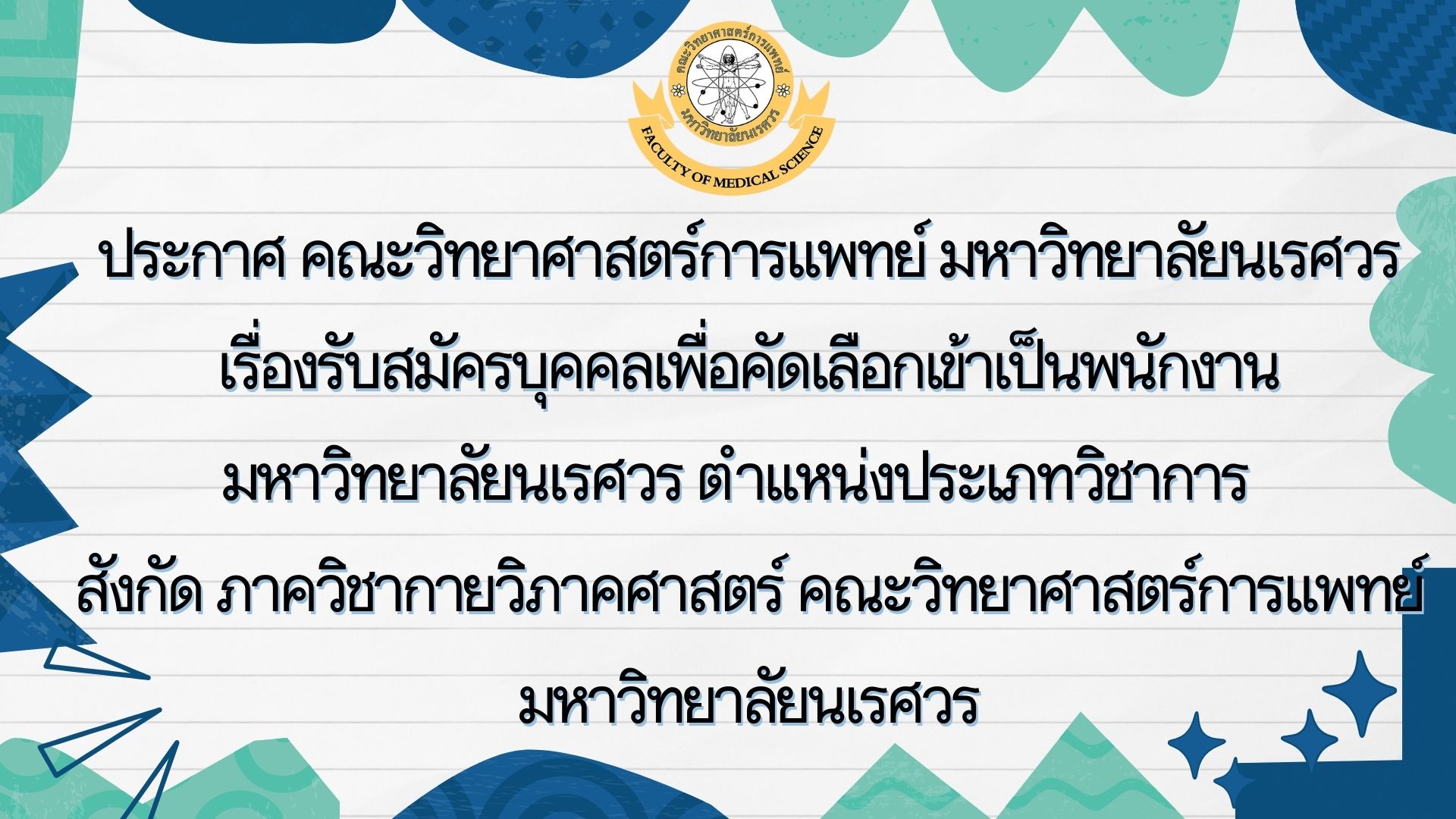ประกาศ คณะวิทยาศาสตร์การแพทย์ มหาวิทยาลัยนเรศวร เรื่อง รับสมัครบุคคลเพื่อคัดเลือกเข้าเป็นพนักงานมหาวิทยาลัยนเรศวร ตำแหน่งประเภทวิชาการ สังกัด ภาควิชากายวิภาคศาสตร์ คณะวิทยาศาสตร์การแพทย์ มหาวิทยาลัยนเรศวร