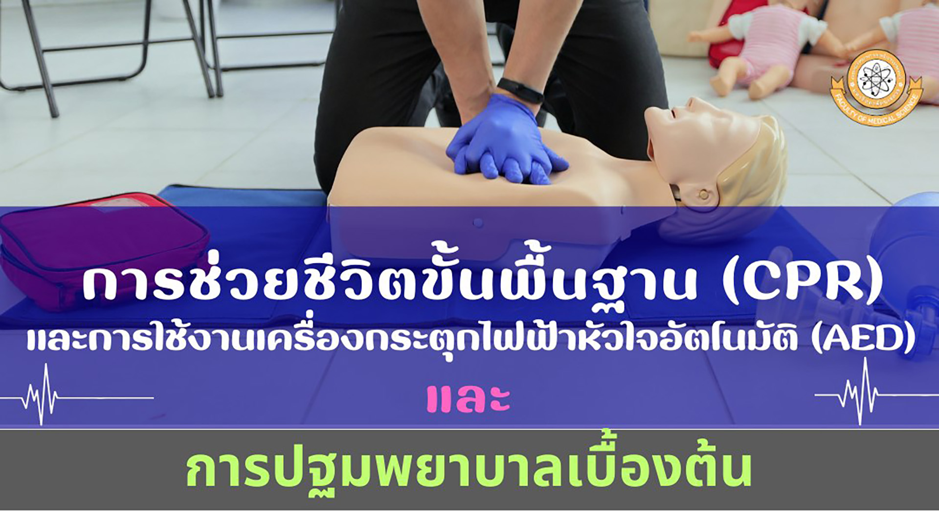 ขอเชิญนิสิตสาขาวิชาวิทยาศาสตร์การแพทย์ และสาขาวิชาวิทยาศาสตร์การแพทย์ (ตรีต่อเนื่องโท) ชั้นปีที่ 3 ทุกคน เข้าร่วมการอบรมเชิงปฏิบัติการ หัวข้อ “การช่วยชีวิตขั้นพื้นฐาน (CPR) และการใช้งานเครื่องกระตุกไฟฟ้าหัวใจอัตโนมัติ (AED) และการปฐมพยาบาลเบื้องต้น”