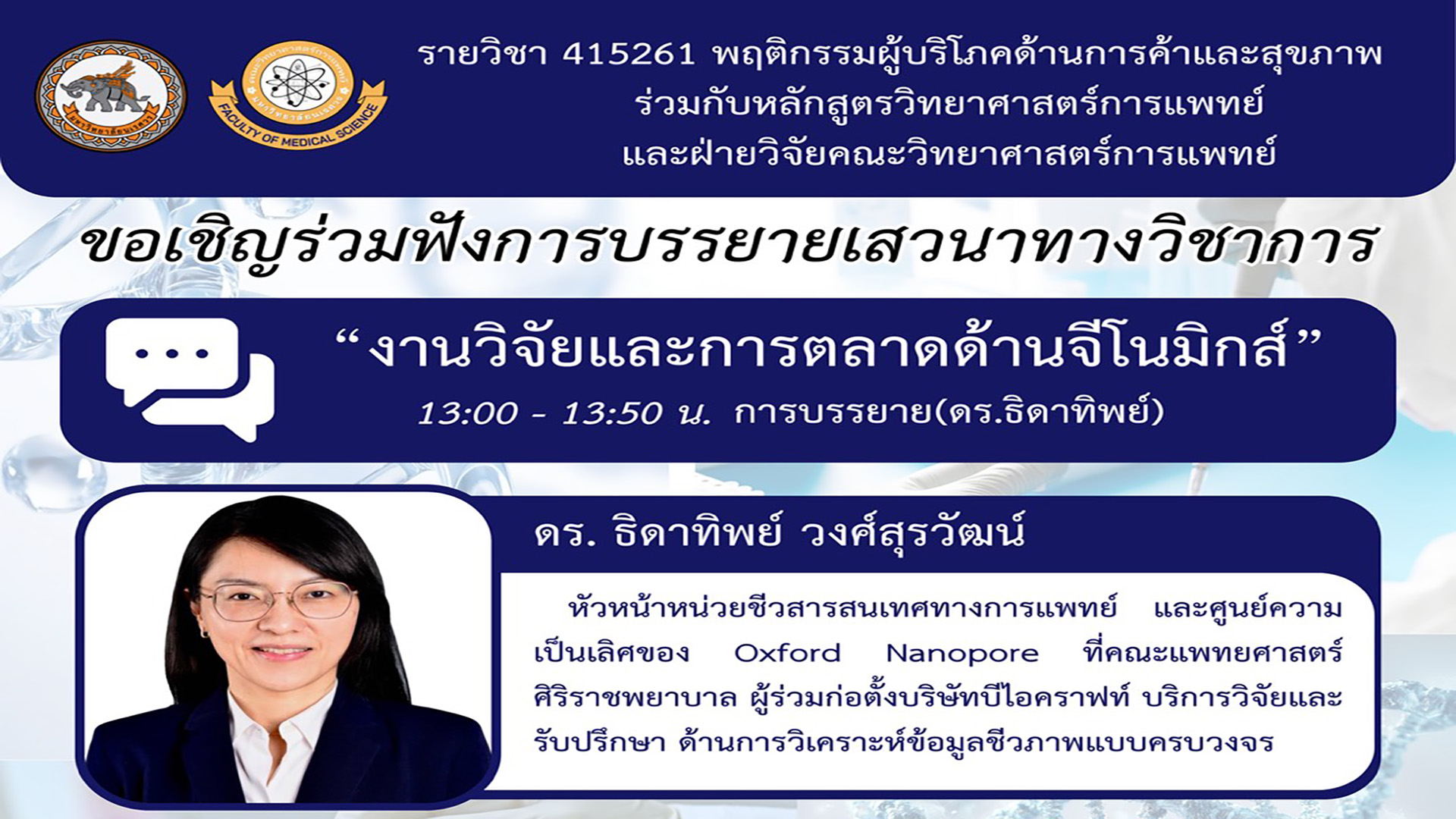 ขอเชิญเข้าร่วมฟังบรรยายและเสวนา หัวข้อ “งานวิจัยและการตลาดด้านจีโนมิกส์”