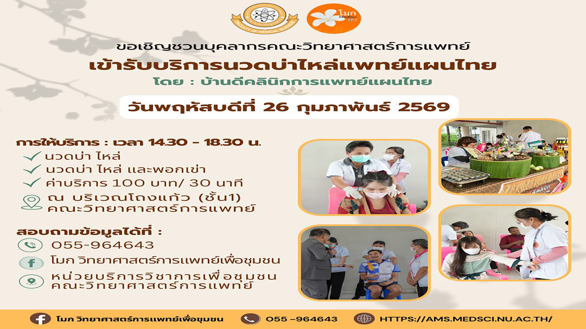 ขอเชิญบุคลากร นิสิตคณะวิทยาศาสตร์การแพทย์ และผู้สนใจทุกท่าน เข้ารับบริการนวดบ่าไหล่แพทย์แผนไทย โดย บ้านดีคลินิกการแพทย์แผนไทย ในกิจกรรม “MedSci Fun Fair 2026”