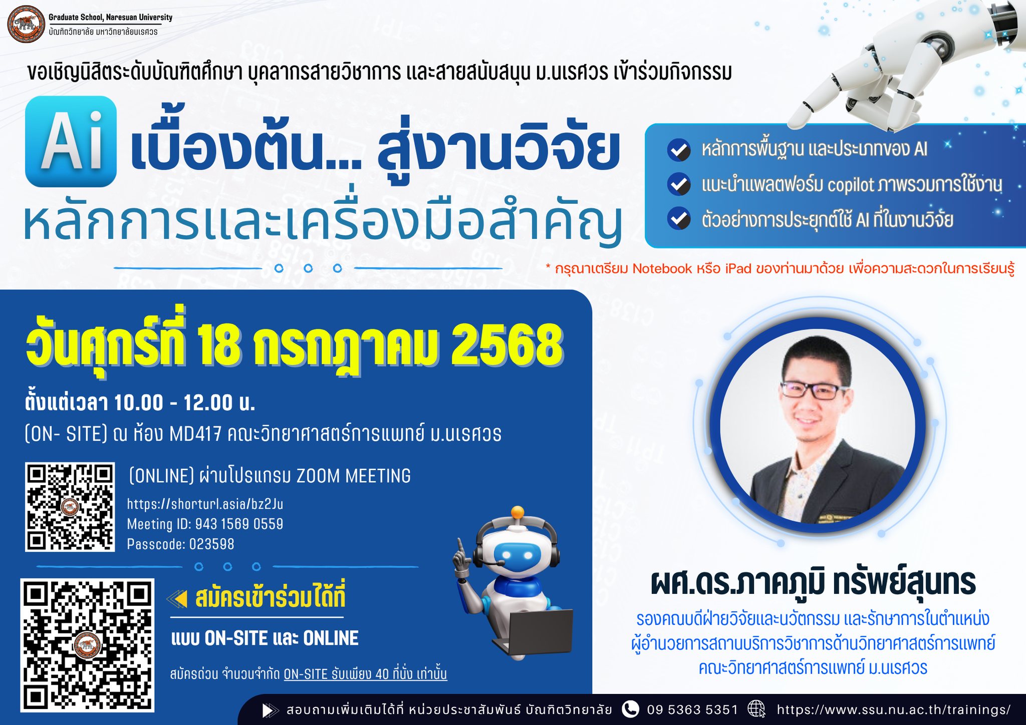 บัณฑิตวิทยาลัย ขอเชิญนิสิตระดับบัณฑิตศึกษา บุคลากรสายวิชาการ และสายสนับสนุน ม.นเรศวร เข้าร่วมกิจกรรมแลกเปลี่ยนเรียนรู้และการอบรมเชิงปฏิบัติการ
