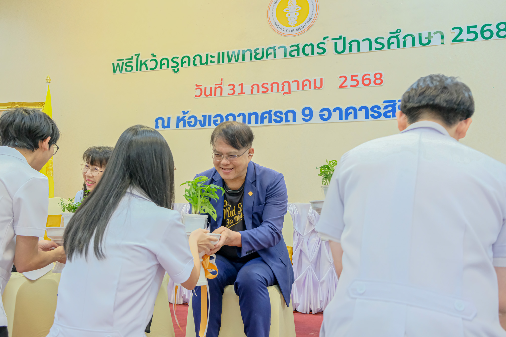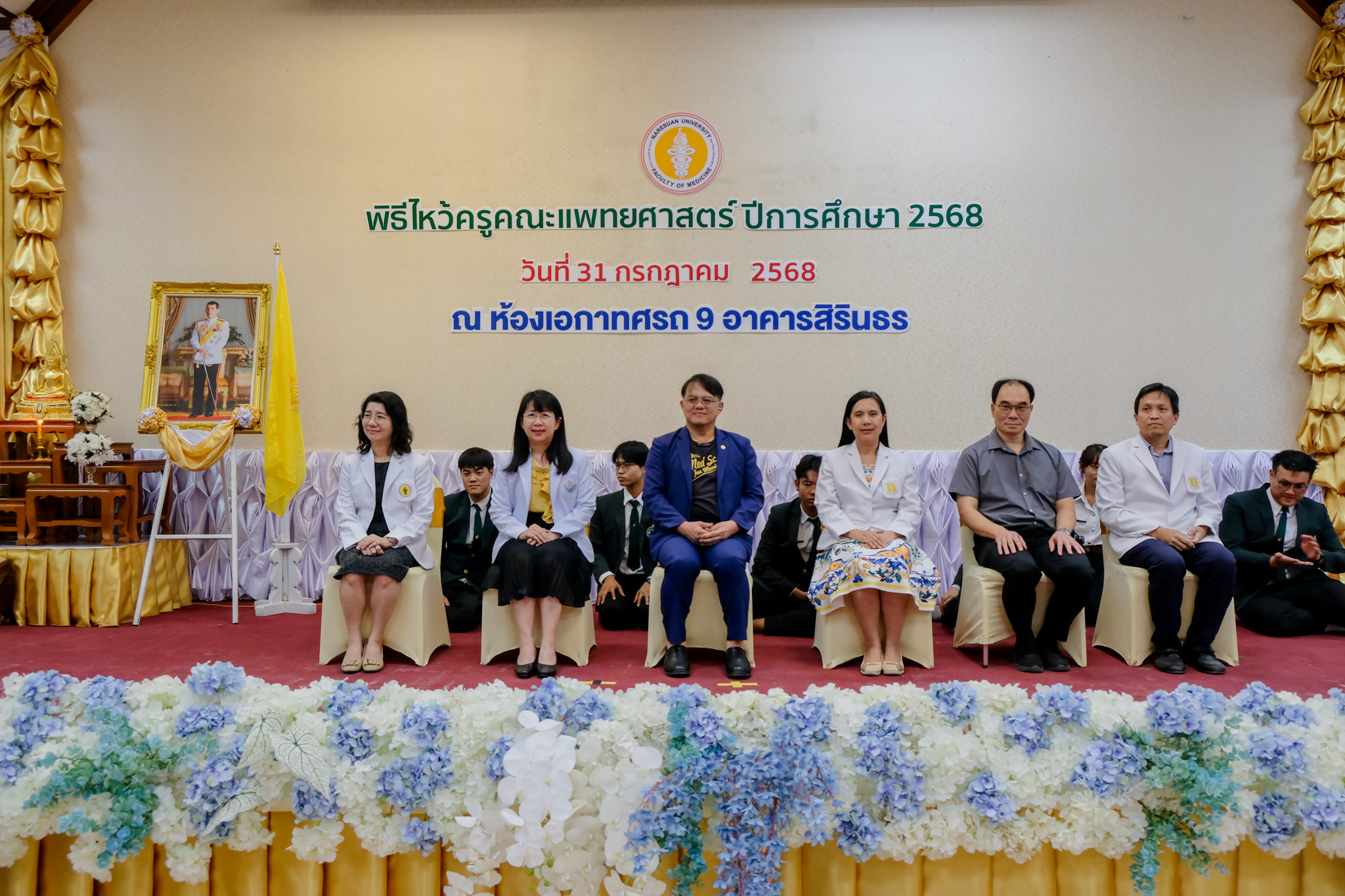 วันที่ 31 กรกฎาคม 2568 รองศาสตราจารย์ ดร.สุขกิจ ยะโสธรศรีกุล คณบดีคณะวิทยาศาสตร์การแพทย์ พร้อมด้วย รองศาสตราจารย์ ดร.รักษิณา พลสีลา รองคณบดีฝ่ายการจัดการหลักสูตร เข้าร่วมพิธีไหว้ครู ประจำปีการศึกษา 2568 ณ ห้องประชุมเอกาทศรถ 9 ชั้น 3 อาคารสิรินธร โรงพยาบาลมหาวิทยาลัยนเรศวร
