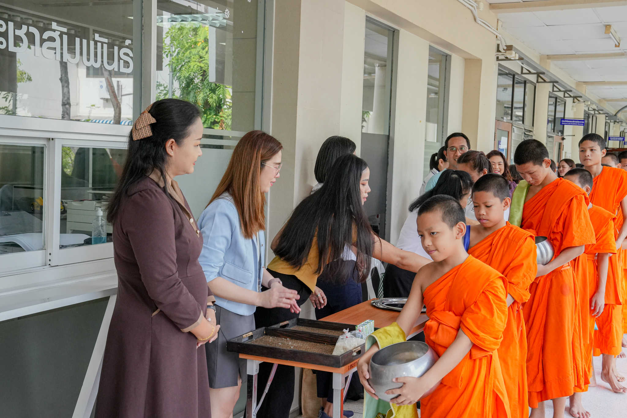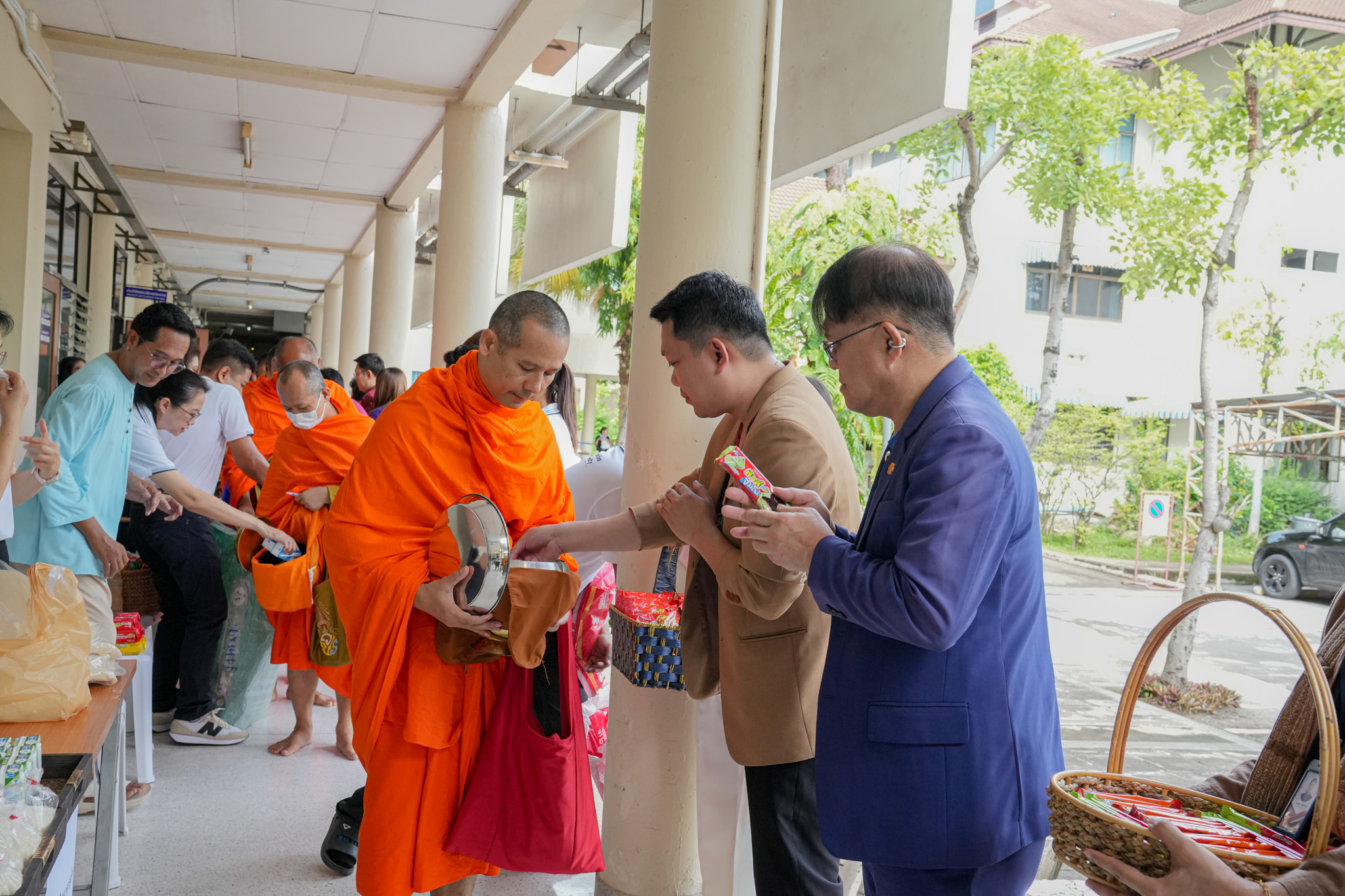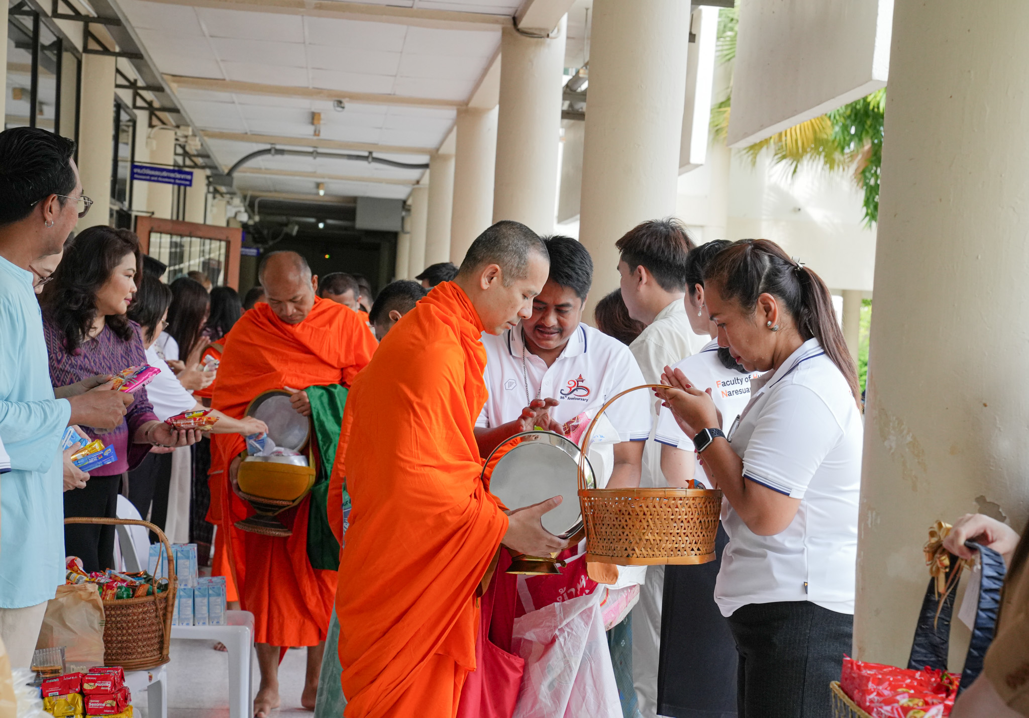 วันที่ 1 สิงหาคม 2568 รองศาสตราจารย์ ดร.สุขกิจ ยะโสธรศรีกุล คณบดีคณะวิทยาศาสตร์การแพทย์ พร้อมด้วย รองศาสตราจารย์ ดร.วรศักดิ์ แก้วก่อง รองคณบดีฝ่ายบริหารและส่งเสริมความยั่งยืน, ดร.หทัยชนก อิ่มเพ็ง รองคณบดีฝ่ายพัฒนานิสิต, ดร.สุภัทรา คันทรง ผู้ช่วยคณบดี และบุคลากร คณะวิทยาศาสตร์การแพทย์ ร่วมทำบุญตักบาตรข้าวสารอาหารแห้ง และมอบช่อดอกไม้แสดงความยินดี เนื่องในโอกาสวันคล้ายวันสถาปนาคณะมนุษยศาสตร์ ครบรอบ 35 ปี ณ คณะมนุษยศาสตร์ มหาวิทยาลัยนเรศวร