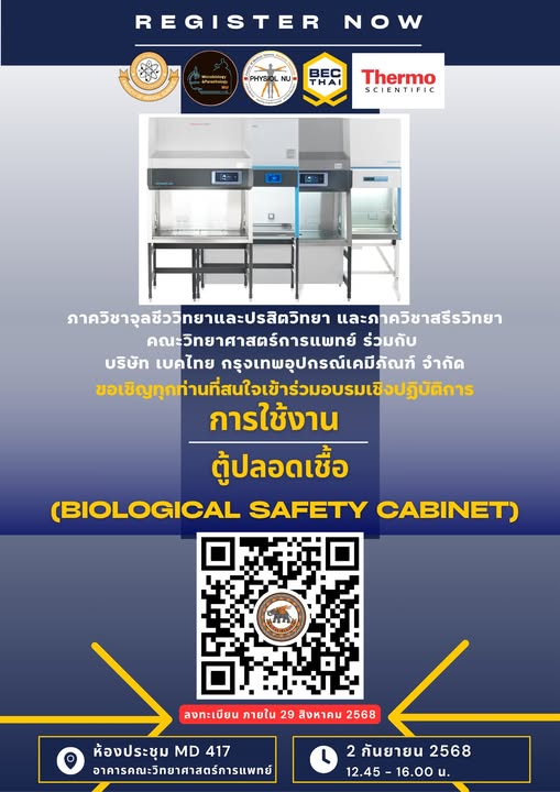 ภาควิชาจุลชีววิทยาและปรสิตวิทยา ภาควิชาสรีรวิทยา คณะวิทยาศาสตร์การแพทย์ ร่วมกับ บริษัท เบคไทย กรุงเทพอุปกรณ์เคมีภัณฑ์ จํากัด ขอเชิญชวนผู้ที่สนใจเข้าร่วมอบรมเชิงปฏิบัติการ “การใช้งานตู้ชีวนิรภัย (Biological safety cabinet)”