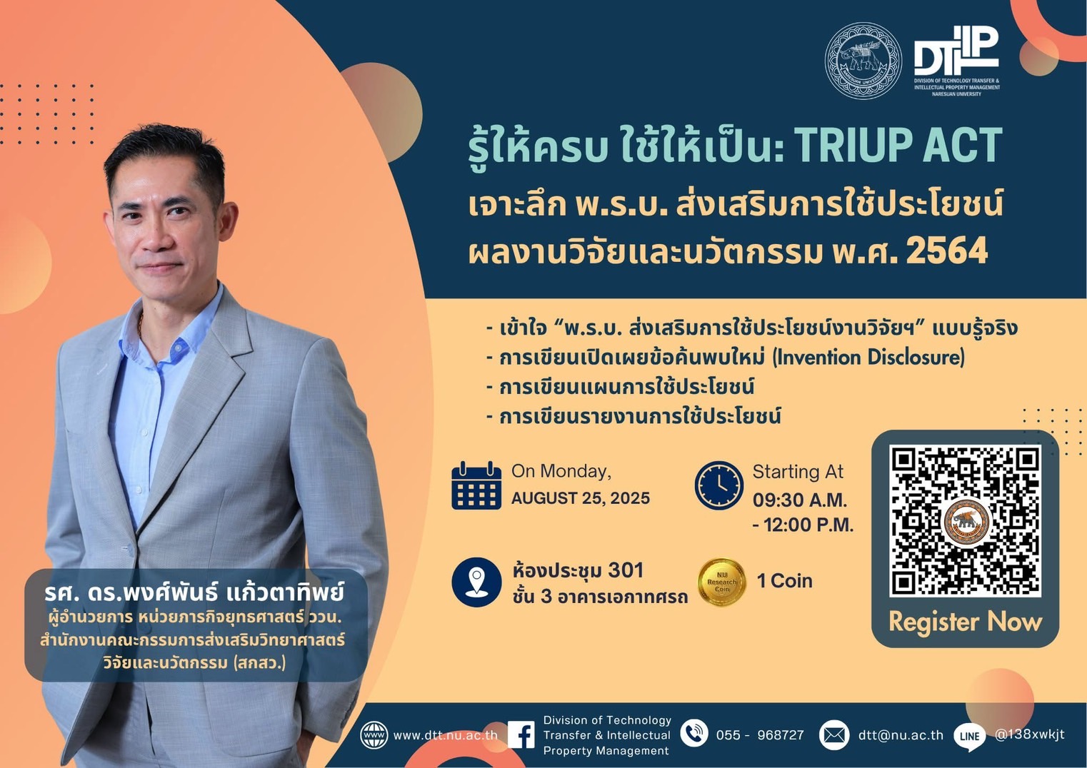 ขอเชิญอาจารย์ นักวิจัย มหาวิทยาลัยนเรศวร เข้าร่วมกิจกรรมอบรมหัวข้อ “รู้ให้ครบ ใช้ให้เป็น: TRIUP Act เจาะลึก พ.ร.บ. ส่งเสริมการใช้ประโยชน์ผลงานวิจัยและนวัตกรรม พ.ศ. 2564 (สำหรับนักวิจัย)” ร่วมไขความลับและการดำเนินการต่าง ๆ ที่จะเป็นประโยชน์ต่อนักวิจัย และสิ่งที่นักวิจัยต้องรู้ และไม่ควรพลาด !