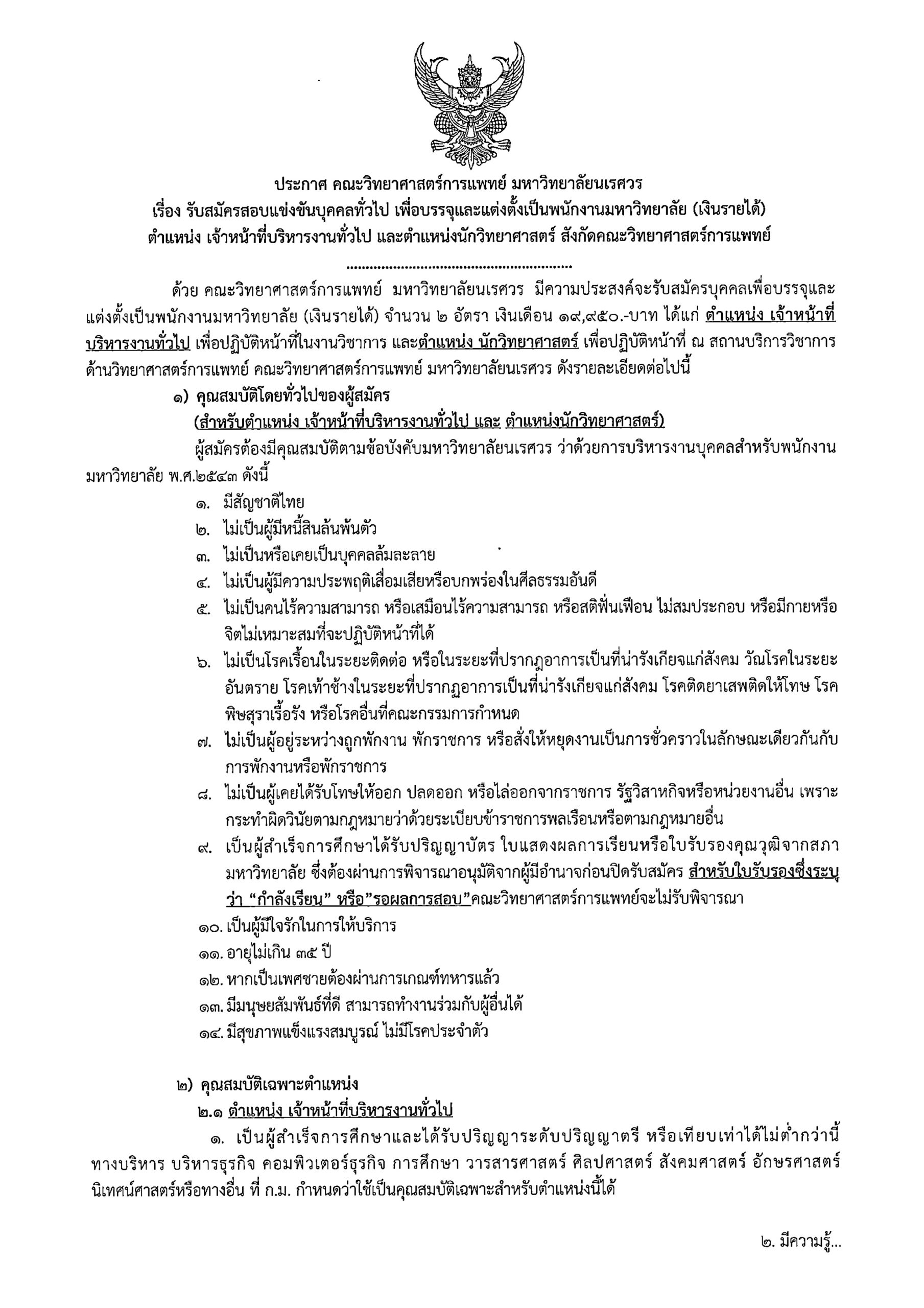 เรื่อง รับสมัครสอบแข่งขันบุคคลทั่วไป เพื่อบรรจุและแต่งตั้งเป็นพนักงานมหาวิทยาลัย (เงินรายได้) ตำแหน่ง เจ้าหน้าที่บริหารงานทั่วไป และตำแหน่งนักวิทยาศาสตร์ สังกัดคณะวิทยาศาสตร์การแพทย์