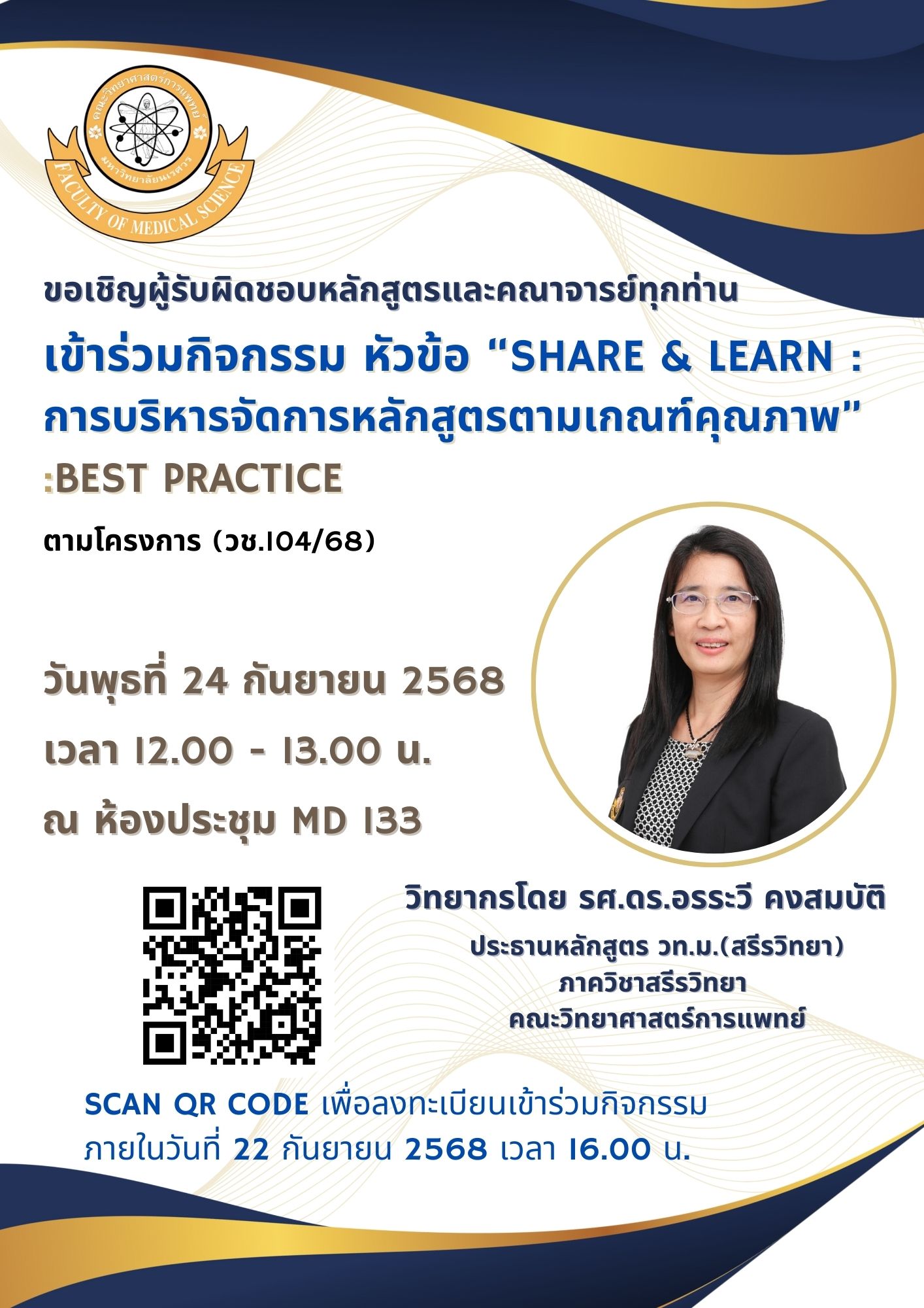 ฝ่ายวิชาการ คณะวิทยาศาสตร์การแพทย์ ขอเชิญผู้รับผิดชอบหลักสูตรและคณาจารย์ทุกท่าน เข้าร่วมกิจกรรม หัวข้อ