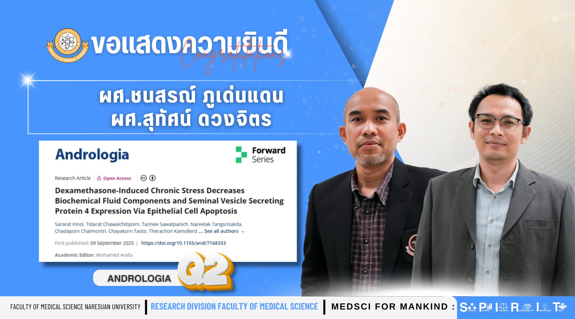 เรื่อง “Dexamethasone-Induced Chronic Stress Decreases Biochemical Fluid Components and Seminal Vesicle Secreting Protein 4 Expression Via Epithelial Cell Apoptosis”วารสาร: Andrologia