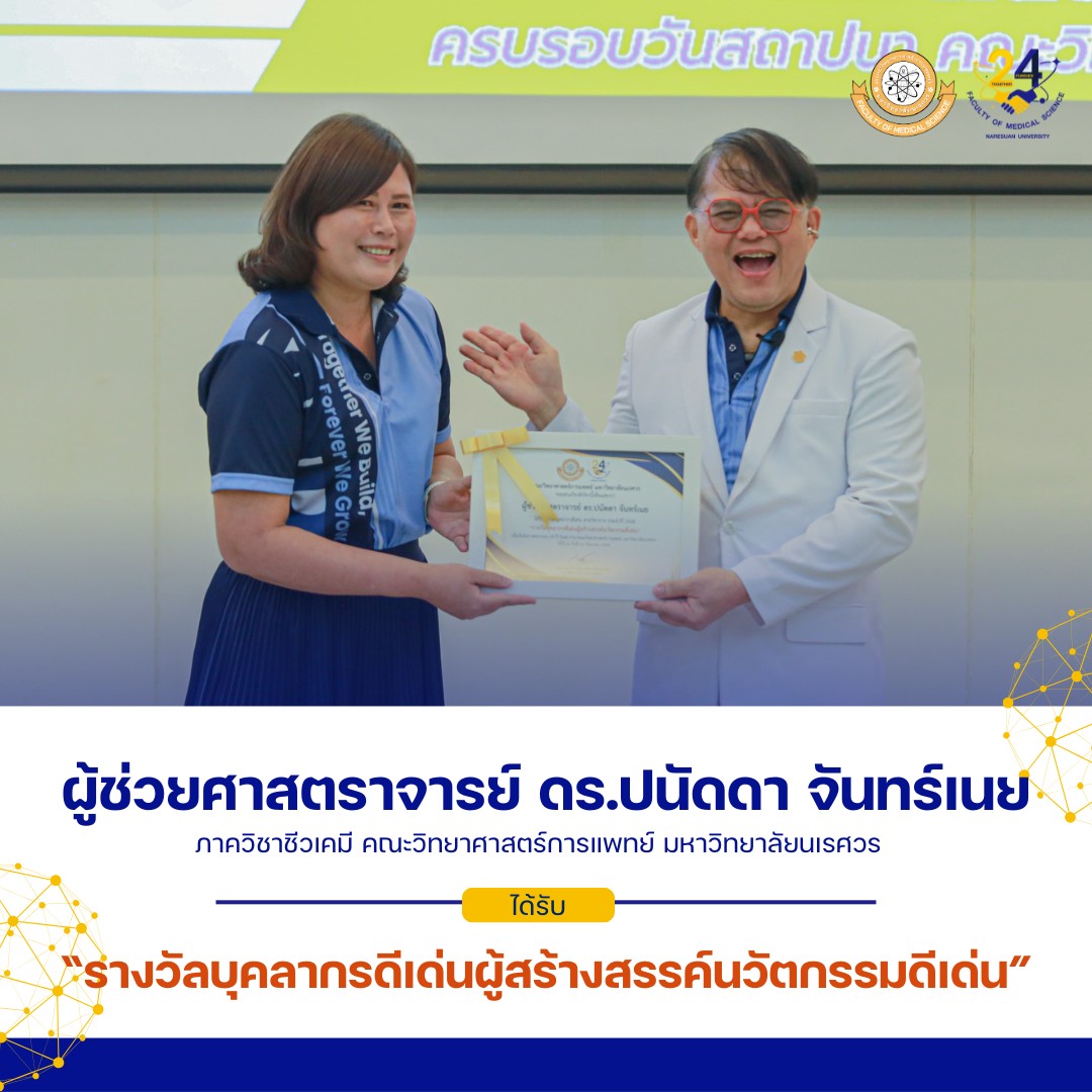 คณะวิทยาศาสตร์การแพทย์ขอแสดงความยินดีกับ ผู้ช่วยศาสตราจารย์ ดร.ปนัดดา จันทร์เนย ภาควิชาชีวเคมี คณะวิทยาศาสตร์การแพทย์ มหาวิทยาลัยนเรศวร ที่ได้รับ“รางวัลบุคลากรดีเด่นผู้สร้างสรรค์นวัตกรรมดีเด่น” เนื่องในโอกาสครบรอบ 24 ปี วันสถาปนาคณะวิทยาศาสตร์การแพทย์ มหาวิทยาลัยนเรศวร