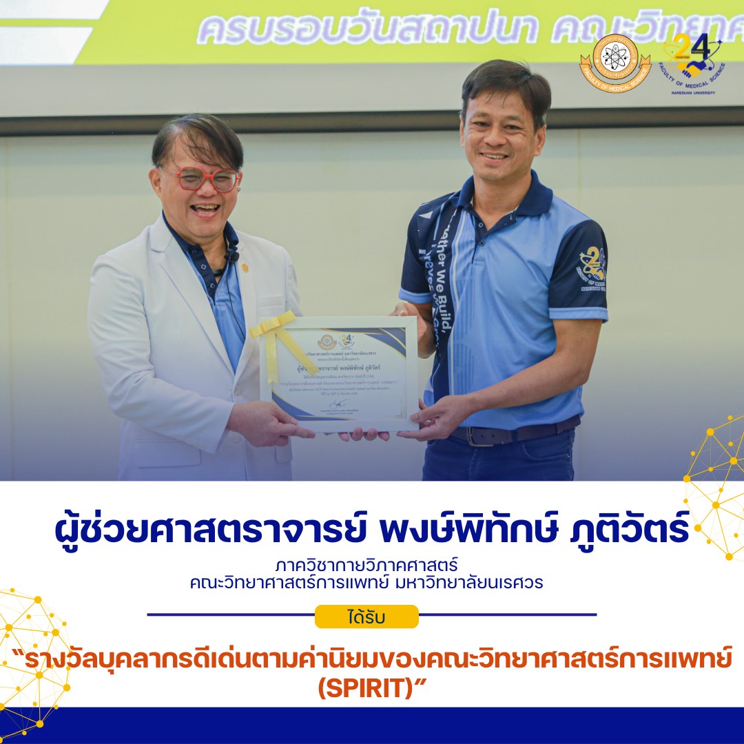 คณะวิทยาศาสตร์การแพทย์ ขอแสดงความยินดีกับบุคลากรภาควิชากายวิภาคศาสตร์ ที่ได้รับ“รางวัลบุคลากรดีเด่นตามค่านิยมของคณะวิทยาศาสตร์การแพทย์ (SPIRIT)” เนื่องในโอกาสครบรอบ 24 ปี วันสถาปนาคณะวิทยาศาสตร์การแพทย์ มหาวิทยาลัยนเรศวร ได้แก่