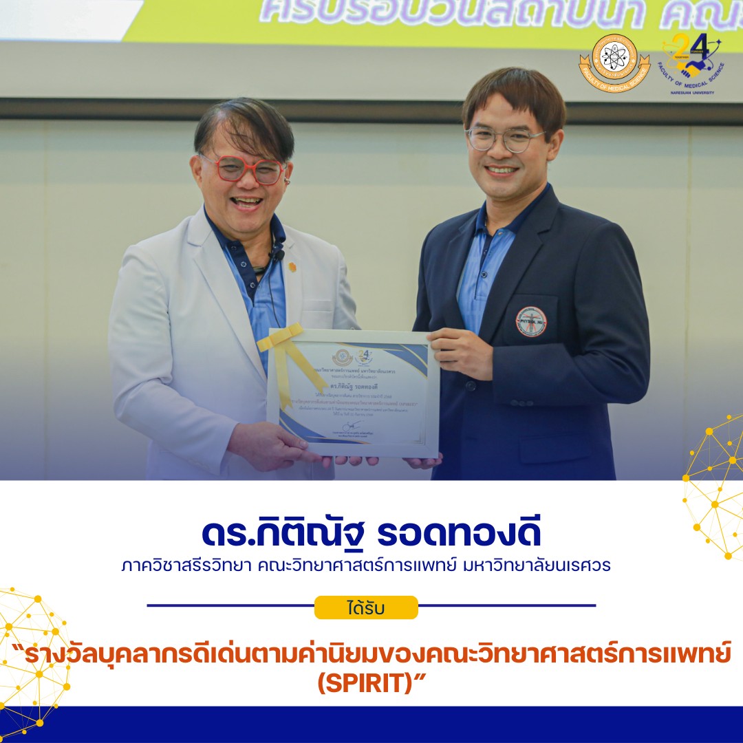 คณะวิทยาศาสตร์การแพทย์ ขอแสดงความยินดีกับบุคลากรภาควิชาสรีรวิทยา ที่ได้รับ“รางวัลบุคลากรดีเด่นตามค่านิยมของคณะวิทยาศาสตร์การแพทย์ (SPIRIT)” เนื่องในโอกาสครบรอบ 24 ปี วันสถาปนาคณะวิทยาศาสตร์การแพทย์ มหาวิทยาลัยนเรศวร ได้แก่
