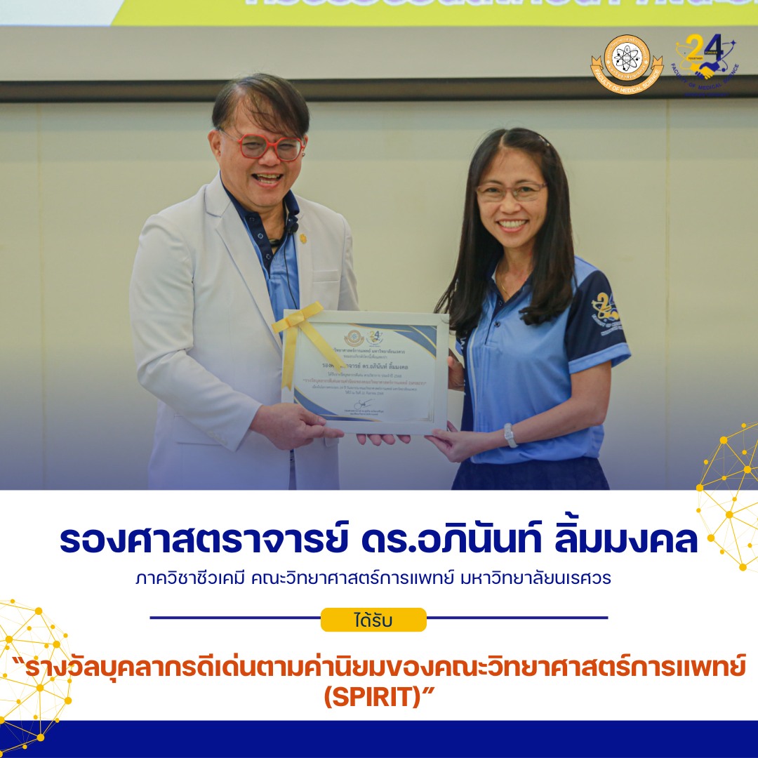 คณะวิทยาศาสตร์การแพทย์ ขอแสดงความยินดีกับบุคลากรภาควิชาชีวเคมี ที่ได้รับ“รางวัลบุคลากรดีเด่นตามค่านิยมของคณะวิทยาศาสตร์การแพทย์ (SPIRIT)” เนื่องในโอกาสครบรอบ 24 ปี วันสถาปนาคณะวิทยาศาสตร์การแพทย์ มหาวิทยาลัยนเรศวร ได้แก่