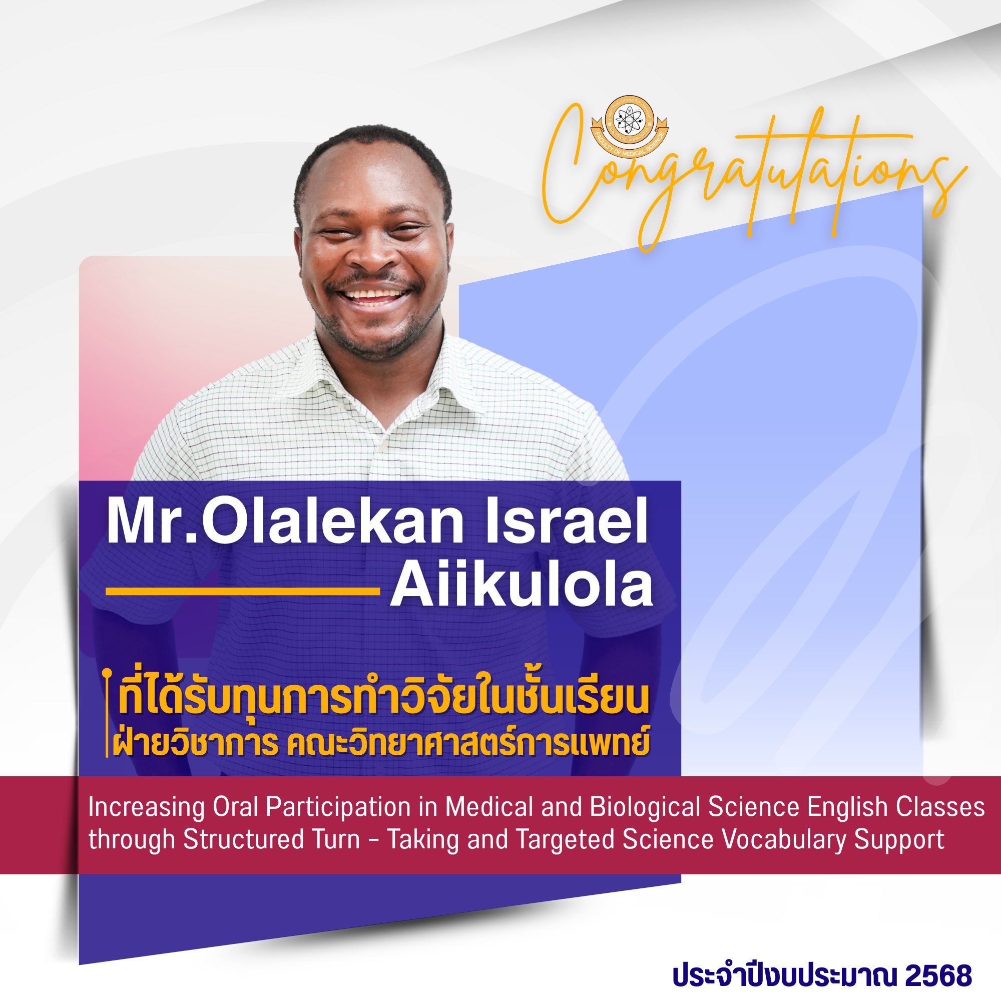 คณะวิทยาศาสตร์การแพทย์ ขอแสดงความยินดีกับ Mr.Olalekan Israel Aiikulola