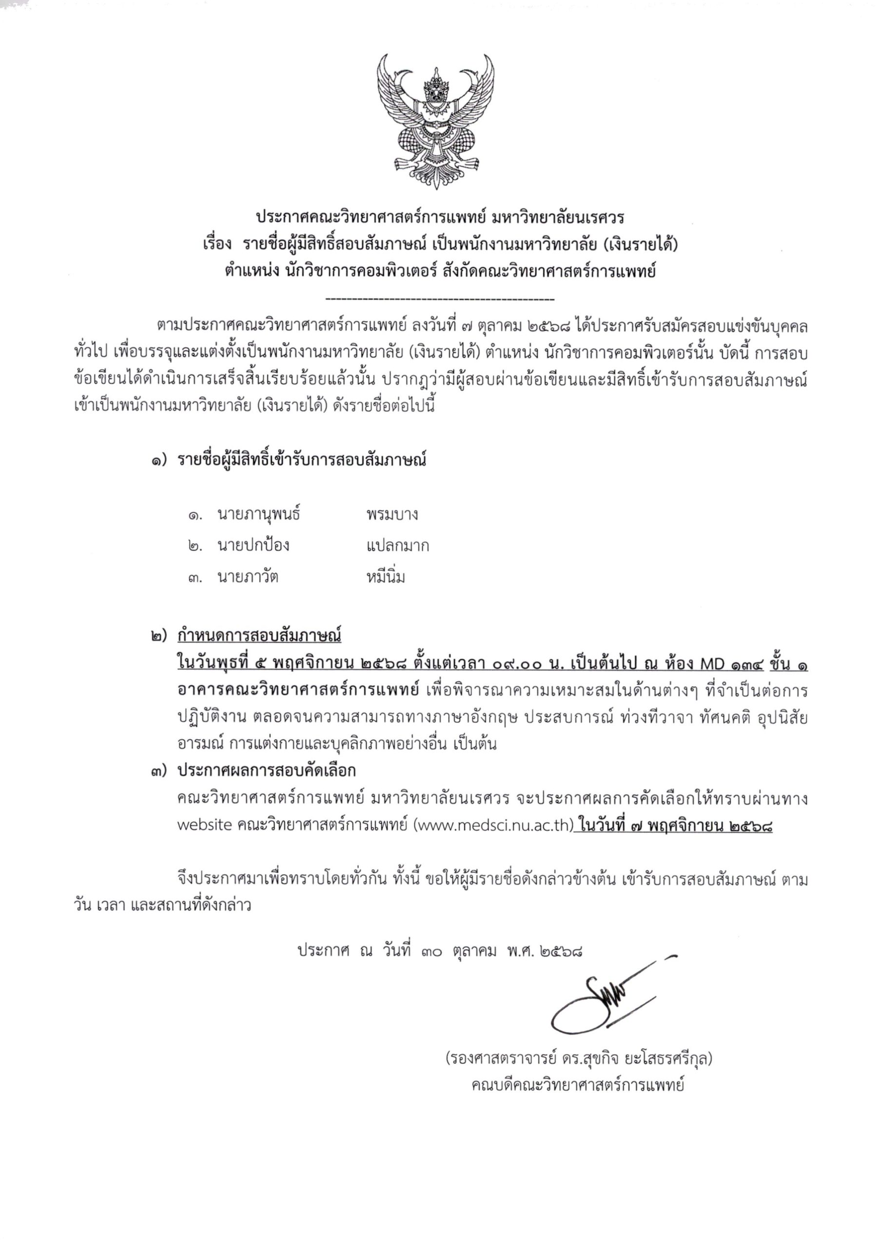 ประกาศคณะวิทยาศาสตร์การแพทย์ มหาวิทยาลัยนเรศวร เรื่อง รายชื่อผู้มีสิทธิ์สอบสัมภาษณ์ เป็นพนักงานมหาวิทยาลัย(เงิยรายได้) ตำแหน่งนักวิชาการคอมพิวเตอร์ สังกัดคณะวิทยาศาสตร์การแพทย์