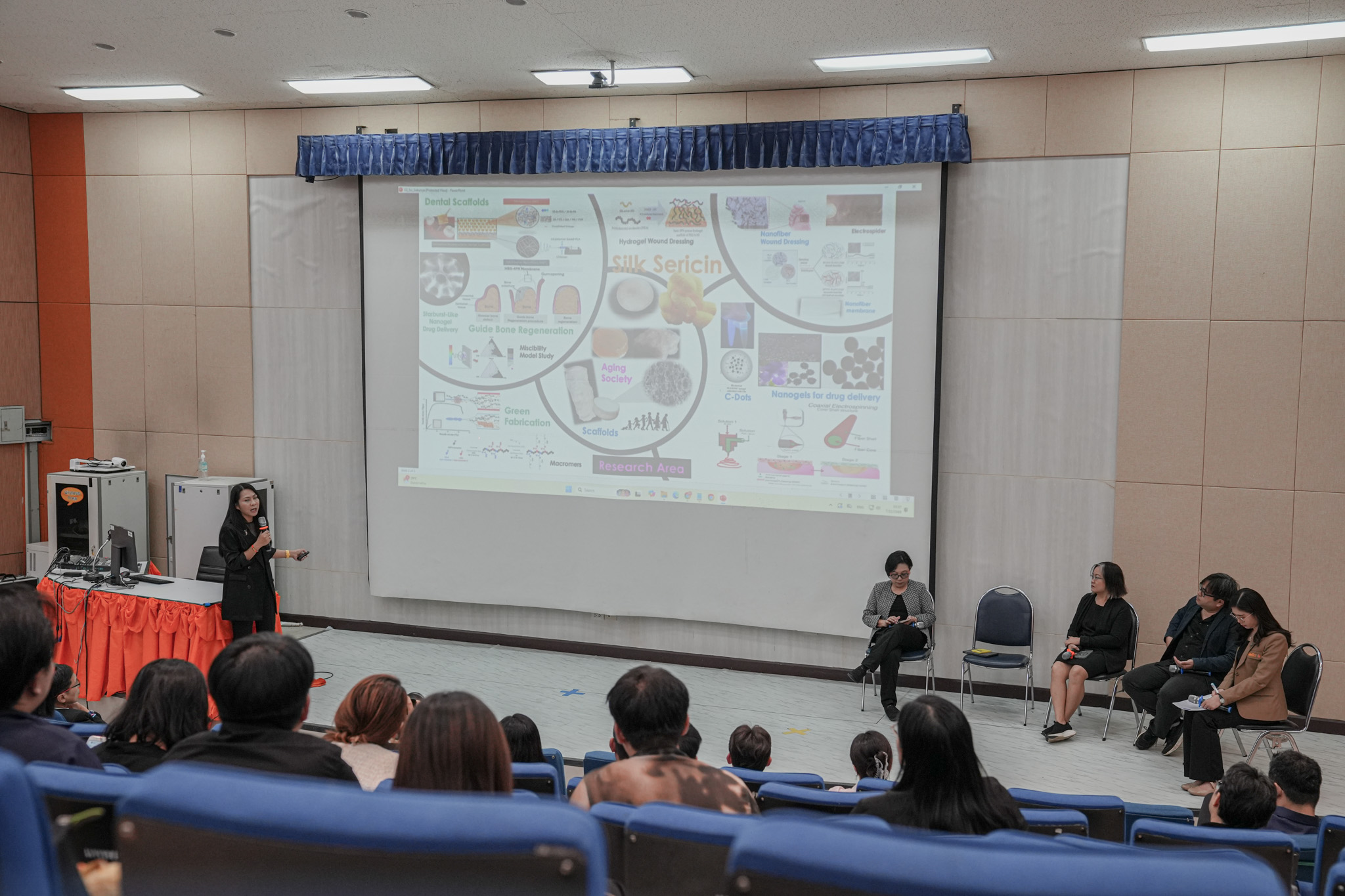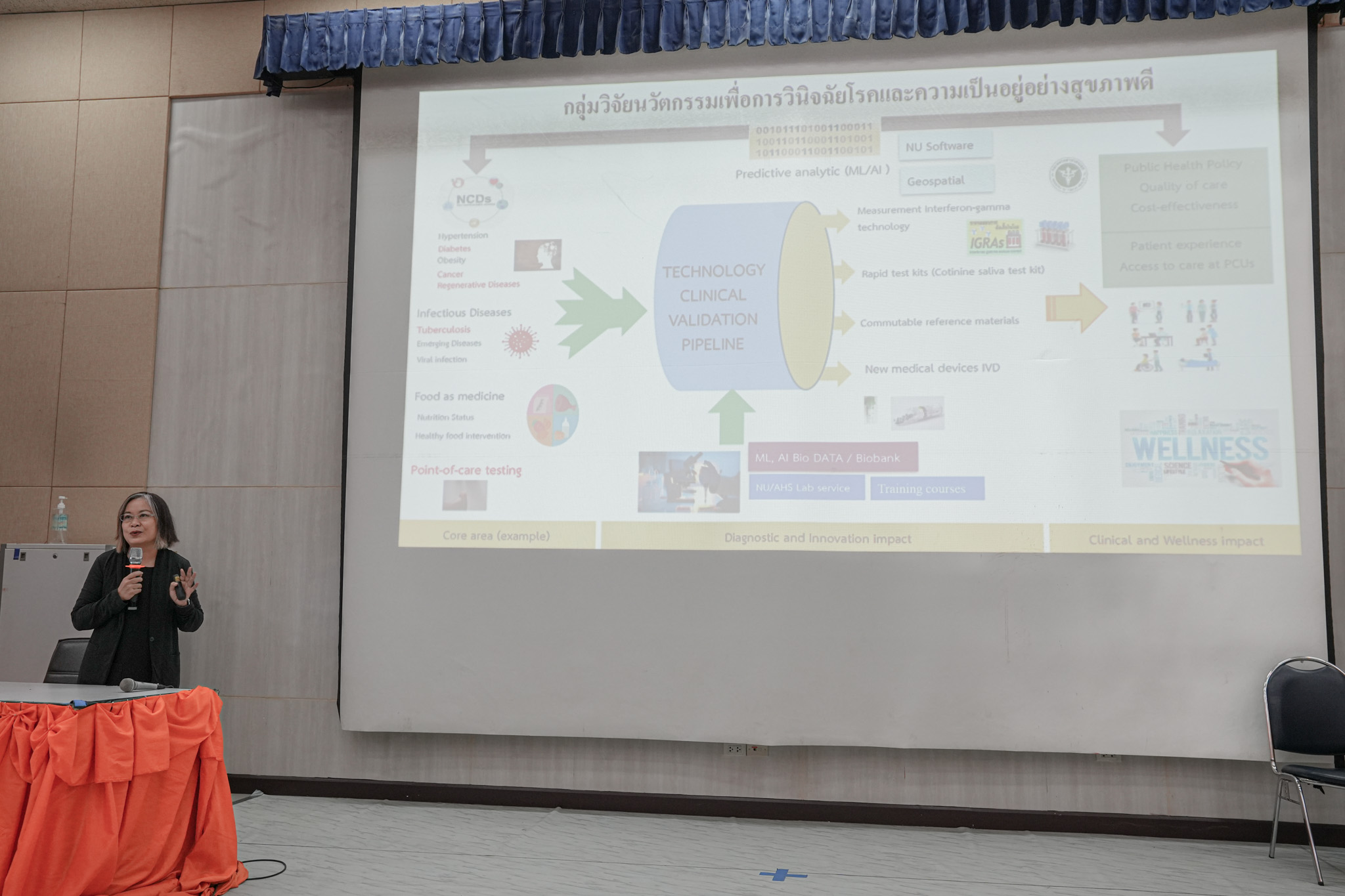 ผู้เสวนาได้แลกเปลี่ยนประสบการณ์และยกตัวอย่างงานวิจัยที่หลากหลาย ตั้งแต่ผลิตภัณฑ์สมุนไพร โพลิเมอร์ชีวภาพเพื่อการแพทย์ ชุดตรวจและอุปกรณ์การแพทย์ ไปจนถึงการพัฒนาอุปกรณ์สวมใส่และปัญญาประดิษฐ์ด้านสุขภาพ ซึ่งสะท้อนศักยภาพในการสร้างองค์ความรู้และต่อยอดสู่การใช้งานจริง