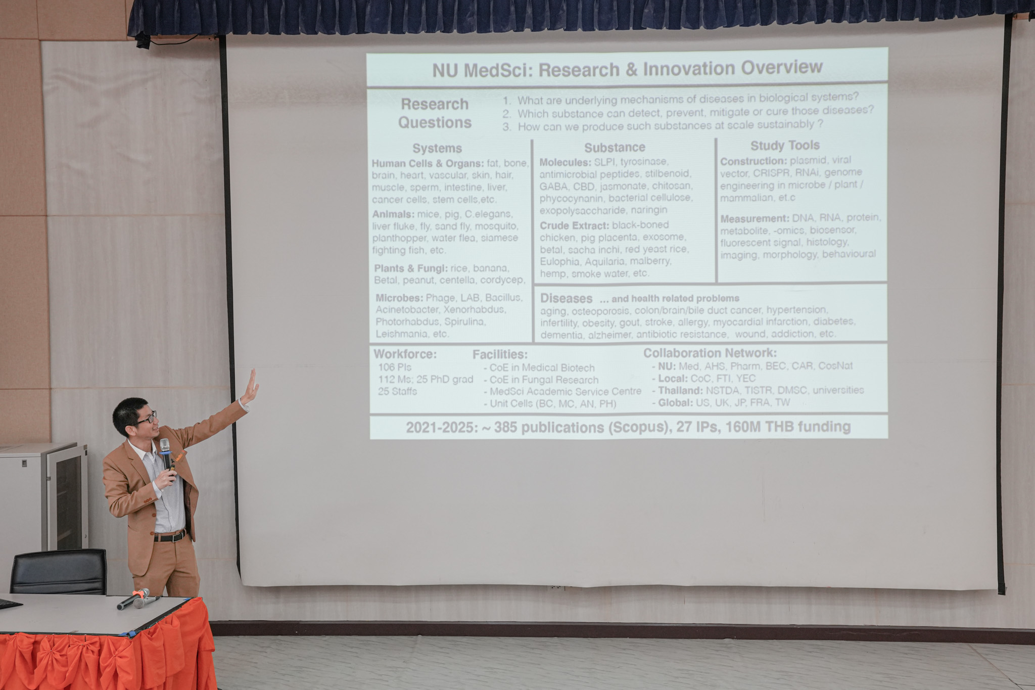 ซึ่งเป็นนำเสนอตัวอย่างงานวิจัยจากคณะแพทยศาสตร์ที่ทำร่วมกับคณะต่าง ๆ และจุดแข็งด้านงานวิจัยของคณะวิทยาศาสตร์การแพทย์ ด้านระบบนิเวศงานวิจัยทางวิทยาศาสตร์สุขภาพ อาทิ การทดสอบฤทธิ์ทางชีวภาพในเซลล์เพาะเลี้ยงและสัตว์ทดลอง การศึกษากลไกและเป้าหมายของโรคในระดับโมเลกุล รวมถึงความร่วมมือข้ามคณะในการพัฒนางานวิจัยทางคลินิก