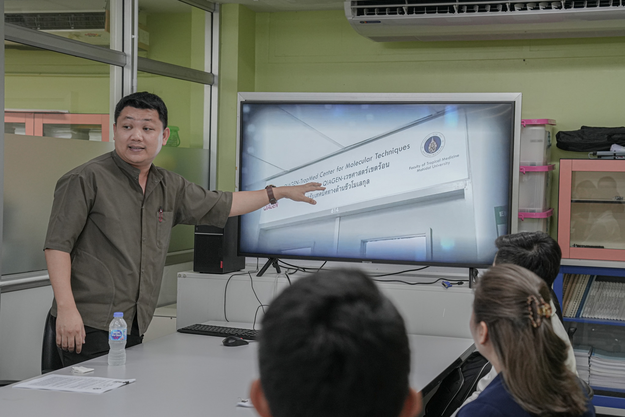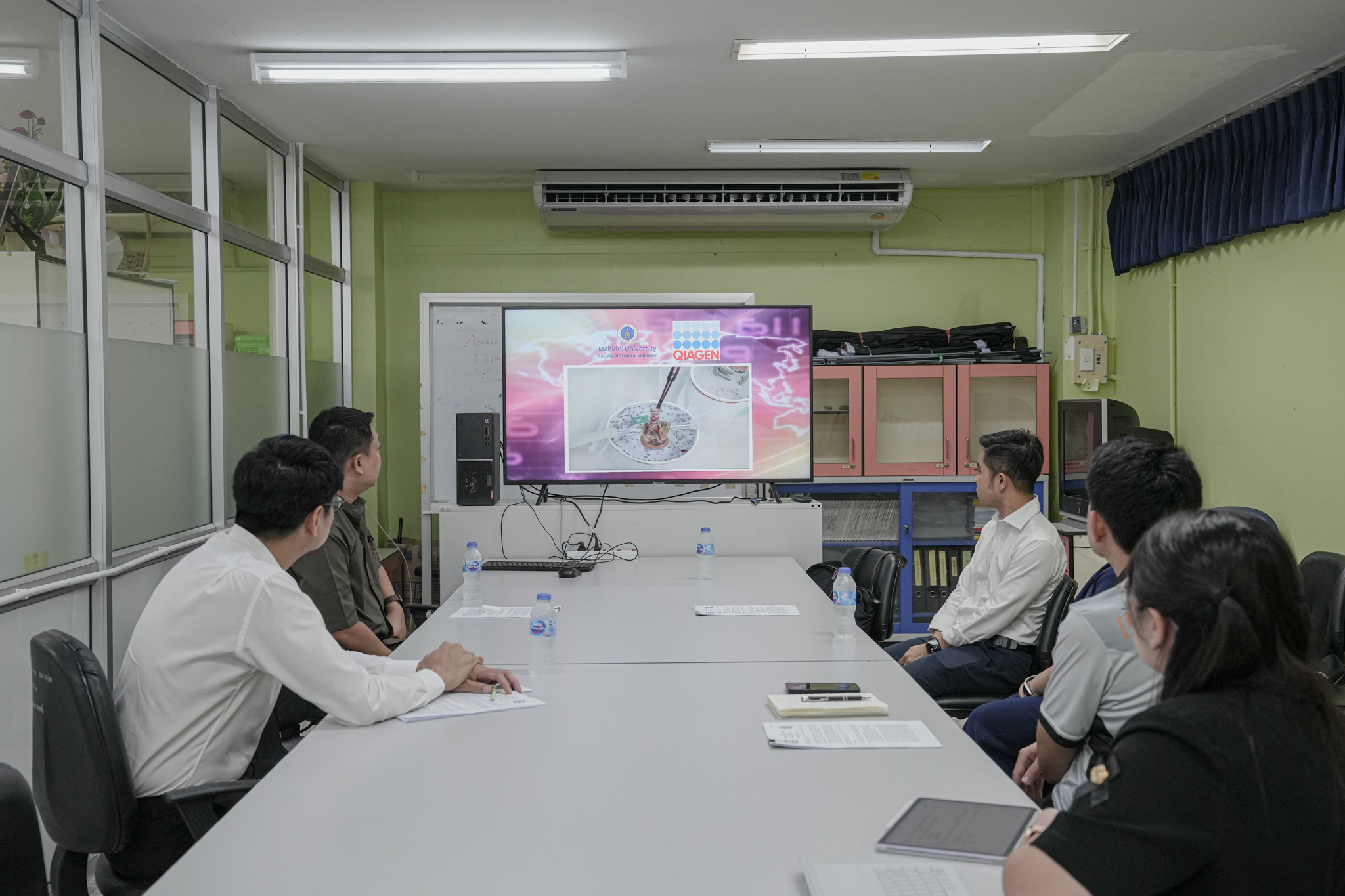 วันที่ 11 พฤศจิกายน 2568 รองศาสตราจารย์ ดร.วรศักดิ์ แก้วก่อง รองคณบดีฝ่ายบริหารและส่งเสริมความยั่งยืน พร้อมด้วย อาจารย์ธรรศ พิศลกุลเกษม ผู้ช่วยคณบดี ร่วมกับนักวิทยาศาสตร์และเจ้าหน้าที่จากสถานบริการวิชาการด้านวิทยาศาสตร์การแพทย์ ให้การต้อนรับ คณะผู้แทนจากบริษัท ไคอาเจน (ประเทศไทย) จำกัด (QIAGEN)