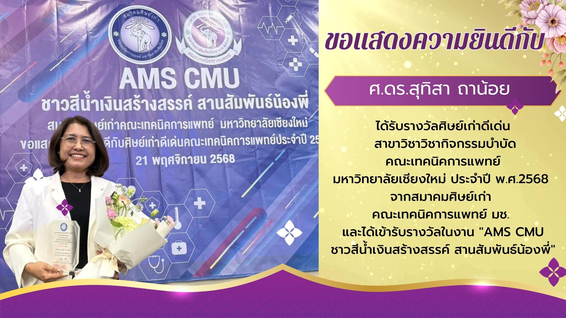 ขอแสดงความยินดีกับ ศ.ดร.สุทิสา ถาน้อย ที่ได้รับรางวัลศิษย์เก่าดีเด่น สาขาวิชากิจกรรมบำบัดคณะเทคนิคการแพทย์ มหาวิทยาลัยเชียงใหม่ ประจำปี พ.ศ.2568 จากสมาคมศิษย์เก่า คณะเทคนิคการแพทย์ มช. และได้เข้ารับรางวัลในงาน “AMS CMU ชาวสีน้ำเงินสร้างสรรค์ สานสัมพันธ์น้องพี่” เมื่อวันศุกร์ ที่ 21 พฤศจิกายน 2568