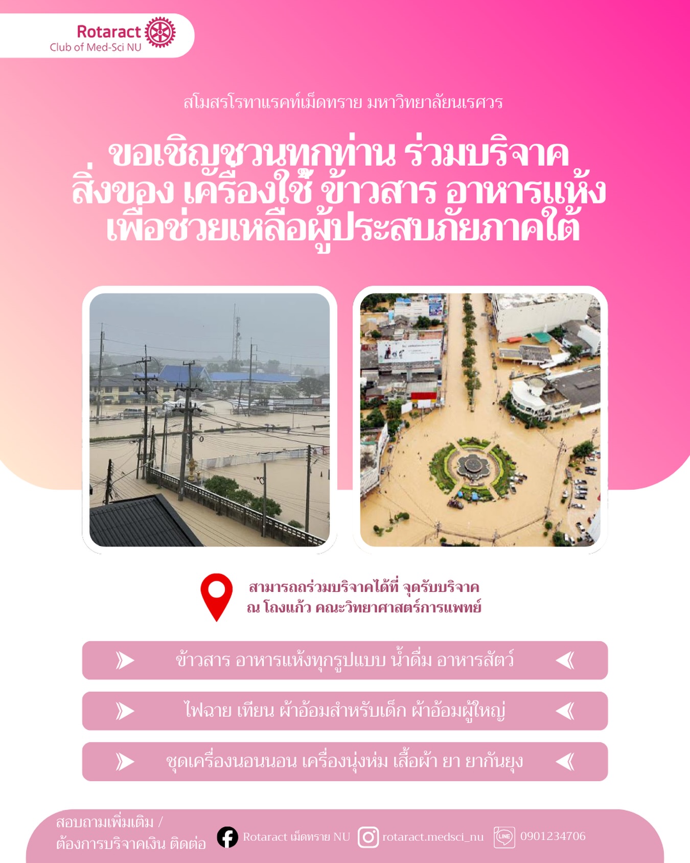 สโมสรโรทาแรคท์เม็ดทราย มหาวิทยาลัยนเรศวรขอเชิญทุกท่านร่วมบริจาค ข้าวสาร อาหารแห้ง น้ำดื่ม เครื่องนอน ผ้าอ้อมเด็ก ไฟฉาย เทียน ยา และของใช้จำเป็นอื่น ๆ