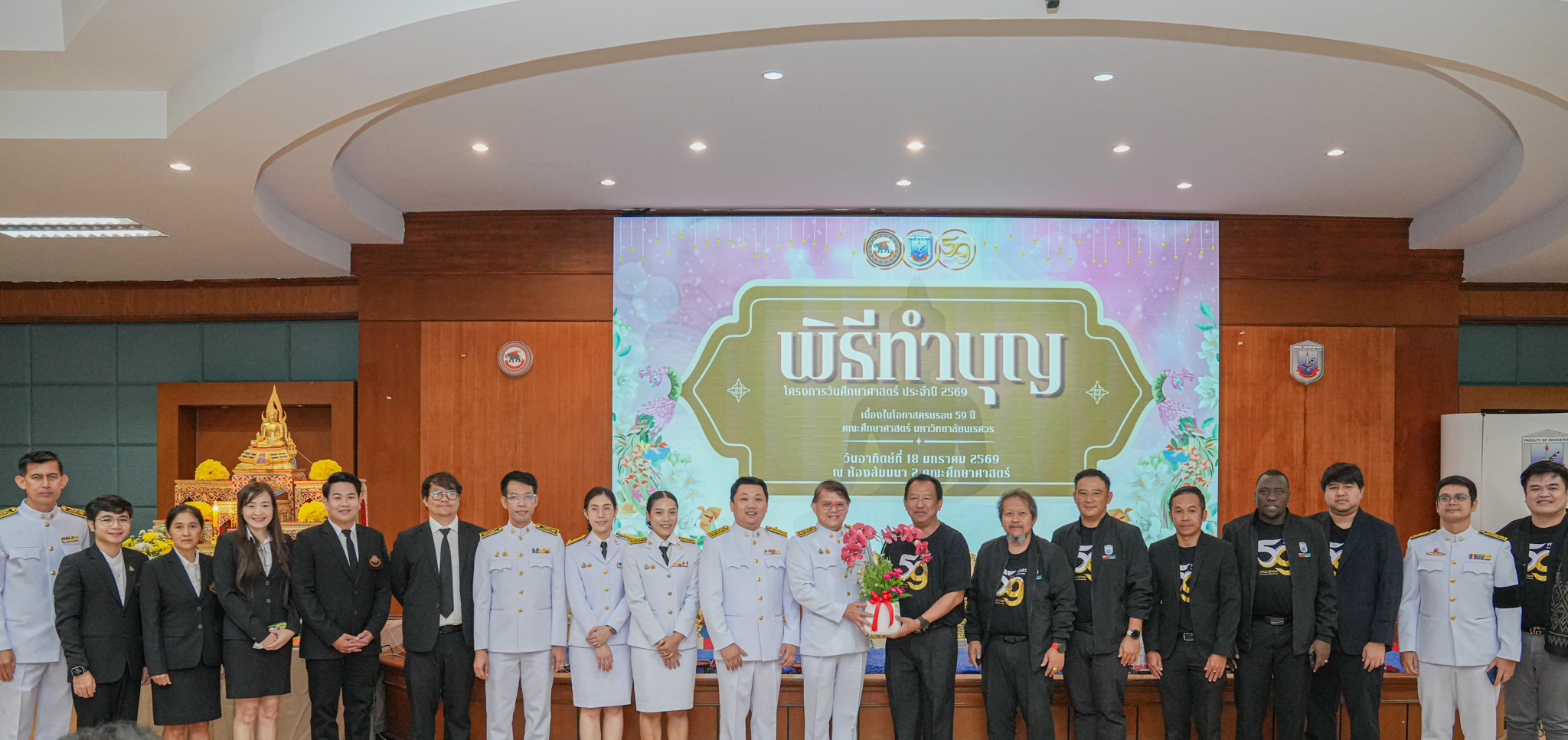 วันที่ 18 มกราคม 2569 รองศาสตราจารย์ ดร.สุขกิจ ยะโสธรศรีกุล คณบดีคณะวิทยาศาสตร์การแพทย์ พร้อมด้วย รองศาสตราจารย์ ดร.วรศักดิ์ แก้วก่อง รองคณบดีฝ่ายบริหารและส่งเสริมความยั่งยืน, ดร.หทัยชนก อิ่มเพ็ง รองคณบดีฝ่ายพัฒนานิสิต, ดร.สุภัทรา คันทรง ผู้ช่วยคณบดี และบุคลากรคณะวิทยาศาสตร์การแพทย์ มอบช่อดอกไม้แสดงความยินดี เนื่องในโอกาสครบรอบ 59 ปี คณะศึกษาศาสตร์ ณ ห้องสัมมนา 2 คณะศึกษาศาสตร์ มหาวิทยาลัยนเรศวร