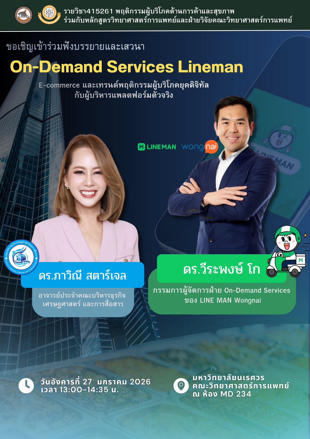 หลักสูตรวิทยาศาสตรบัณฑิต สาขาวิชาวิทยาศาสตร์การแพทย์ และฝ่ายวิจัย คณะวิทยาศาสตร์การแพทย์ ขอเชิญเข้าร่วมรับฟังการบรรยายพิเศษ หัวข้อ “On-Demand Services Lineman E-commerce และเทรนด์พฤติกรรมผู้บริโภคยุคดิจิทัลกับผู้บริหารแพลตฟอร์มตัวจริง”