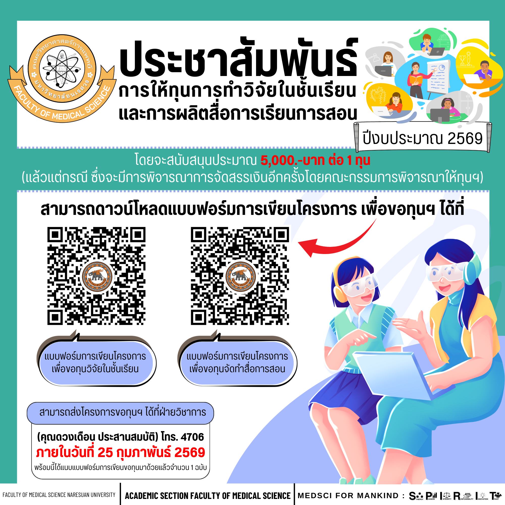 “การให้ทุนการทำวิจัยในชั้นเรียน และการผลิตสื่อการเรียนการสอน ปีงบประมาณ 2569”