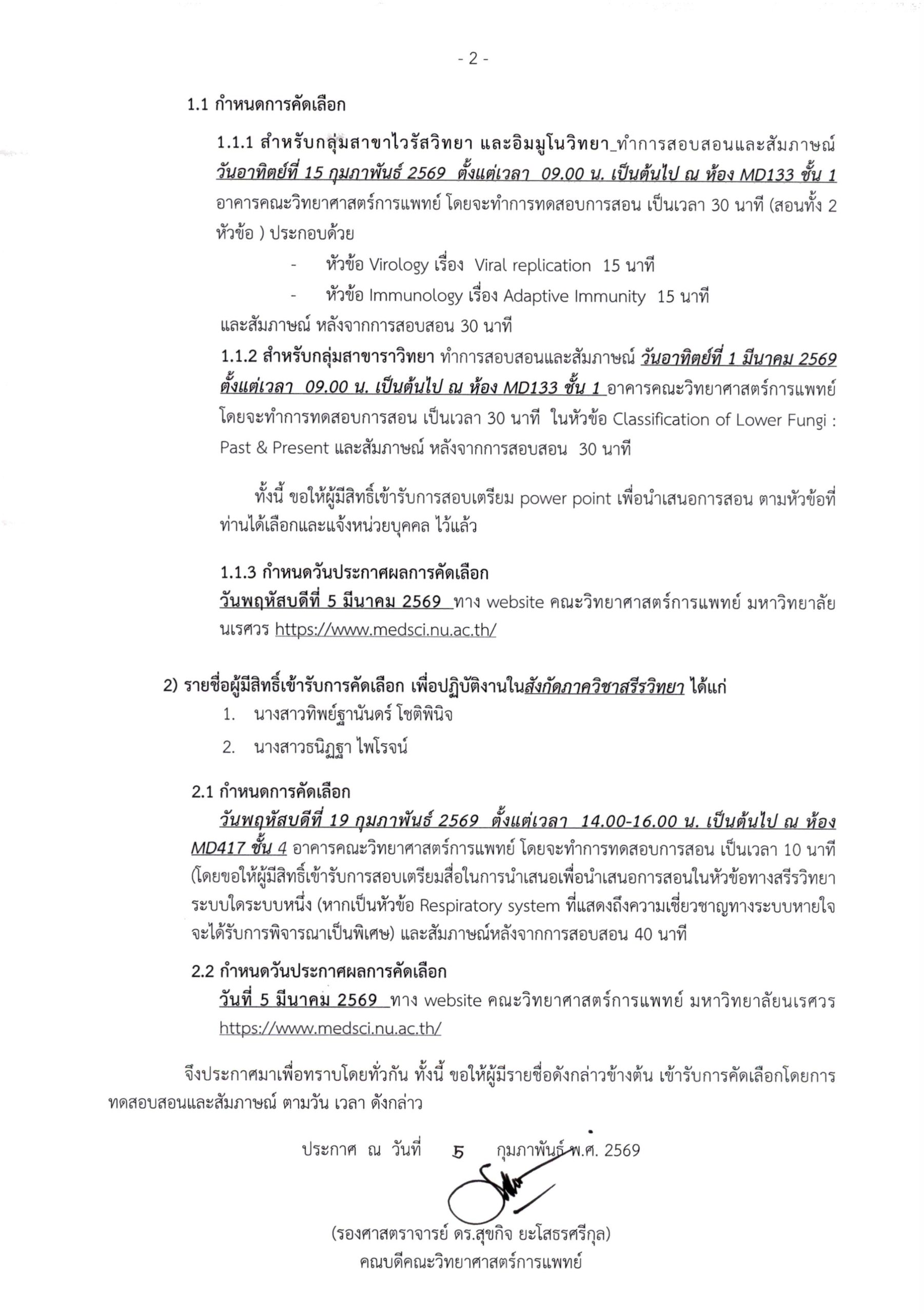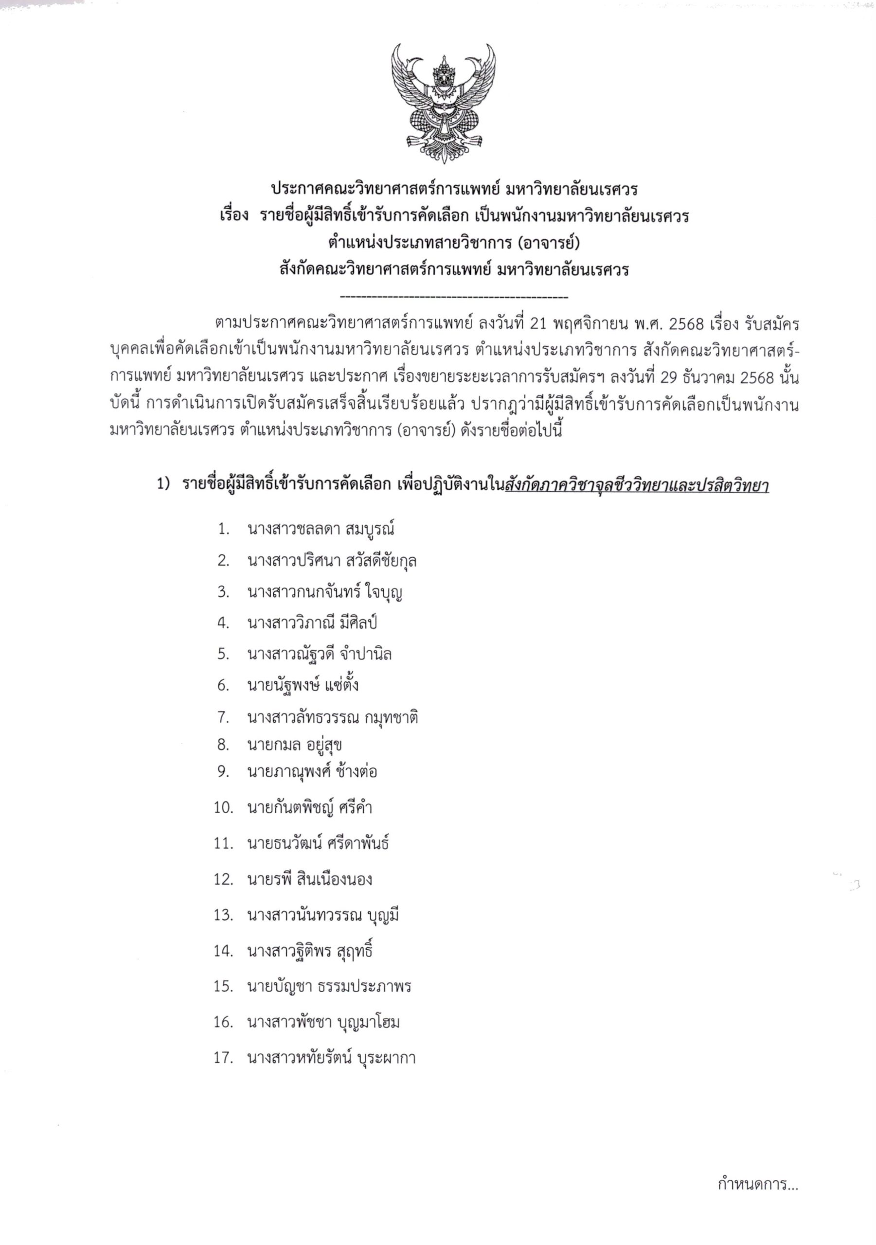 ประกาศคณะวิทยาศาสตร์การแพทย์ มหาวิทยาลัยนเรศวร เรื่องรายชื่อผู้มีสิทธิ์เข้ารับการคัดเลือก เป็นพนักงานมหาวิทยาลัยนเรศวร ตำแหน่งประเภทสายวิชาการ(อาจารย์) สังกัดคณะวิทยาศาสตร์การแพทย์ มหาวิทยาลัยนเรศวร