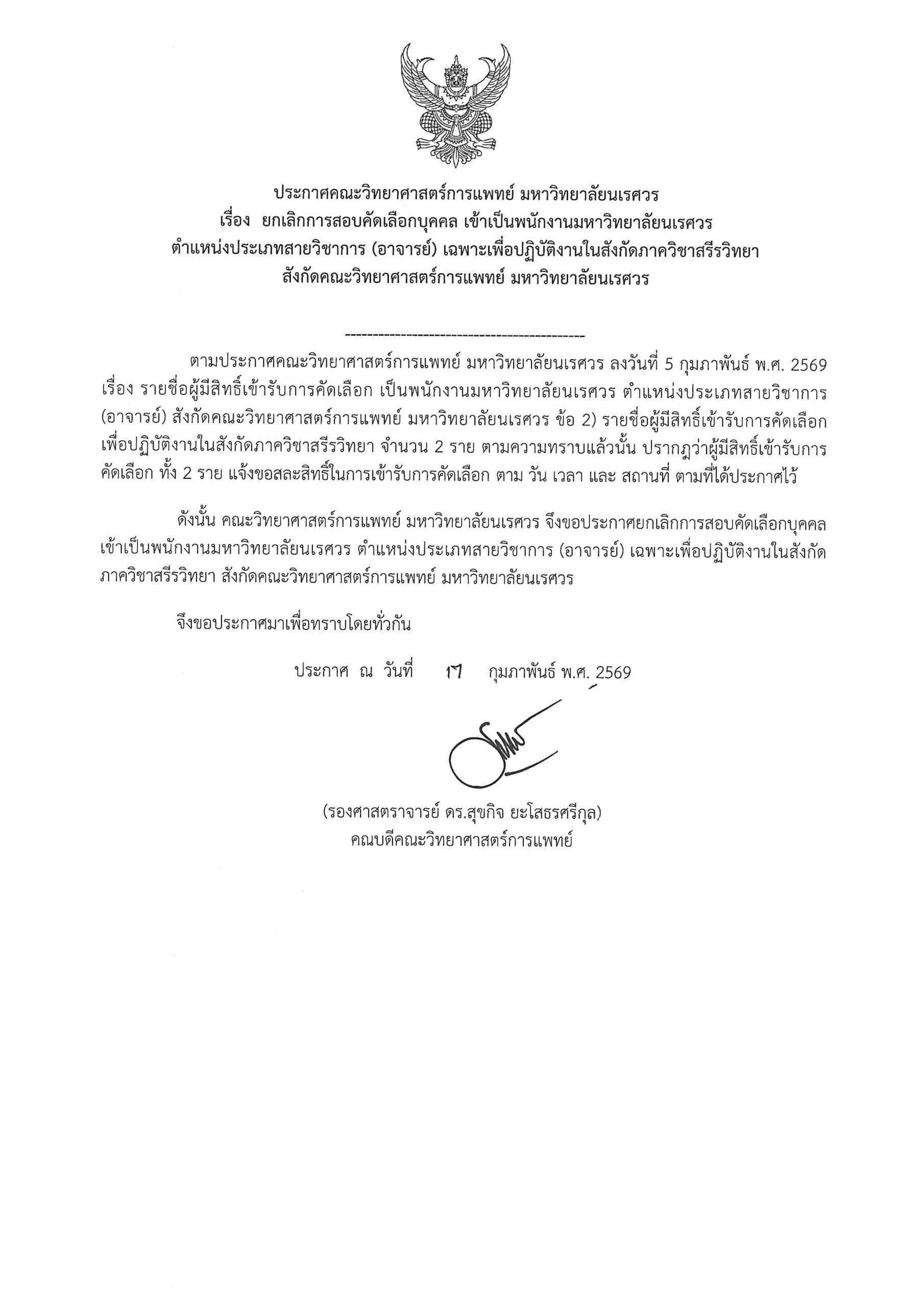 เรื่อง ยกเลิกการสอบคัดเลือกบุคคล เข้าเป็นพนักงานมหาวิทยาลัยนเรศวร