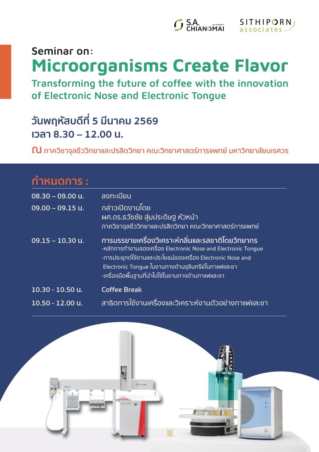 ภาควิชาจุลชีววิทยาและปรสิตวิทยา คณะวิทยาศาสตร์การแพทย์ ร่วมกับ บริษัท เอส.เอ.(เชียงใหม่) จำกัด และ บริษัท สิทธิพร แอสโซซิเอส จํากัด ขอเชิญชวนทุกท่านที่สนใจ เข้าร่วมกิจกรรมสัมมนา “Microorganisms Create Flavor Transforming the future of coffee with the innovation of Electronic Nose and Electronic Tongue”