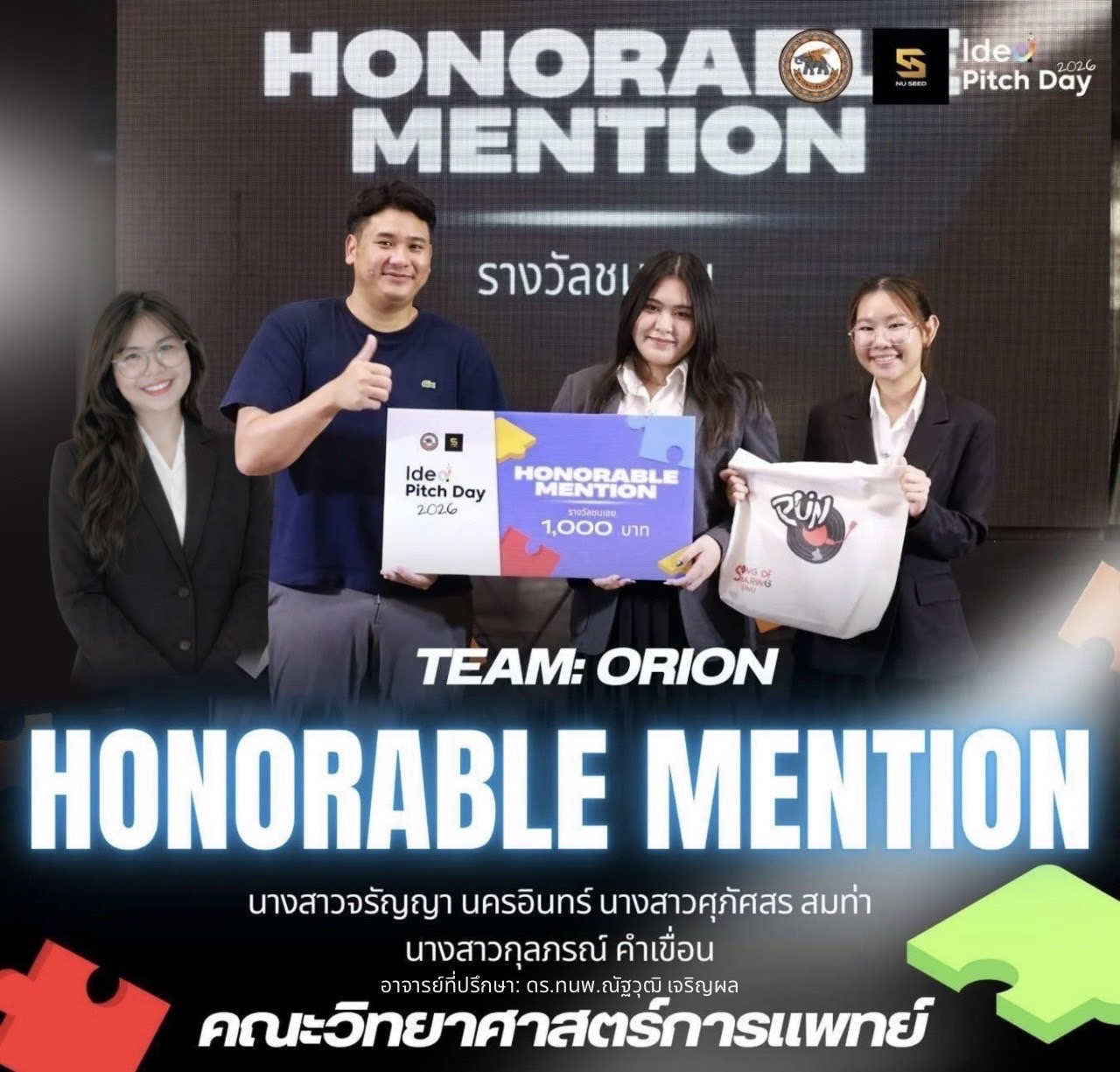 จากคณะวิทยาศาสตร์การแพทย์ ที่ได้รับ รางวัลชมเชย ในการแข่งขัน Idea Pitching Day 2026 งาน Startup Fun Fair ณ ห้อง Co-Working Space (New Creative Space) อาคารเฉลิมพระเกียรติ 72 พรรษา บรมราชินีนาถ (QS) มหาวิทยาลัยนเรศวร