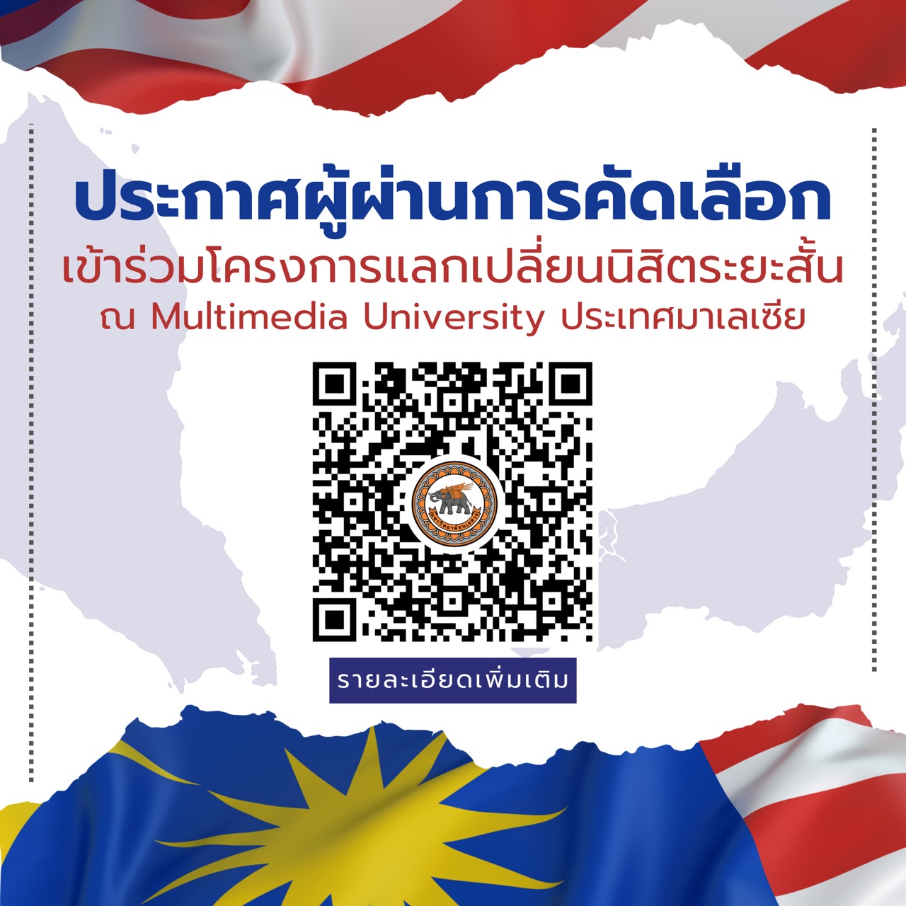 ขอแสดงความยินดีกับนิสิตที่ผ่านการคัดเลือกเข้าร่วมโครงการแลกเปลี่ยนนิสิตระยะสั้น แบบขาออก ณ Multimedia University ประเทศมาเลเซีย โดยจะเดินทางร่วมโครงการในวันที่ 10 – 23 พฤษภาคม 2569