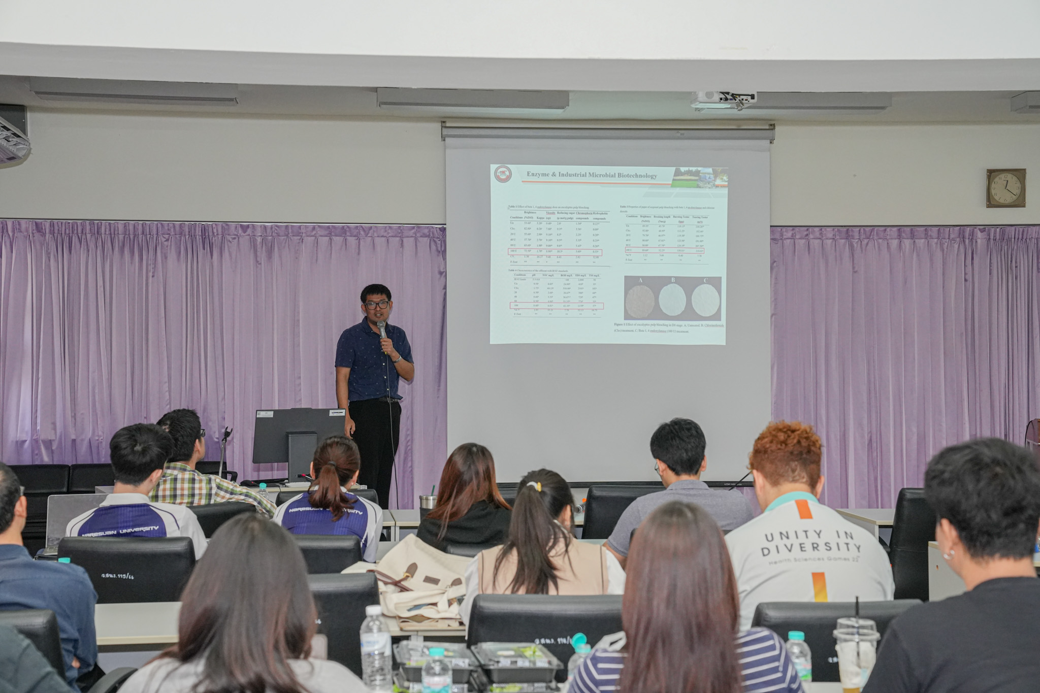 ในครั้งนี้ ได้รับเกียรติจาก ดร.วสันต์ สีมาคราม (อาจารย์ประจำภาควิชาจุลชีววิทยาและปรสิตวิทยา) มาบรรยาย ในหัวข้อ “นวัตกรรมทางการเกษตรจากจุลินทรีย์: จากเทคโนโลยีเอนไซม์สู่การเพิ่มประสิทธิภาพพืช” โดยได้นำเสนอองค์ความรู้เกี่ยวกับการประยุกต์ใช้จุลินทรีย์และเทคโนโลยีเอนไซม์ในการพัฒนาภาคการเกษตร เพื่อเพิ่มประสิทธิภาพการเจริญเติบโตของพืช และส่งเสริมความยั่งยืนทางการเกษตร ซึ่งสามารถต่อยอดสู่การวิจัยและนวัตกรรมในอนาคตได้อย่างมีศักยภาพ