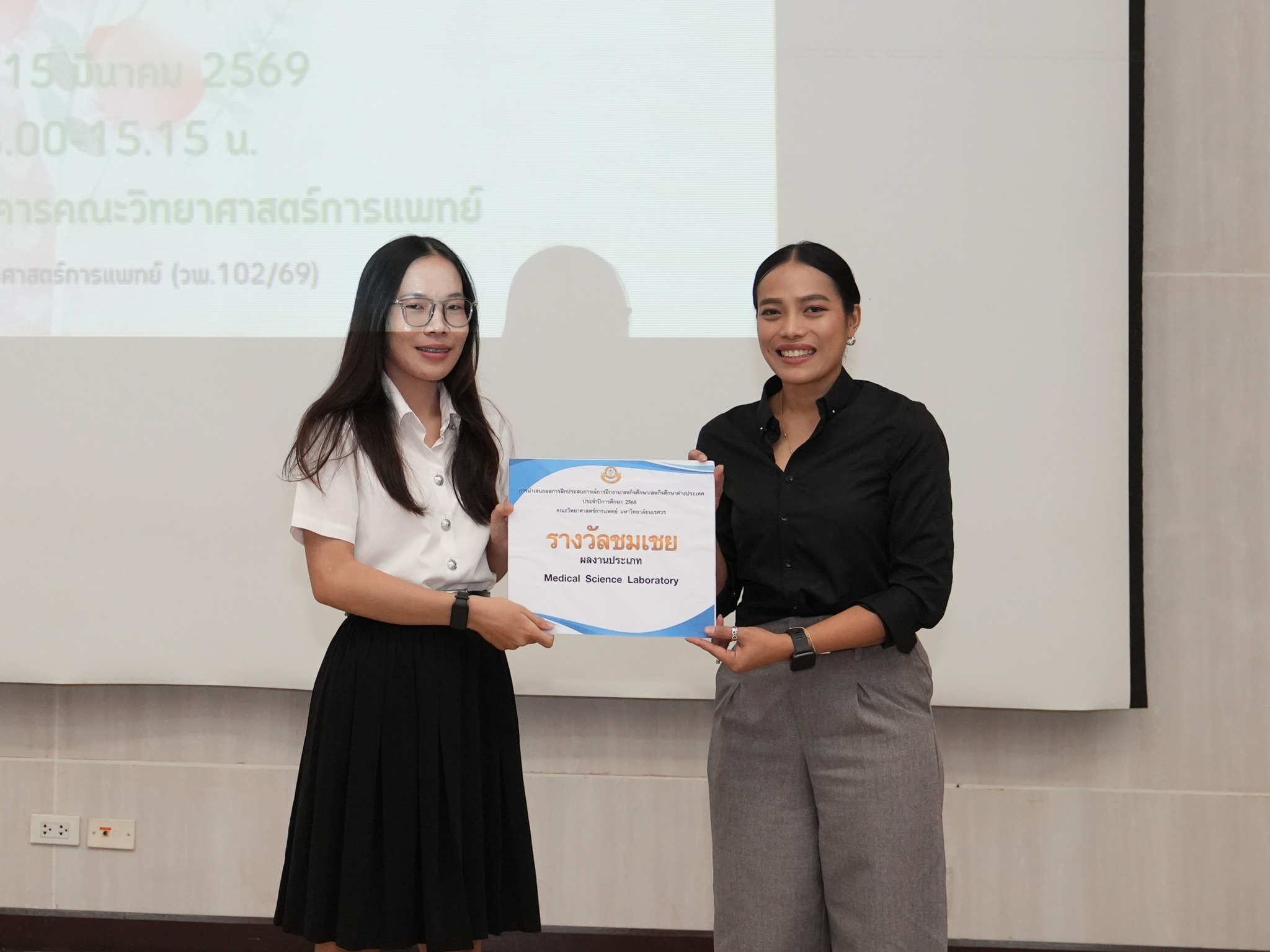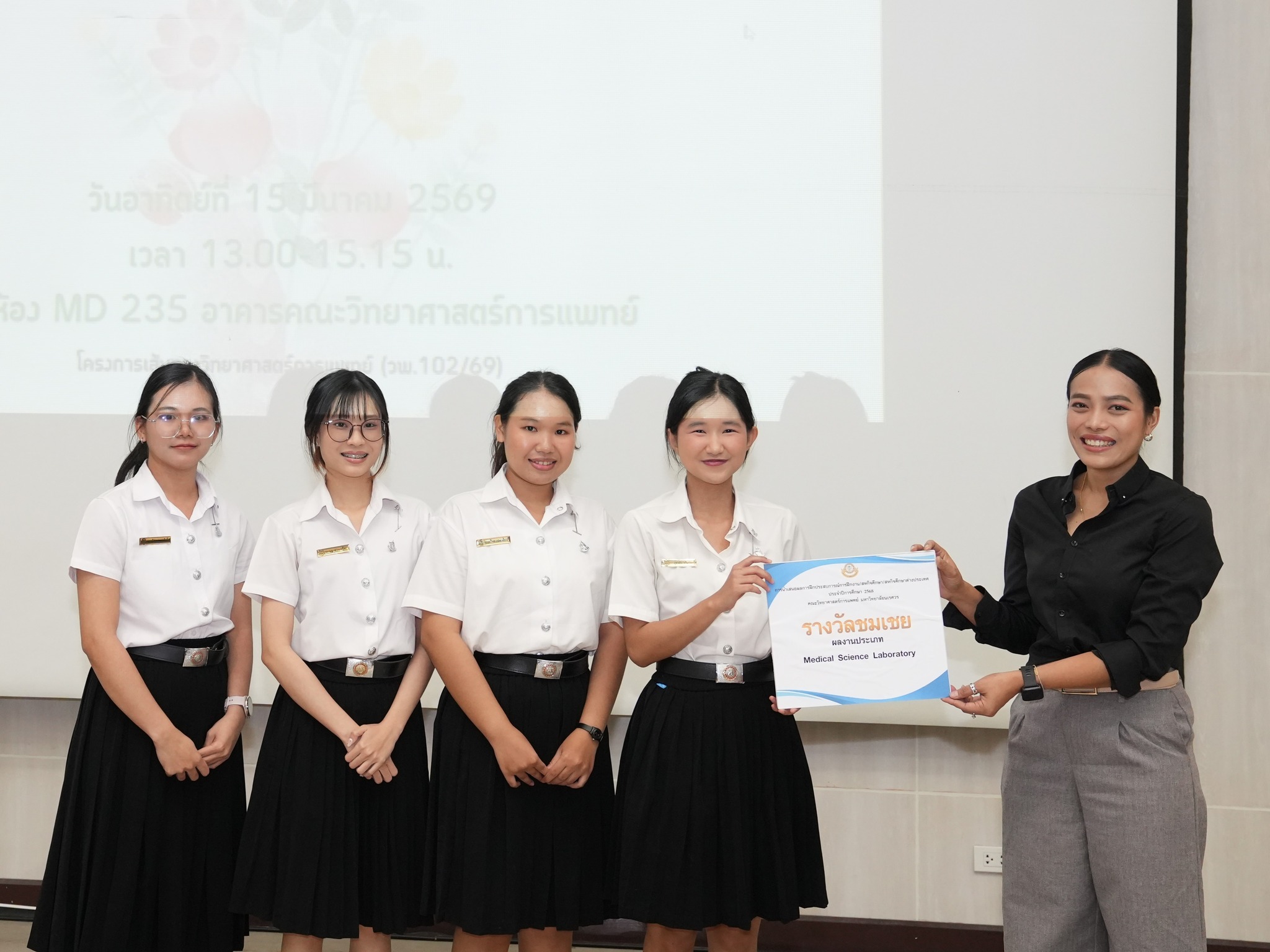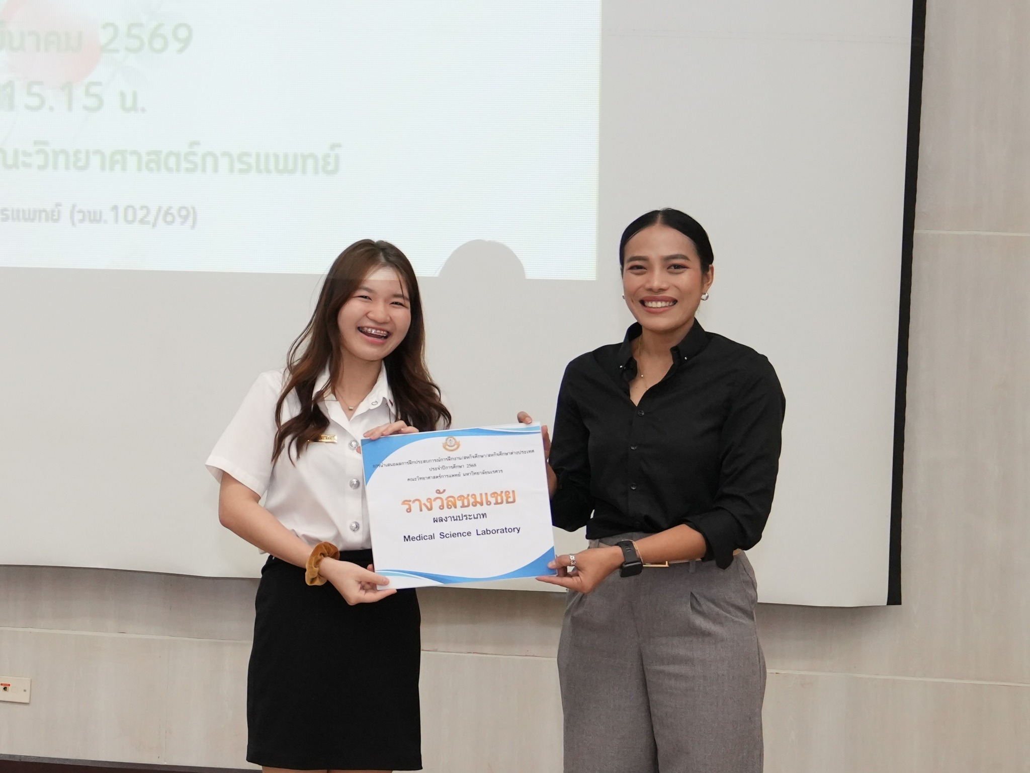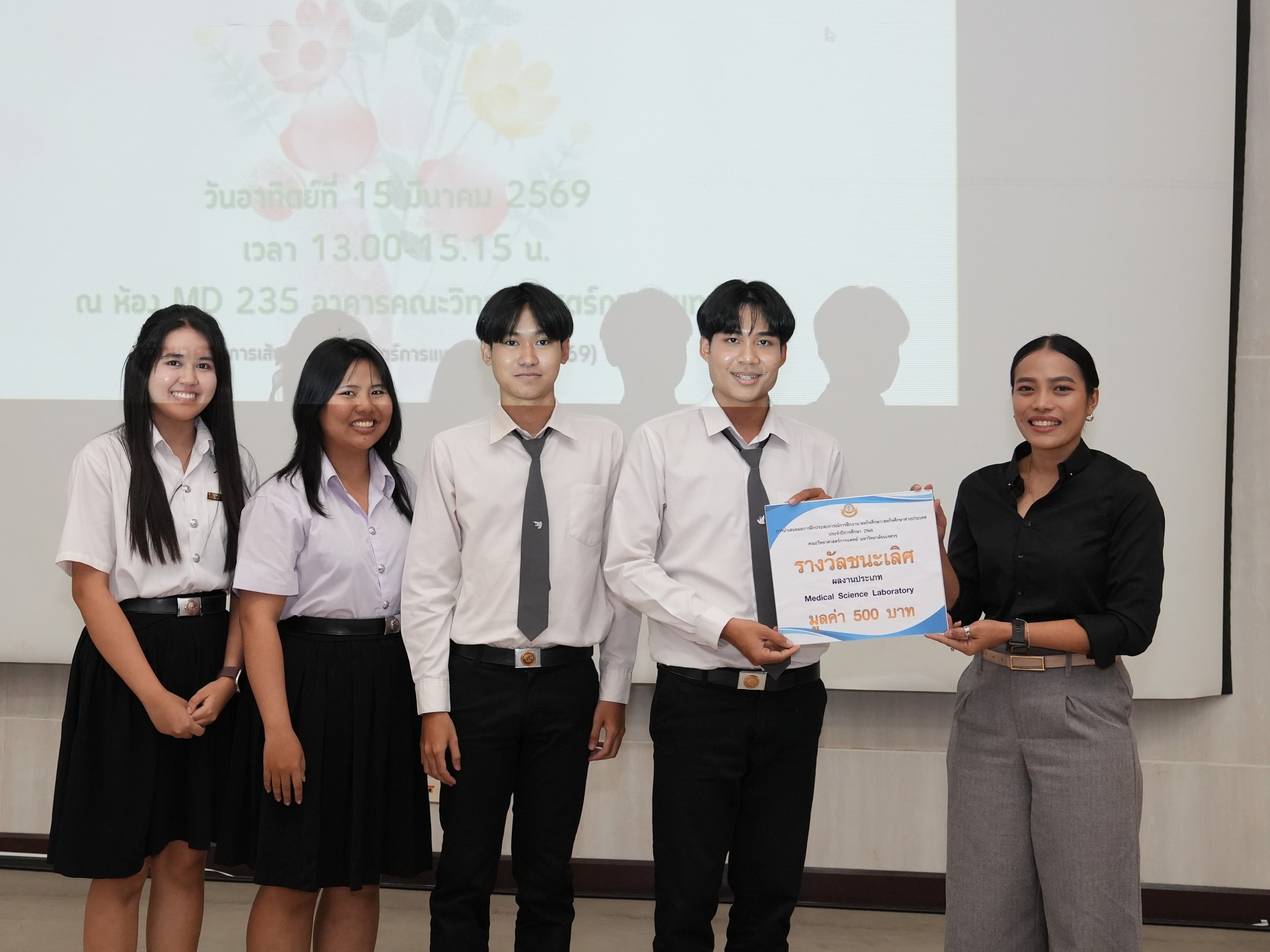 กับนิสิตหลักสูตรวิทยาศาสตรบัณฑิต สาขาวิชาวิทยาศาสตร์การแพทย์ ชั้นปีที่ 4 ที่ได้รับรางวัลการนำเสนอผลงานสหกิจศึกษา ภาคเรียนปลาย ปีการศึกษา 2568