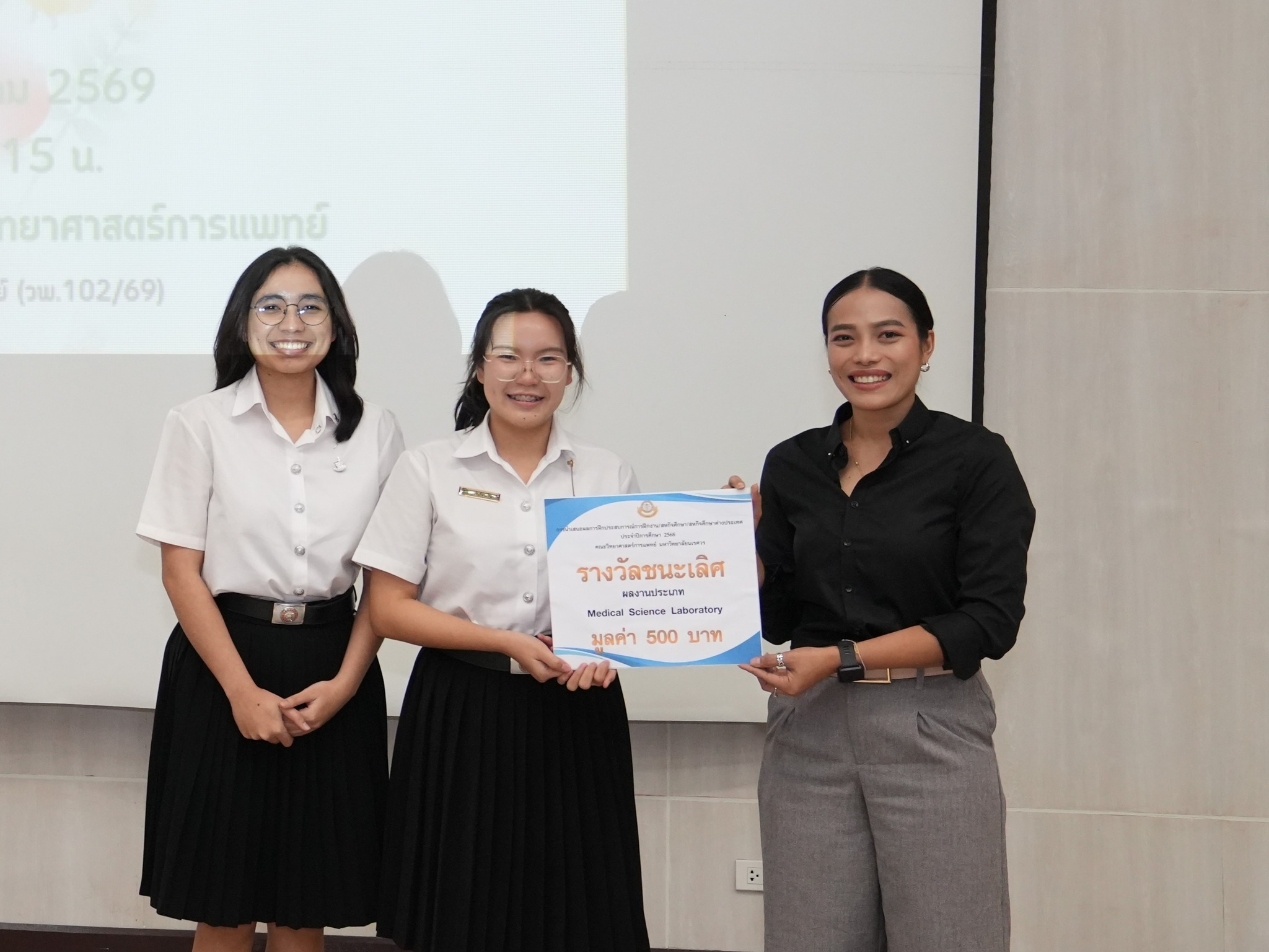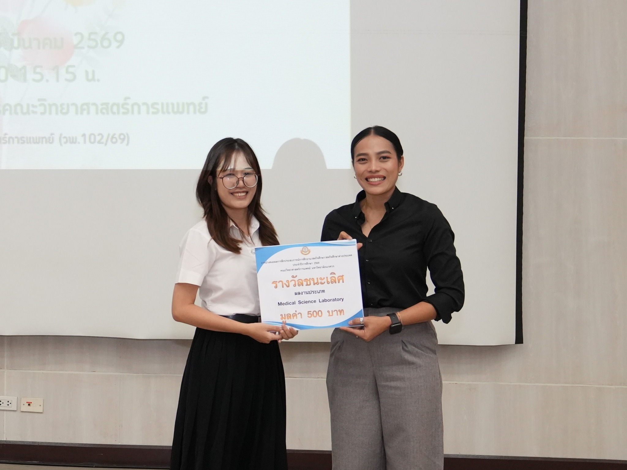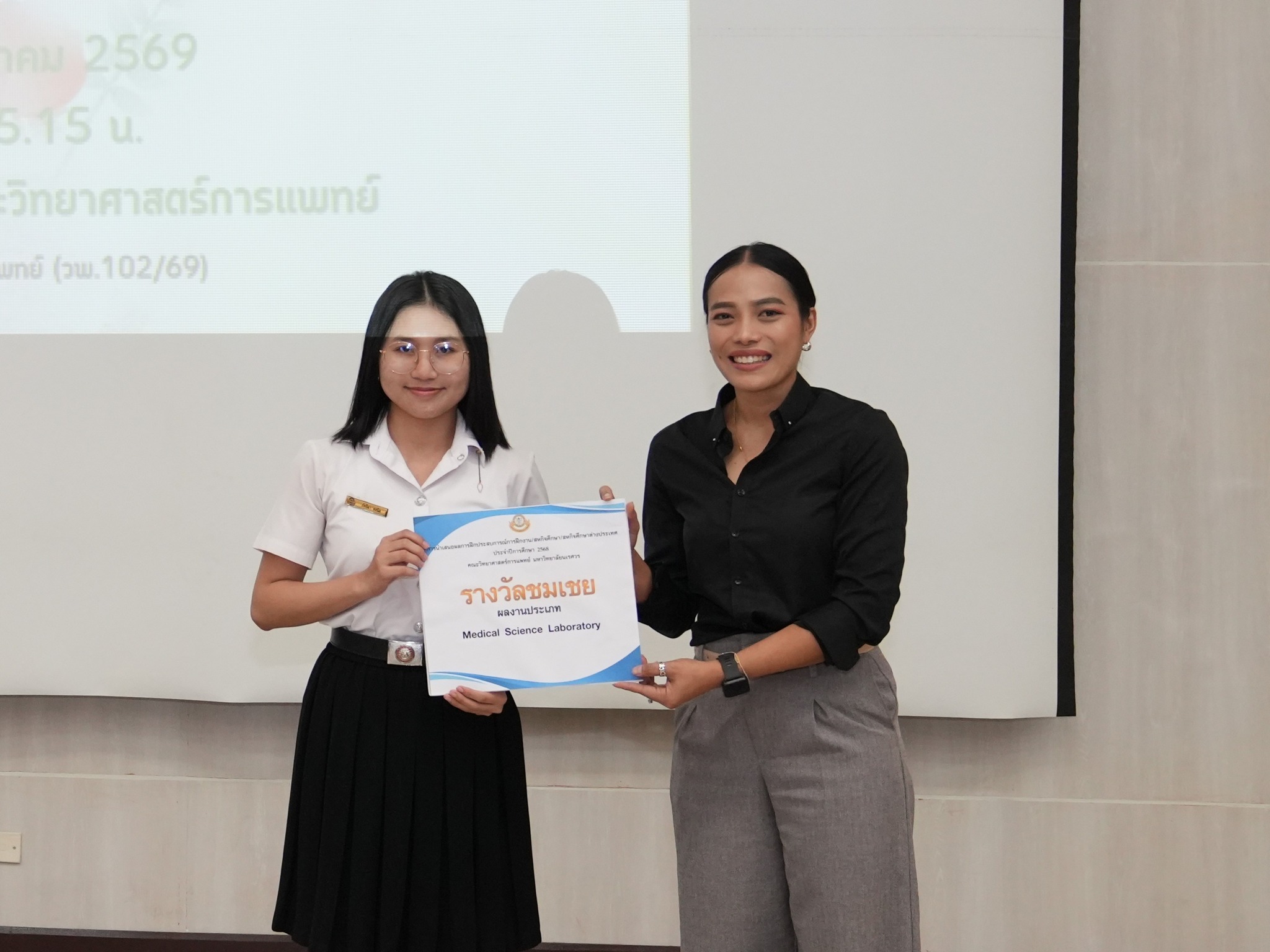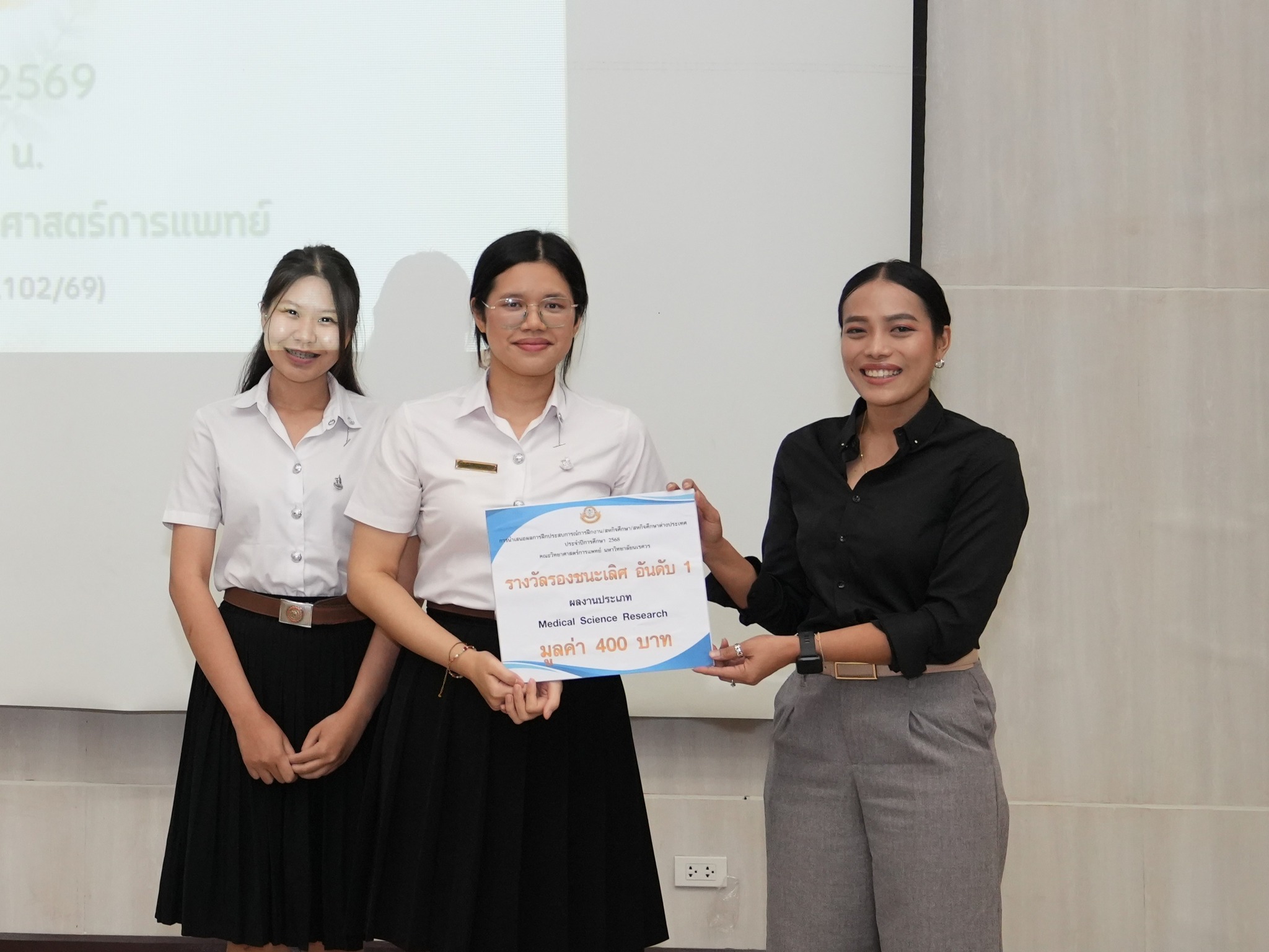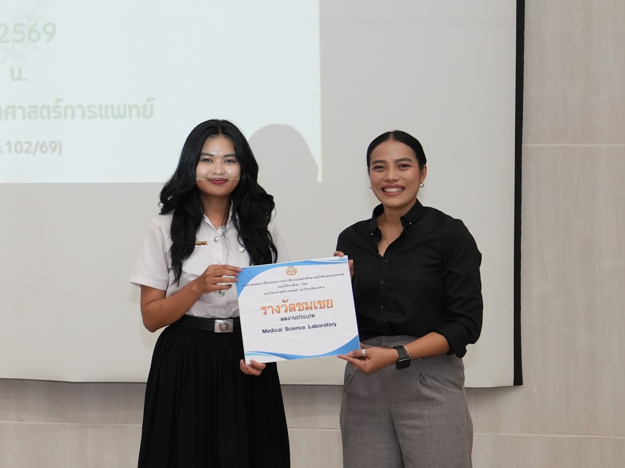 กับนิสิตหลักสูตรวิทยาศาสตรบัณฑิต สาขาวิชาวิทยาศาสตร์การแพทย์ ชั้นปีที่ 4 ที่ได้รับรางวัลการนำเสนอผลงานสหกิจศึกษา ภาคเรียนปลาย ปีการศึกษา 2568