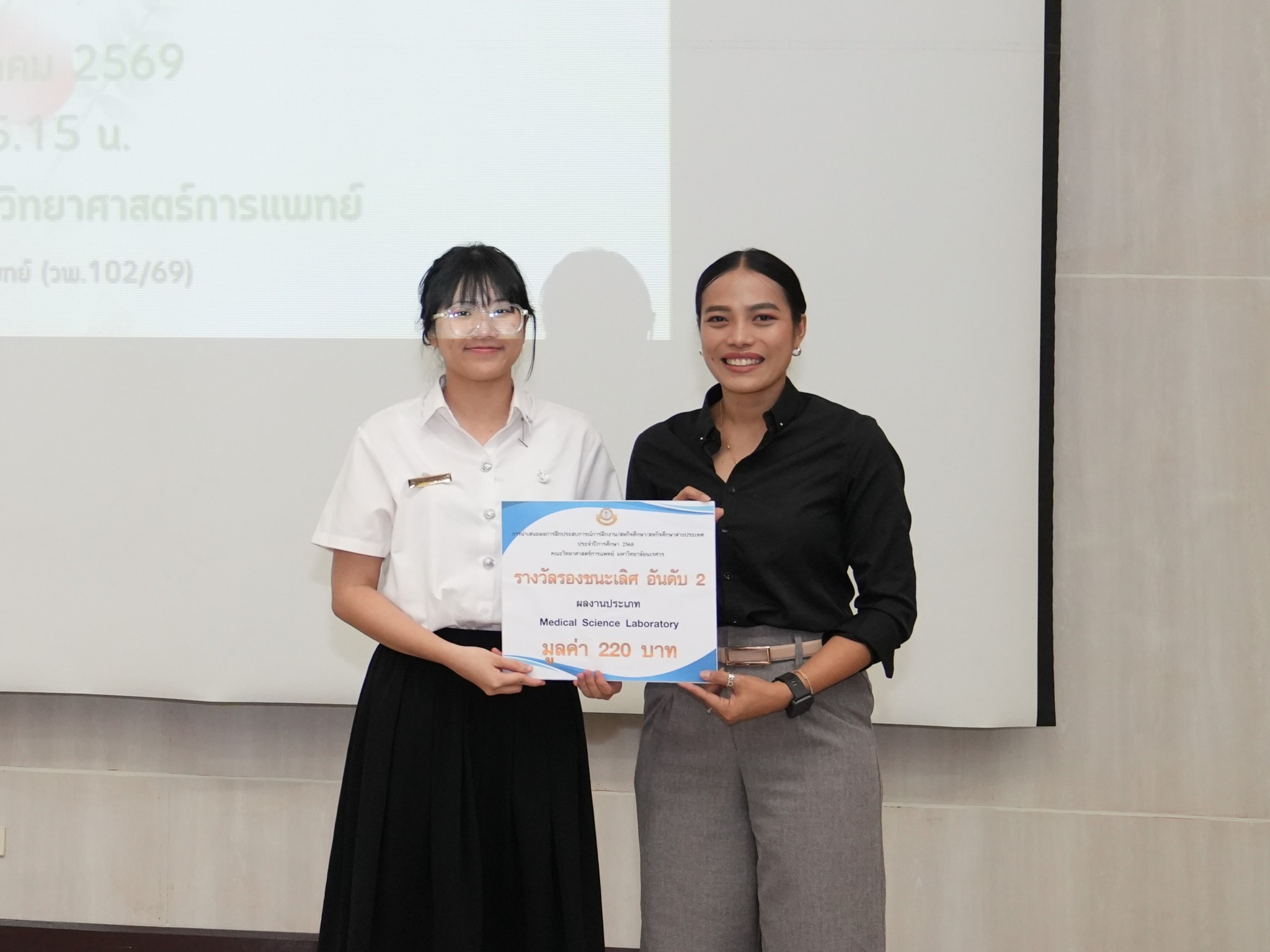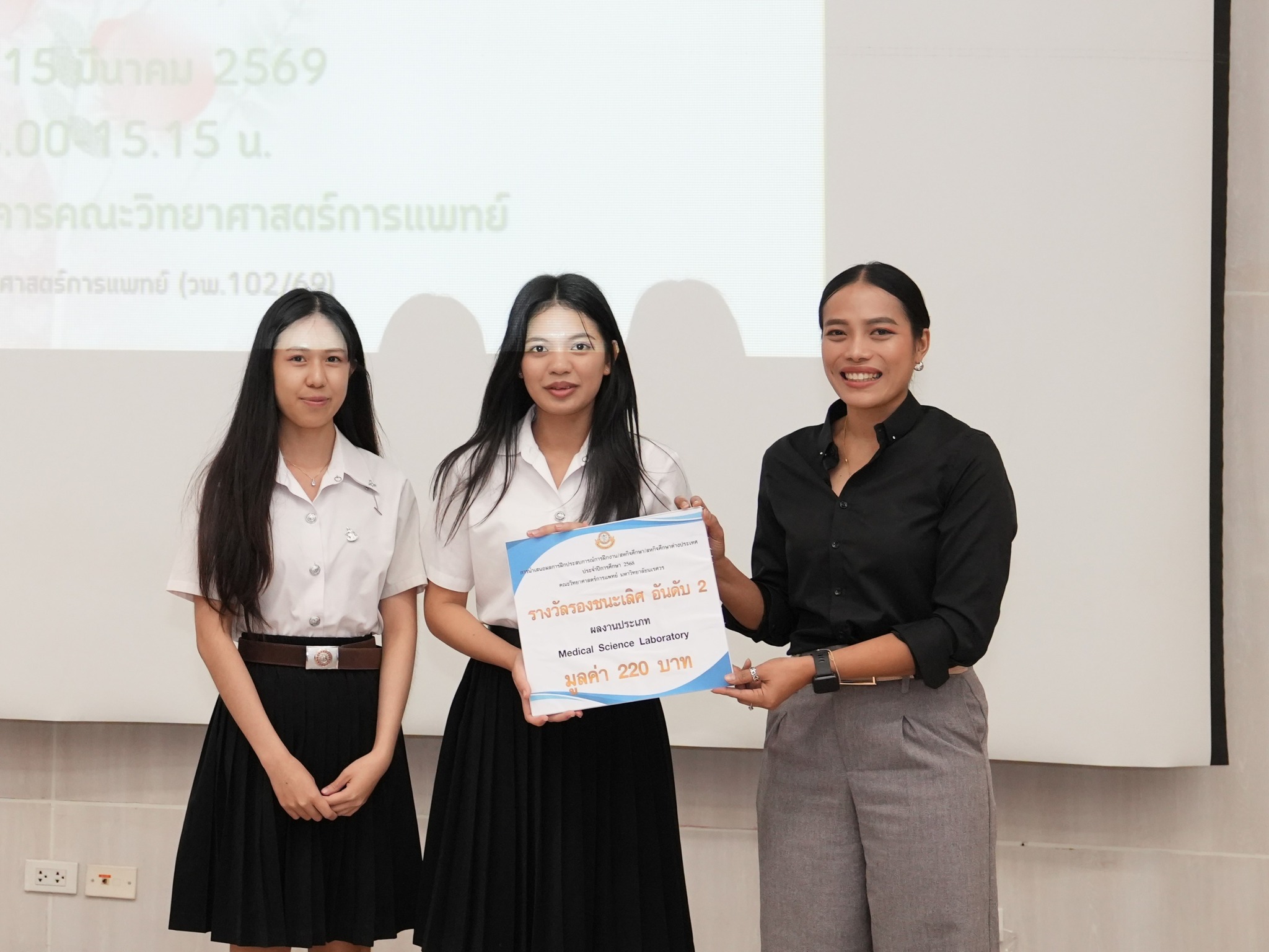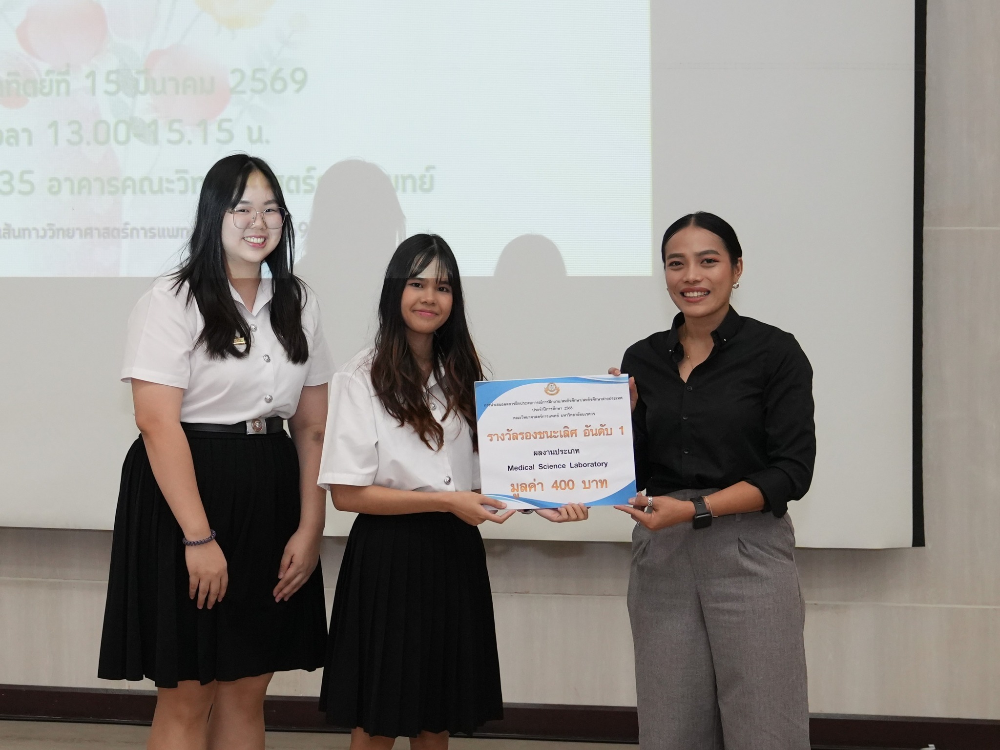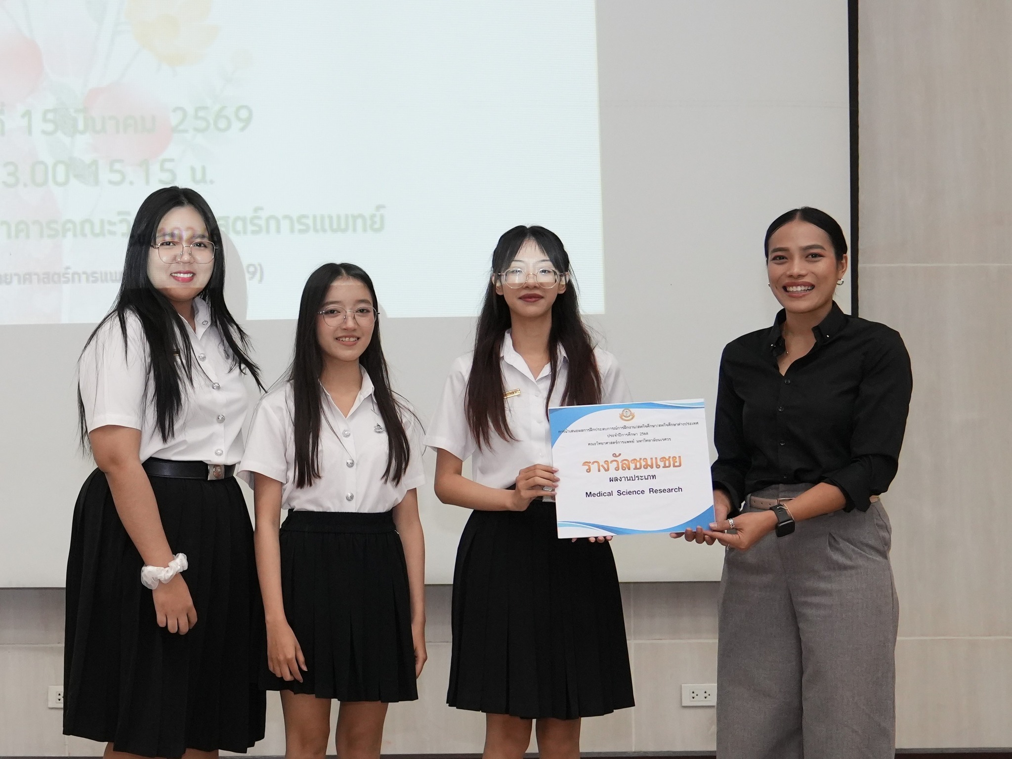 กับนิสิตหลักสูตรวิทยาศาสตรบัณฑิต สาขาวิชาวิทยาศาสตร์การแพทย์ ชั้นปีที่ 4 ที่ได้รับรางวัลการนำเสนอผลงานสหกิจศึกษา ภาคเรียนปลาย ปีการศึกษา 2568