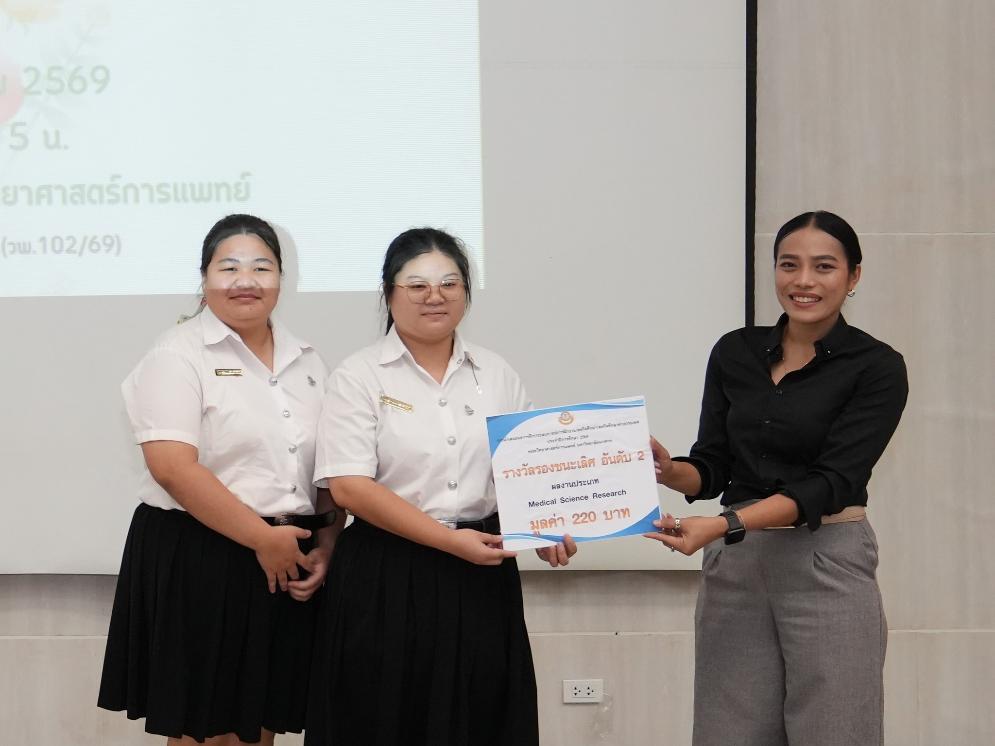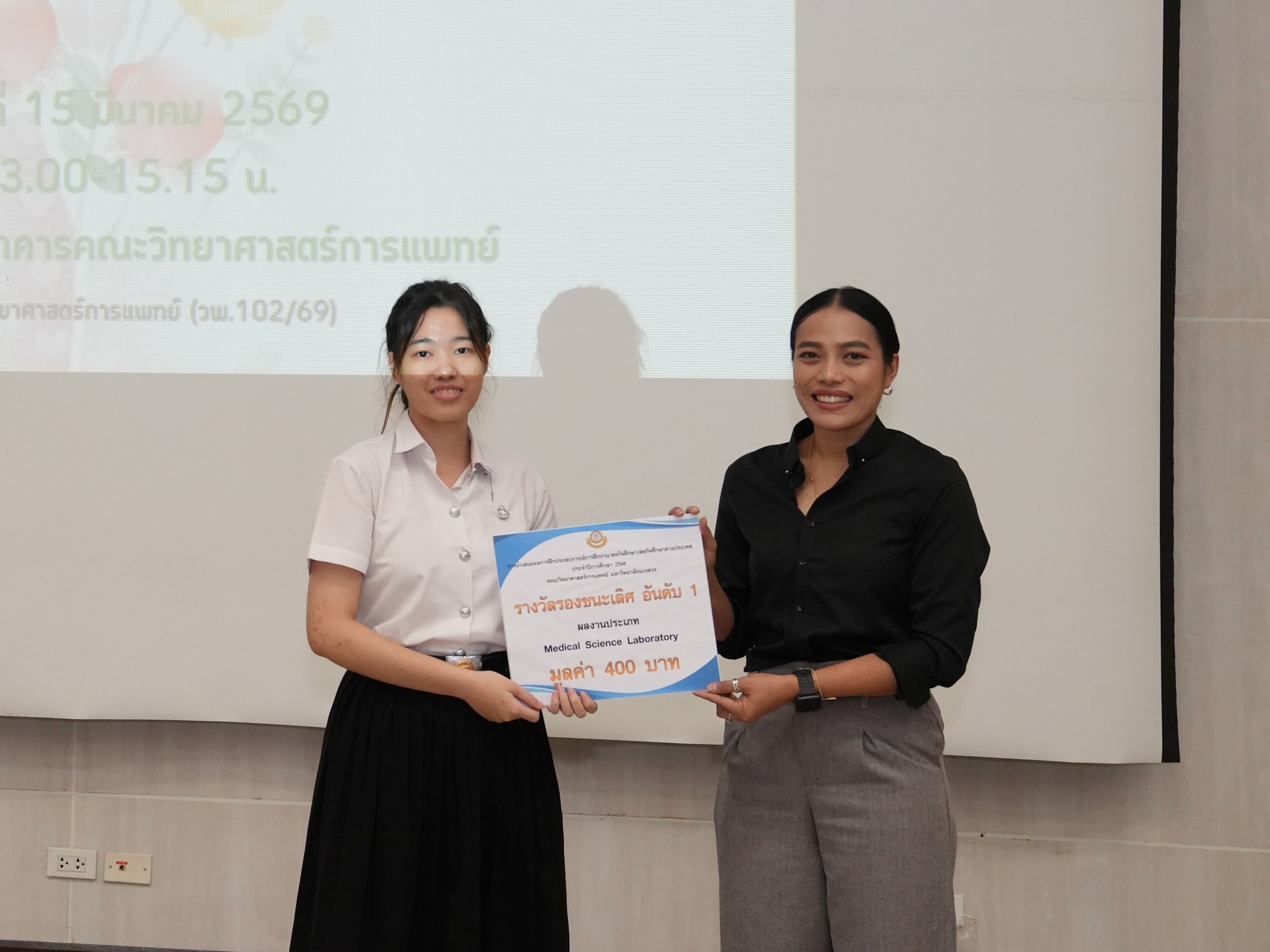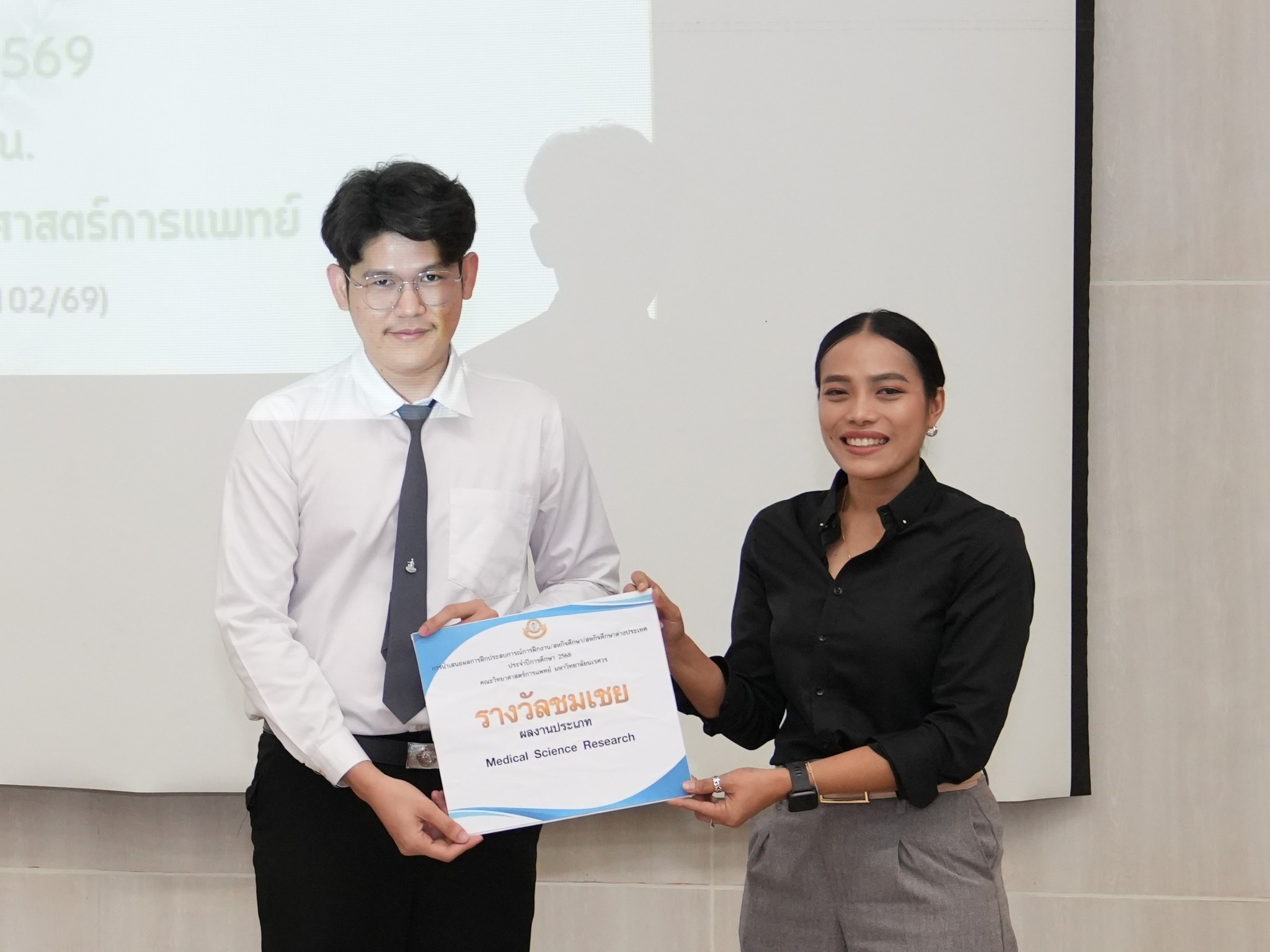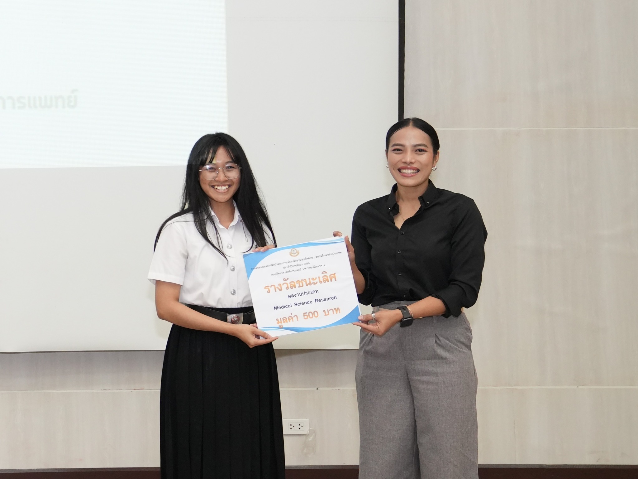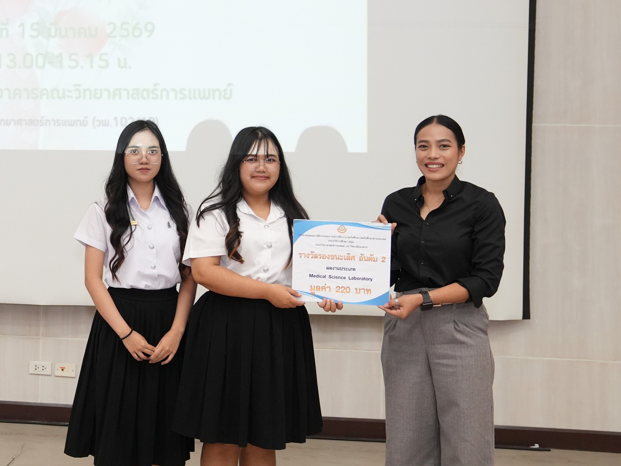 กับนิสิตหลักสูตรวิทยาศาสตรบัณฑิต สาขาวิชาวิทยาศาสตร์การแพทย์ ชั้นปีที่ 4 ที่ได้รับรางวัลการนำเสนอผลงานสหกิจศึกษา ภาคเรียนปลาย ปีการศึกษา 2568