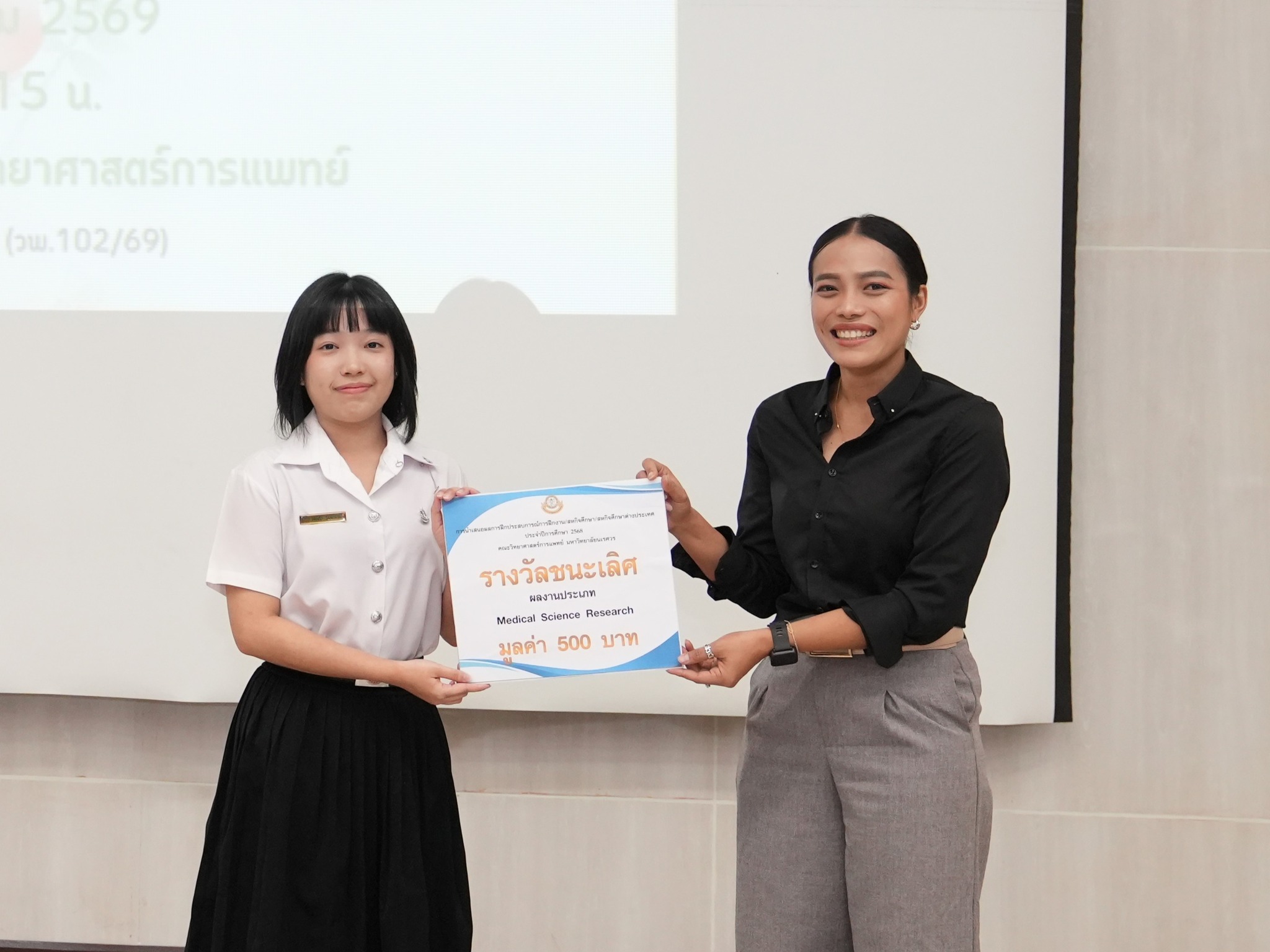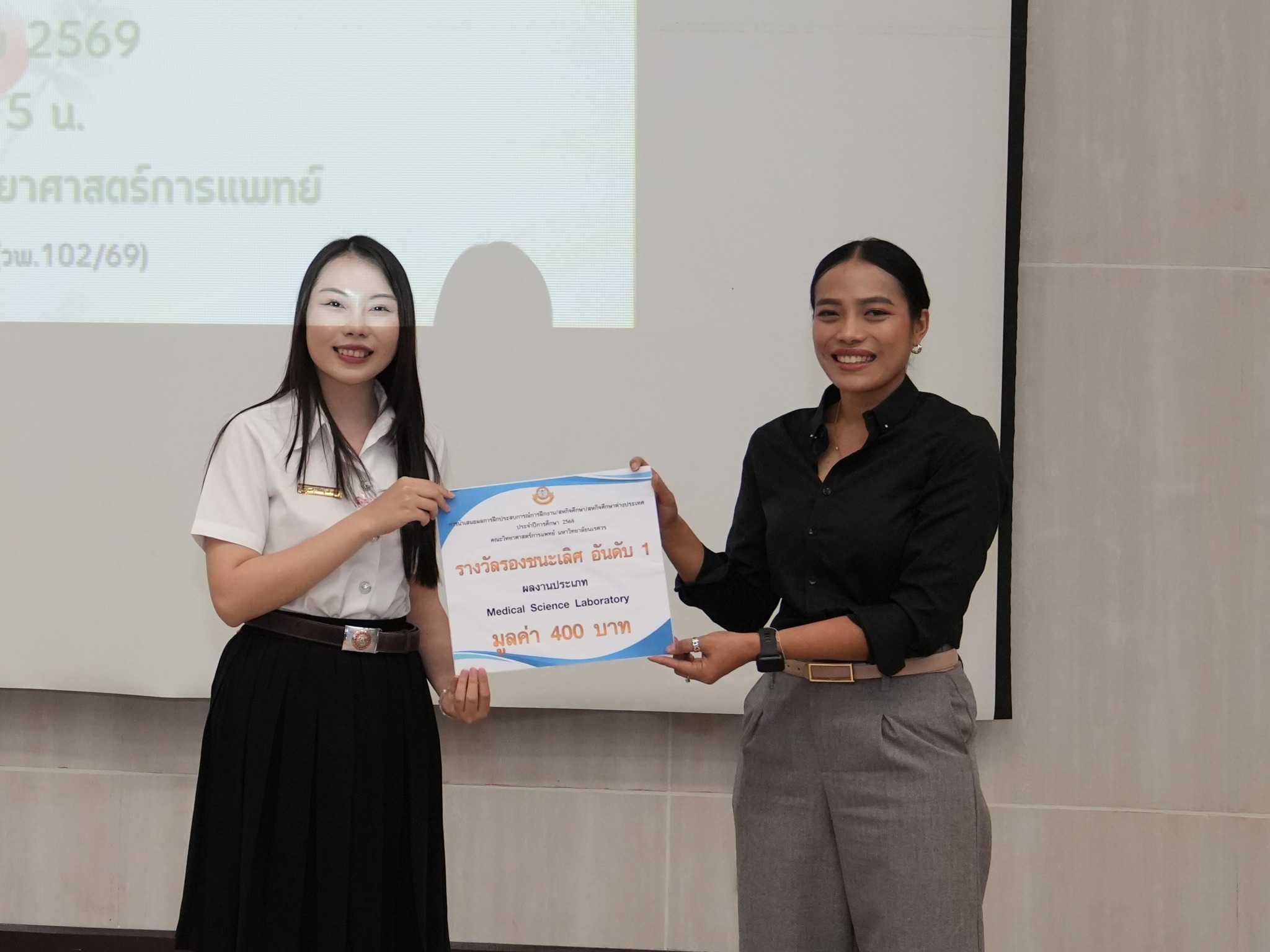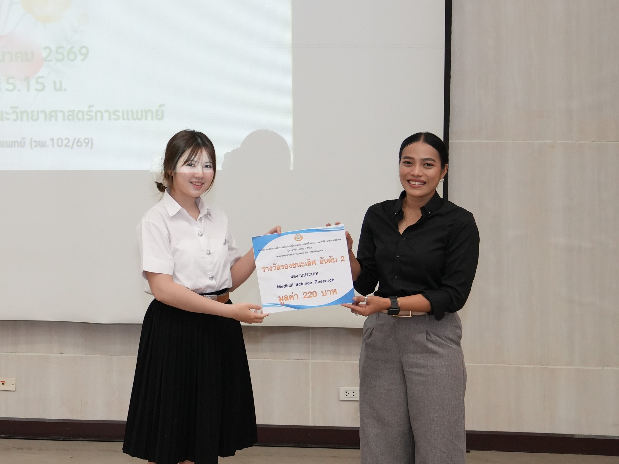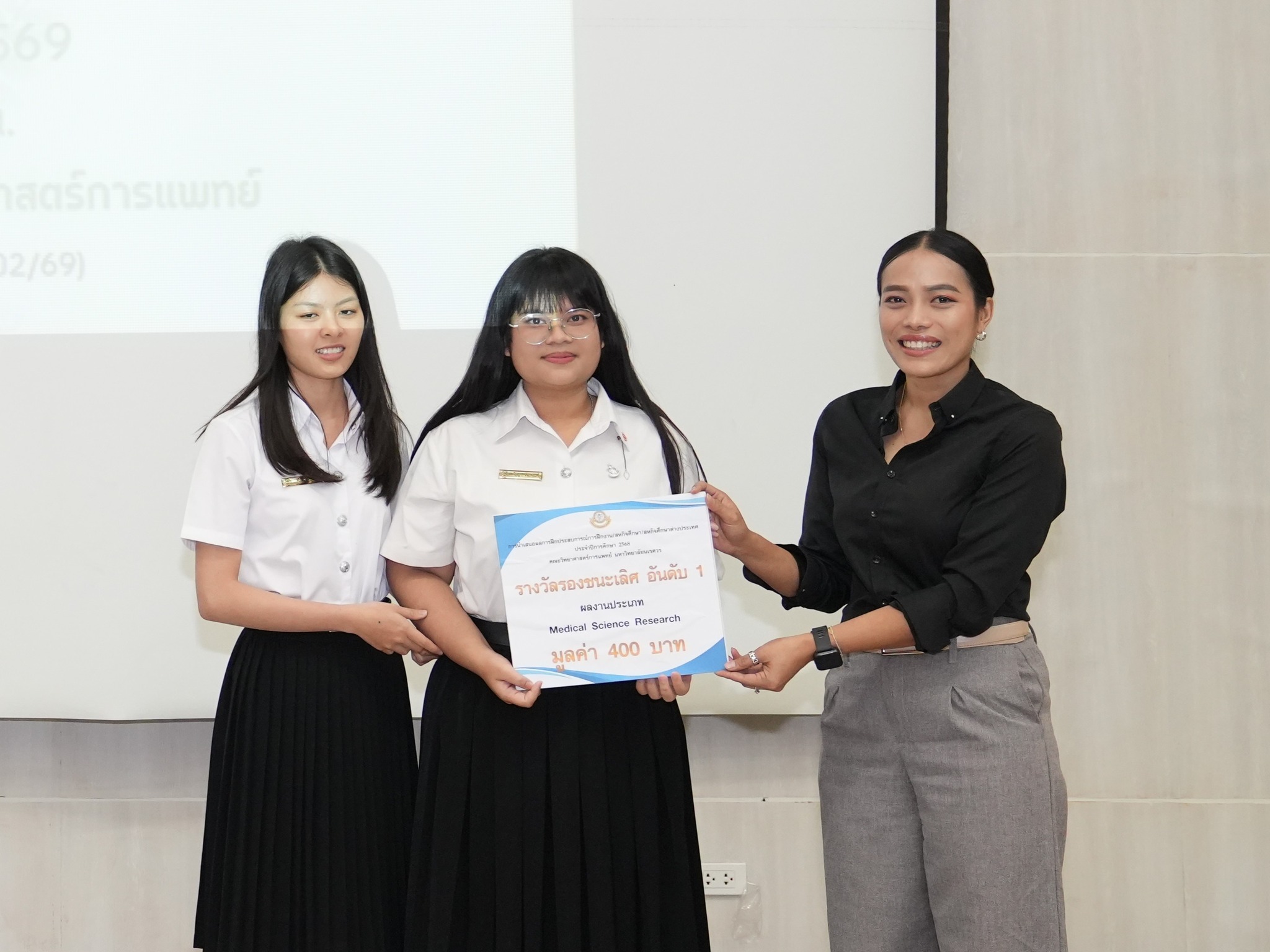 กับนิสิตหลักสูตรวิทยาศาสตรบัณฑิต สาขาวิชาวิทยาศาสตร์การแพทย์ ชั้นปีที่ 4 ที่ได้รับรางวัลการนำเสนอผลงานสหกิจศึกษา ภาคเรียนปลาย ปีการศึกษา 2568