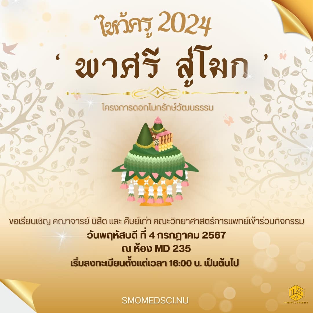 ขอเชิญชวน คณาจารย์ นิสิต และ ศิษย์เก่า คณะวิทยาศาสตร์การแพทย์ทุกท่านเข้าร่วมงานพิธีไหว้ครู 2024 ‘พาศรี สู่โมก‘