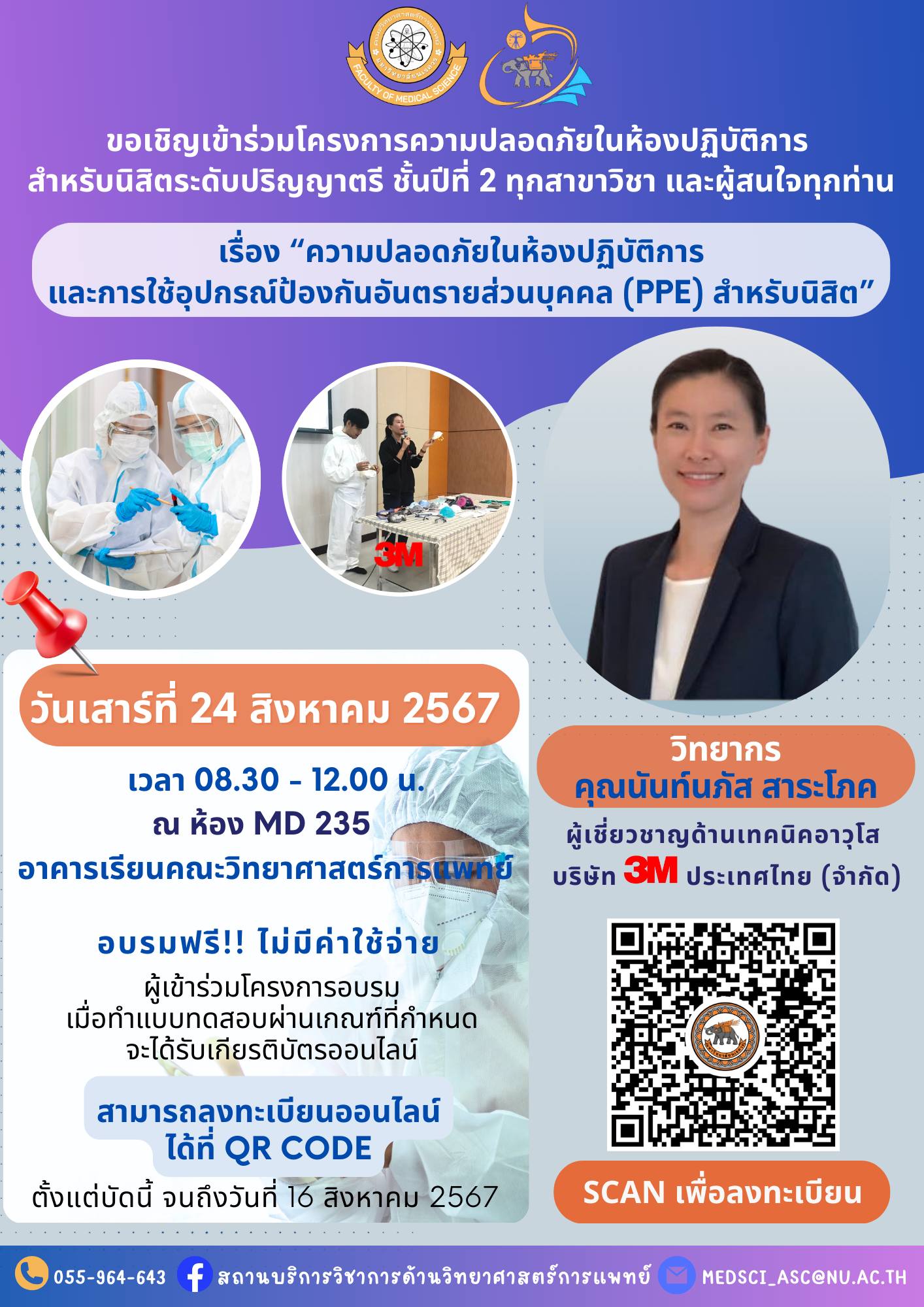 ขอเชิญนิสิตระดับปริญญาตรี (ชั้นปีที่ 2) #หลักสูตรของคณะวิทยาศาสตร์การแพทย์ทุกสาขาวิชา และผู้สนใจทุกท่านเข้าร่วมโครงการความปลอดภัยในห้องปฏิบัติการ หัวข้อเรื่อง “ความปลอดภัยในห้องปฏิบัติการและการใช้อุปกรณ์ป้องกันอันตรายส่วนบุคคล (PPE) สำหรับนิสิต”