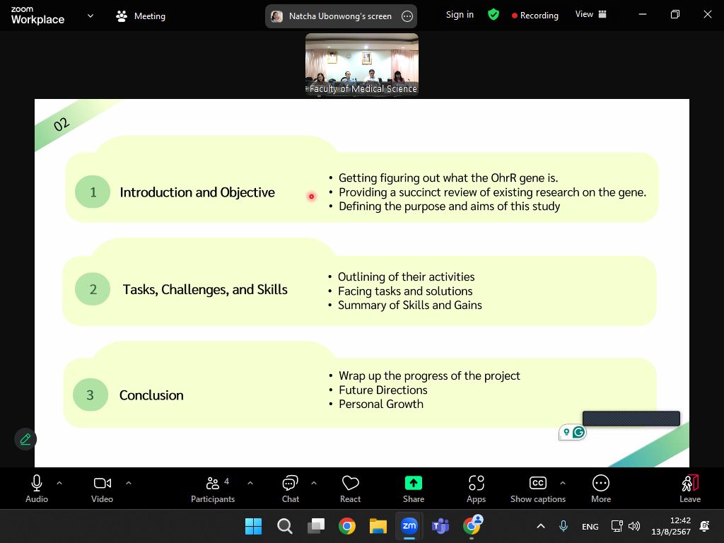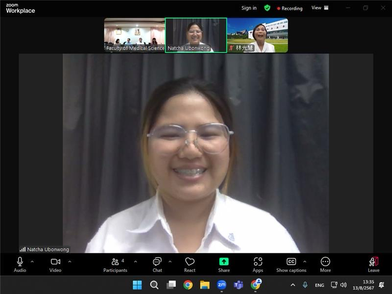 วันที่ 13 สิงหาคม 2567 ฝ่ายวิชาการ คณะวิทยาศาสตร์การแพทย์ จัดกิจกรรมนิเทศนิสิตสหกิจศึกษาต่างประเทศ ในรูปแบบออนไลน์ เพื่อติดตามนิสิตคณะวิทยาศาสตร์การแพทย์ ชั้นปีที่ 4 ได้แก่ น.ส.ณัชชา อุบลวงศ์ รหัสนิสิต 64521167 สาขาวิชาวิทยาศาสตร์การแพทย์(ปริญญาตรีต่อเนื่องโท) ซึ่งได้รับทุนโครงการแลกเปลี่ยนนิสิตมหาวิทยาลัยนเรศวร เพื่อการเทียบโอนหน่วยกิต (Outbound Students under Credit Transfer) ประจำปีงบประมาณ 2567 โดยมหาวิทยาลัยสนับสนุนค่าตั๋วเครื่องบินโดยสารระหว่างประเทศไป-กลับ (กรุงเทพฯ – ไต้หวัน) และได้รับทุนสนับสนุนโครงการสหกิจศึกษาต่างประเทศ ของคณะวิทยาศาสตร์การแพทย์ ประจำปีการศึกษา 2567 ระหว่างวันที่ 24 พฤษภาคม – 12 กันยายน 2567 ภายใต้การกำกับดูแลของ Professor Dr.Guang-Huey Lin (Department of Biomedical Sciences and Engineering) โดยมี รศ.ดร.สุขกิจ ยะโสธรศรีกุล คณบดีคณะวิทยาศาสตร์การแพทย์ พร้อมด้วย รศ.ดร.รักษิณา พลสีลา รองคณบดีฝ่ายการจัดการหลักสูตร และคณาจารย์ เข้าร่วมนิเทศ พร้อมทั้งติดตาม และแลกเปลี่ยนข้อมูล ประเมินศักยภาพและพูดคุยสอบถามกับนิสิตร่วมกับอาจารย์ที่ปรึกษาจาก Tzu Chi University