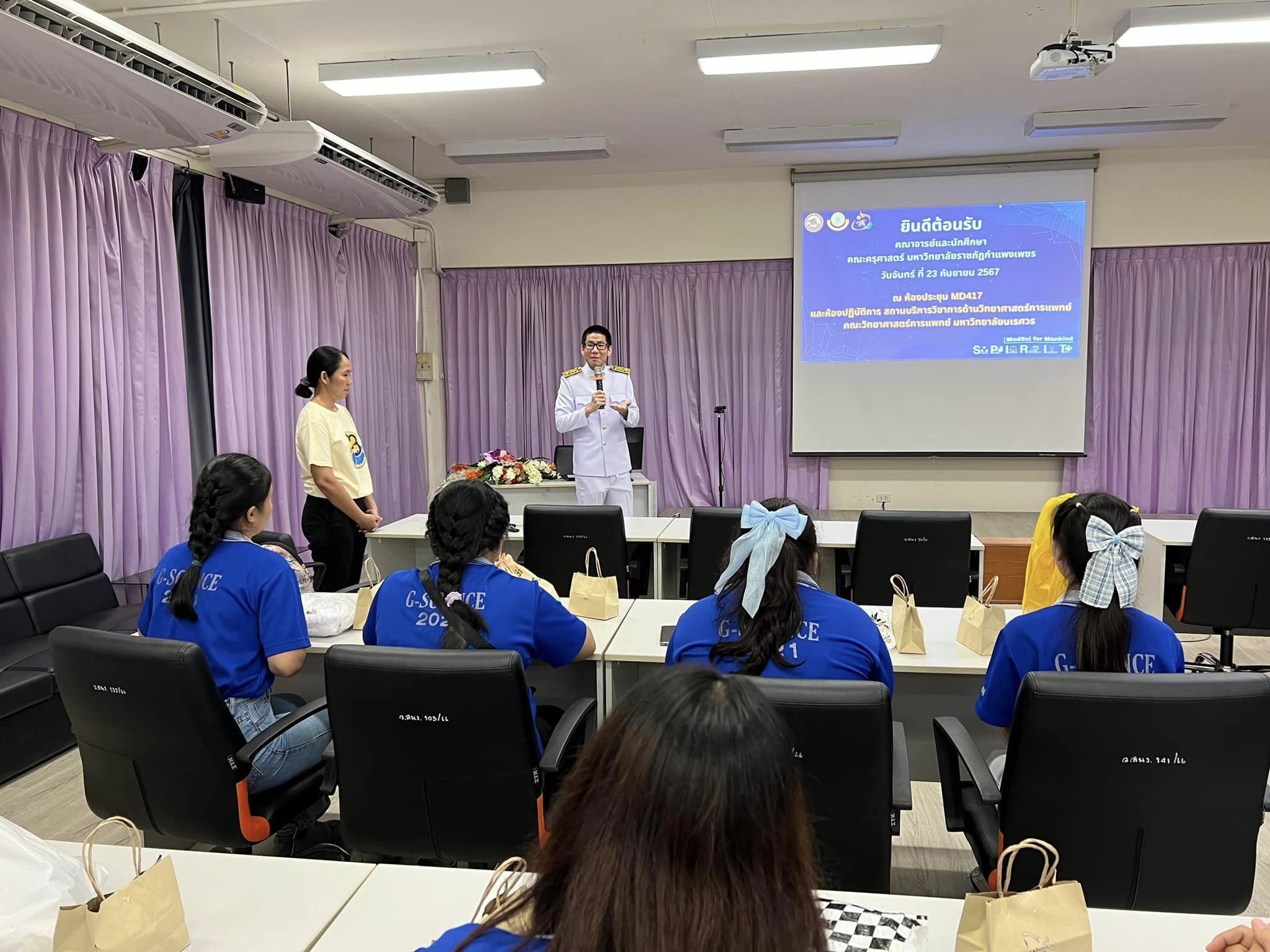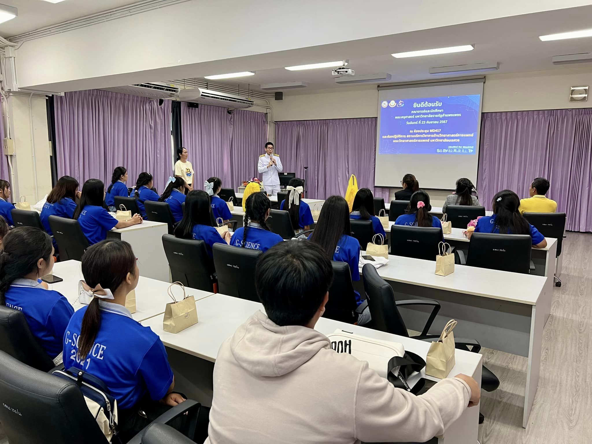 วันจันทร์ที่ 23 กันยายน 2567 ผู้ช่วยศาสตราจารย์ ดร.ภาคภูมิ ทรัพย์สุนทร รองคณบดีฝ่ายวิจัยและนวัตกรรม พร้อมด้วยบุคลากรสถานบริการวิชาการด้านวิทยาศาสตร์การแพทย์ ร่วมต้อนรับ คณาจารย์และนักศึกษาจากคณะครุศาสตร์ มหาวิทยาลัยราชภัฎกำแพงเพชร จังหวัดกำแพงเพชร ในโอกาสเข้าศึกษาดูงาน “ระบบการจัดการด้านความปลอดภัยในห้องปฏิบัติการที่เกี่ยวข้องกับสารเคมี ตามมาตรฐาน มอก.2677-2558 (ห้อง MD 513) และห้องปฏิบัติการความปลอดภัยทางชีวภาพระดับที่ 2 และระดับที่ 2 เสริมสมรรถนะ (ห้อง MD 502)” ณ ห้องประชุม MD 417 และห้องปฏิบัติการสถานบริการวิชาการด้านวิทยาศาสตร์การแพทย์ คณะวิทยาศาสตร์การแพทย์ มหาวิทยาลัยนเรศวร