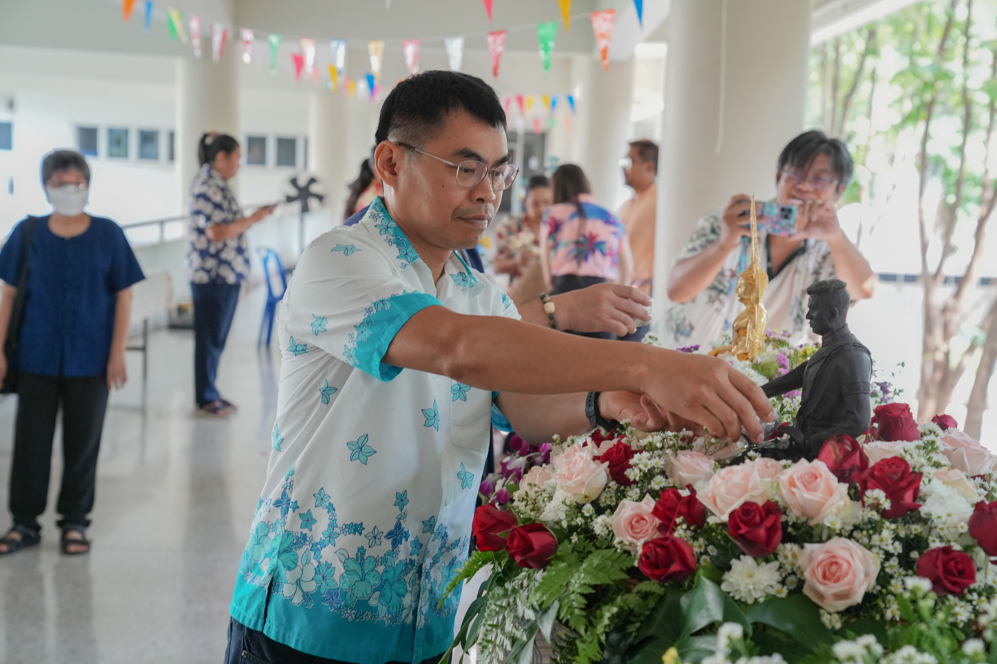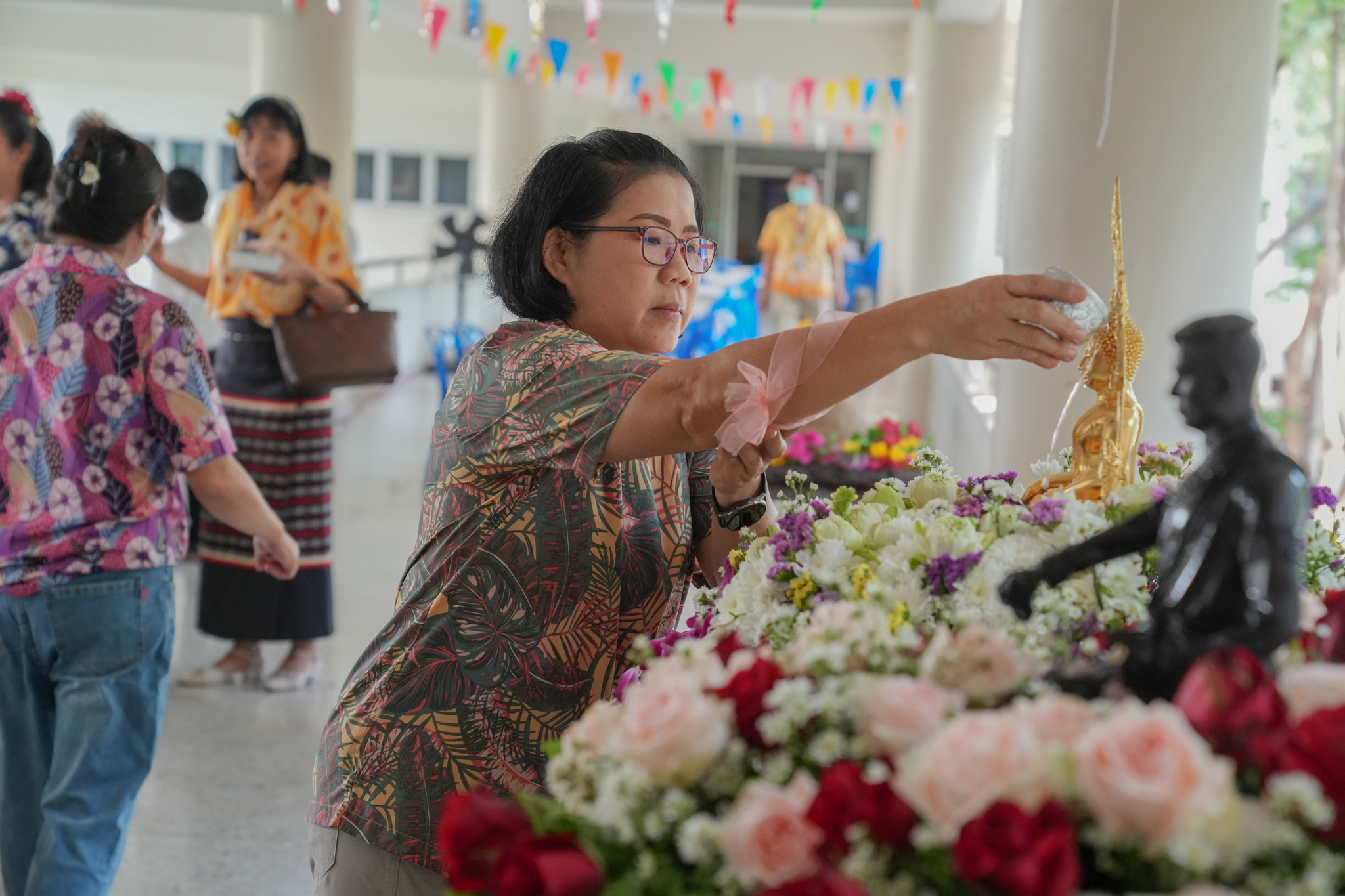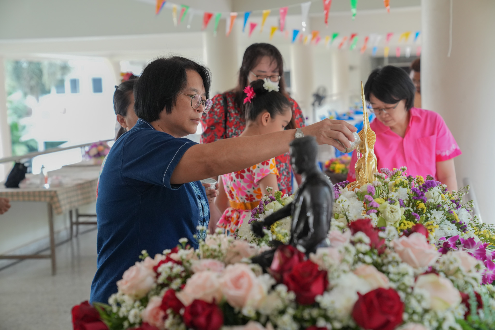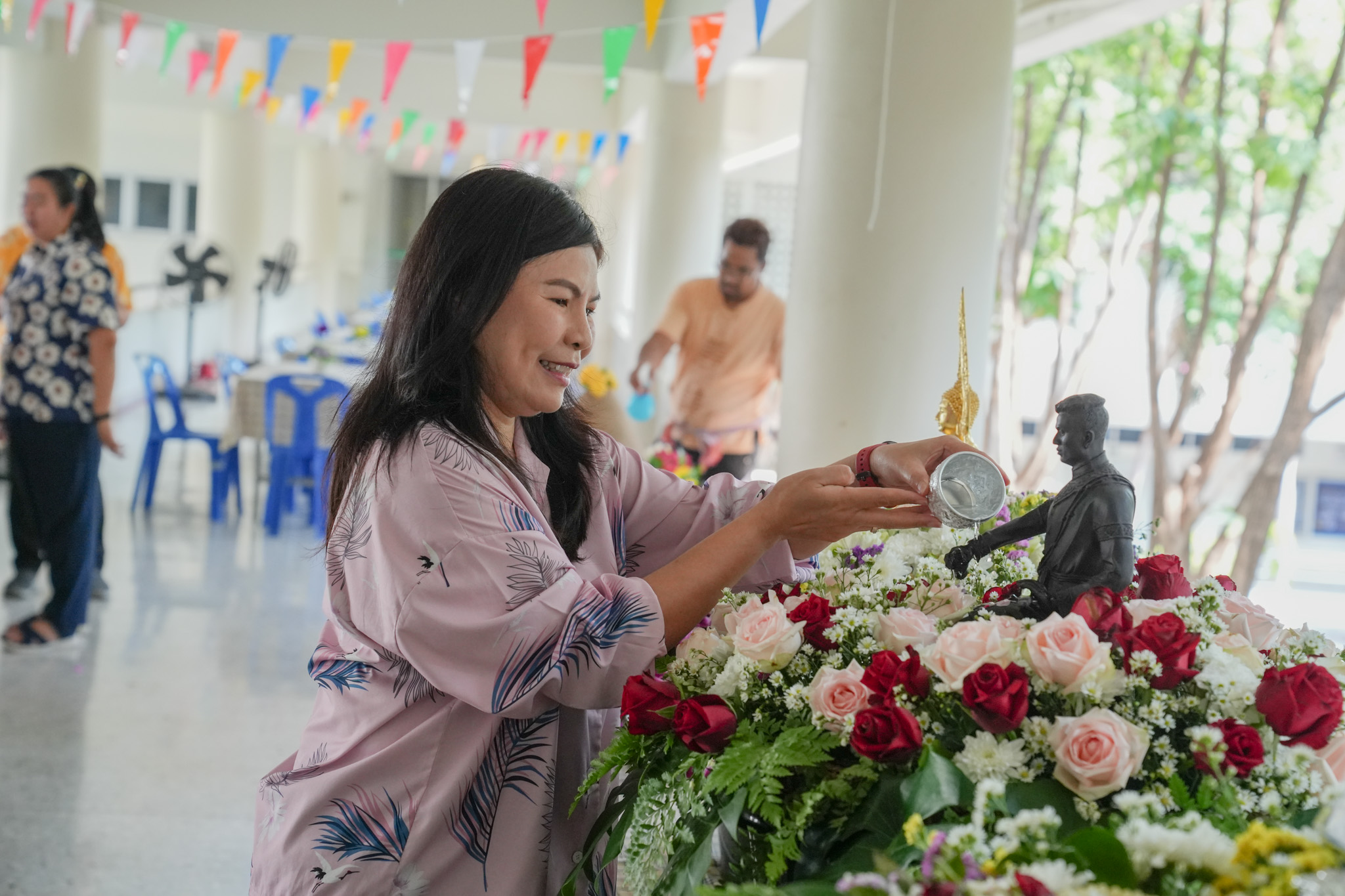 พิธีสรงน้ำพระพุทธรูป รูปหล่อสมเด็จพระนเรศวรมหาราช และรดน้ำพานดอกไม้เพื่อรำลึกถึงอาจารย์ผู้ล่วงลับ