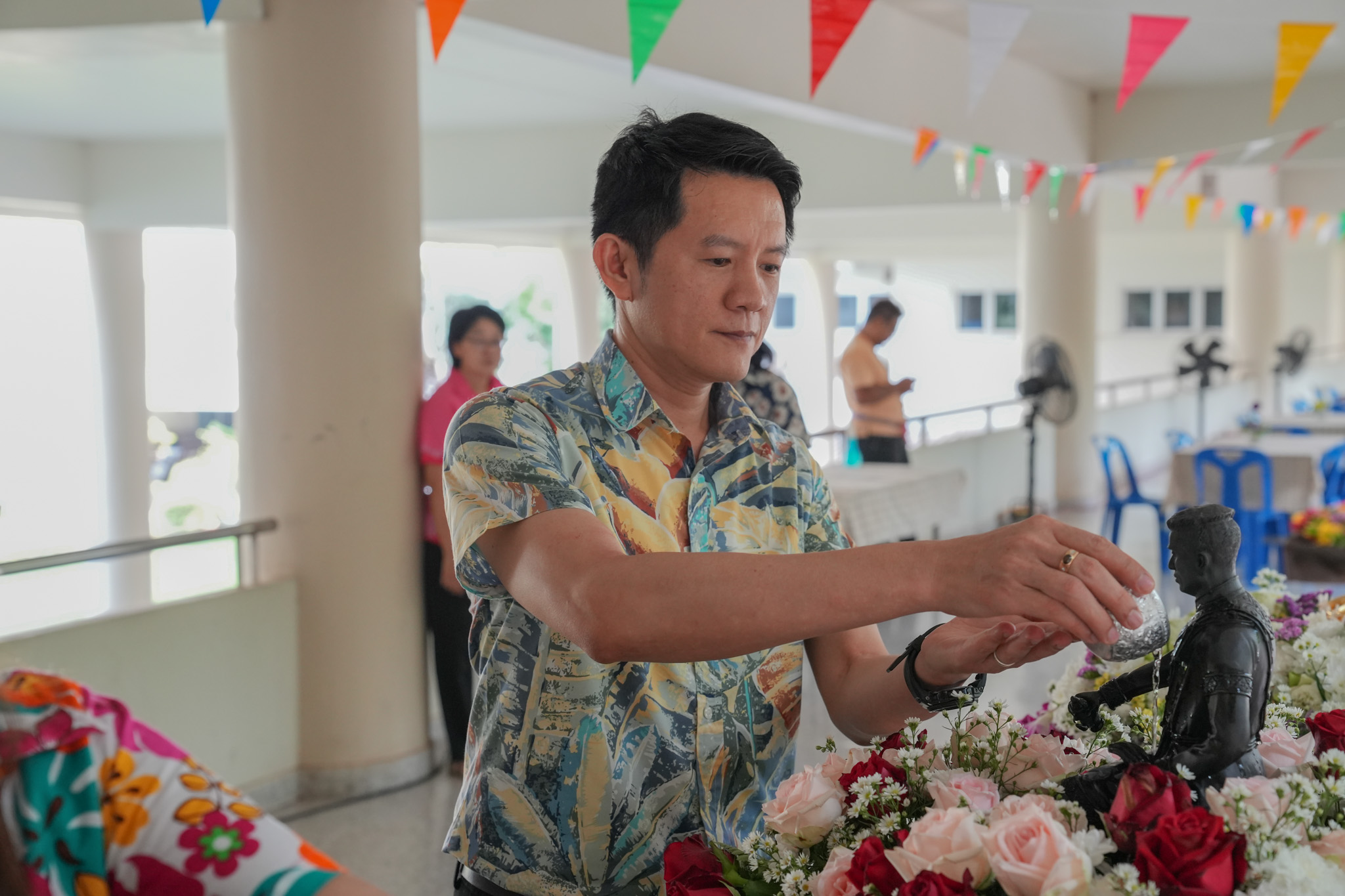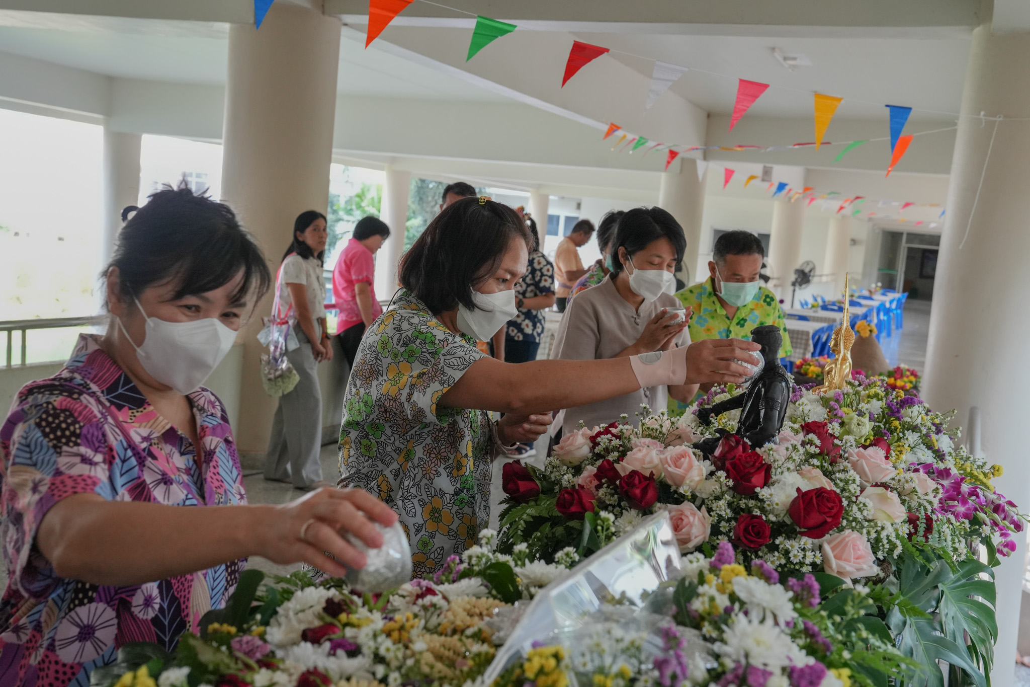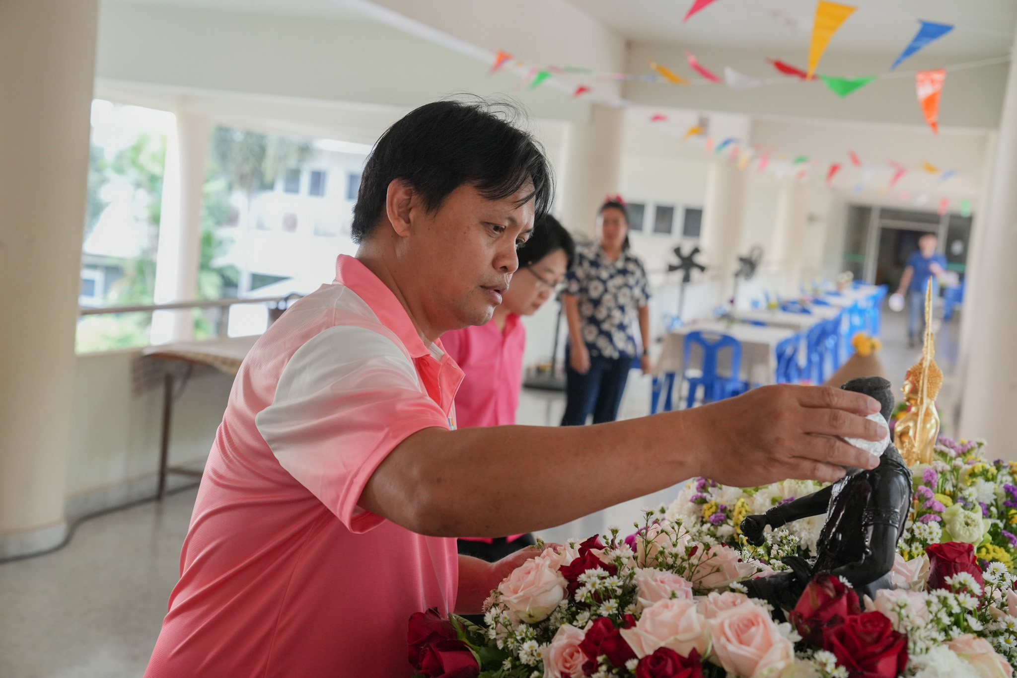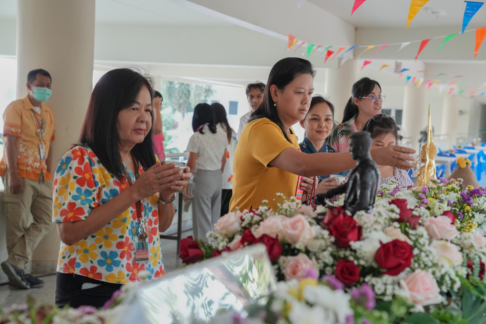 พิธีสรงน้ำพระพุทธรูป รูปหล่อสมเด็จพระนเรศวรมหาราช และรดน้ำพานดอกไม้เพื่อรำลึกถึงอาจารย์ผู้ล่วงลับ